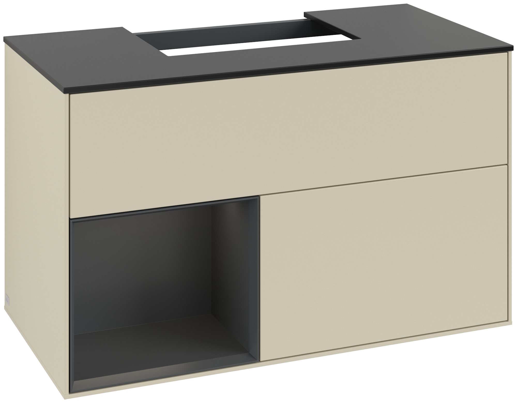 Finion Vanity unit, with lighting, 2 pull-out compartments, 1000x603x501mm, Body: Silk Grey Matt Lacquer, Front: Silk Grey Matt Lacquer, Shelf: Silk Grey Matt Lacquer, Cover plate: Glass Black Matt