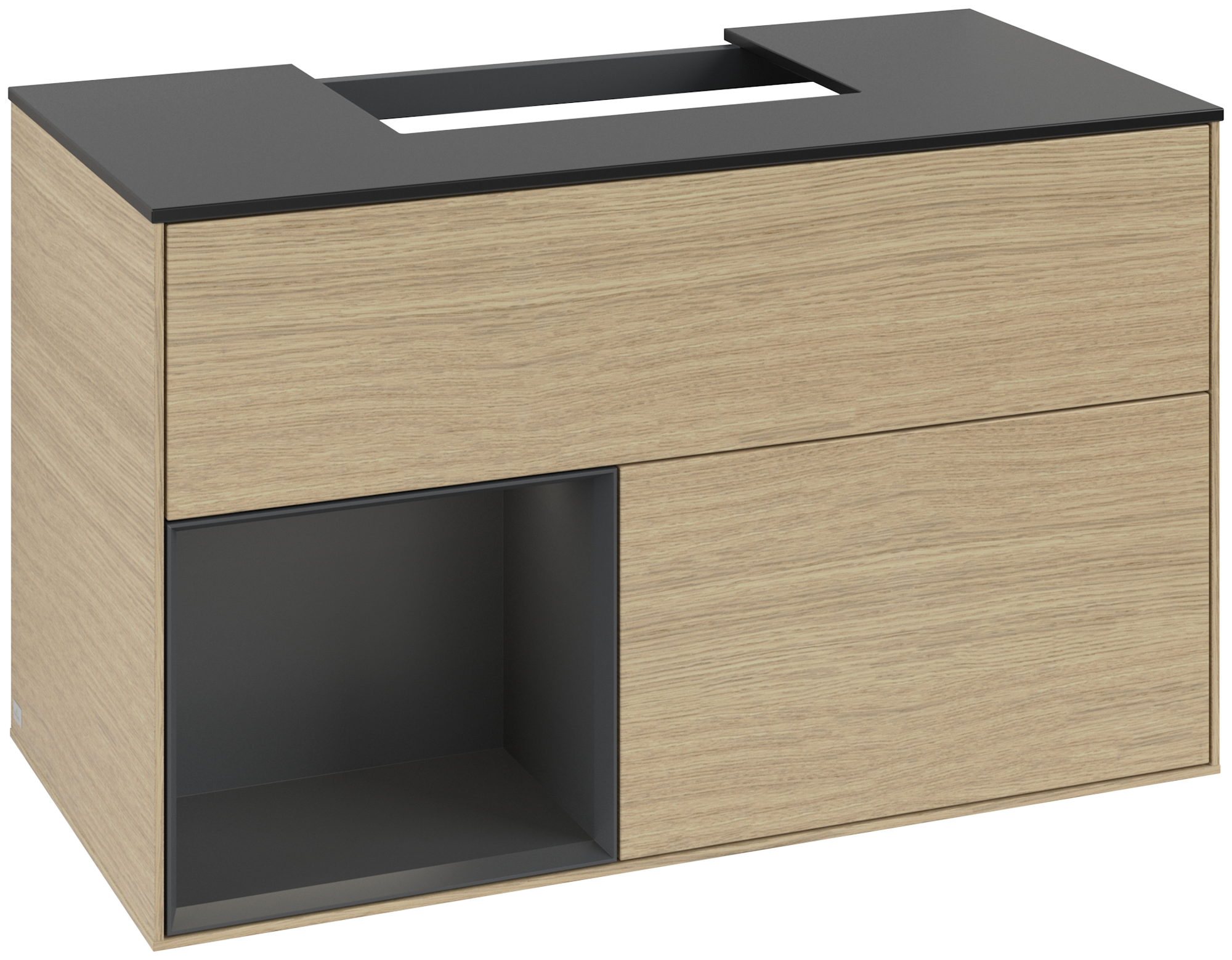 Finion Vanity unit, with lighting, 2 pull-out compartments, 1000x603x501mm, Body: Oak Veneer, Front: Oak Veneer, Shelf: Silk Grey Matt Lacquer, Cover plate: Glass Black Matt