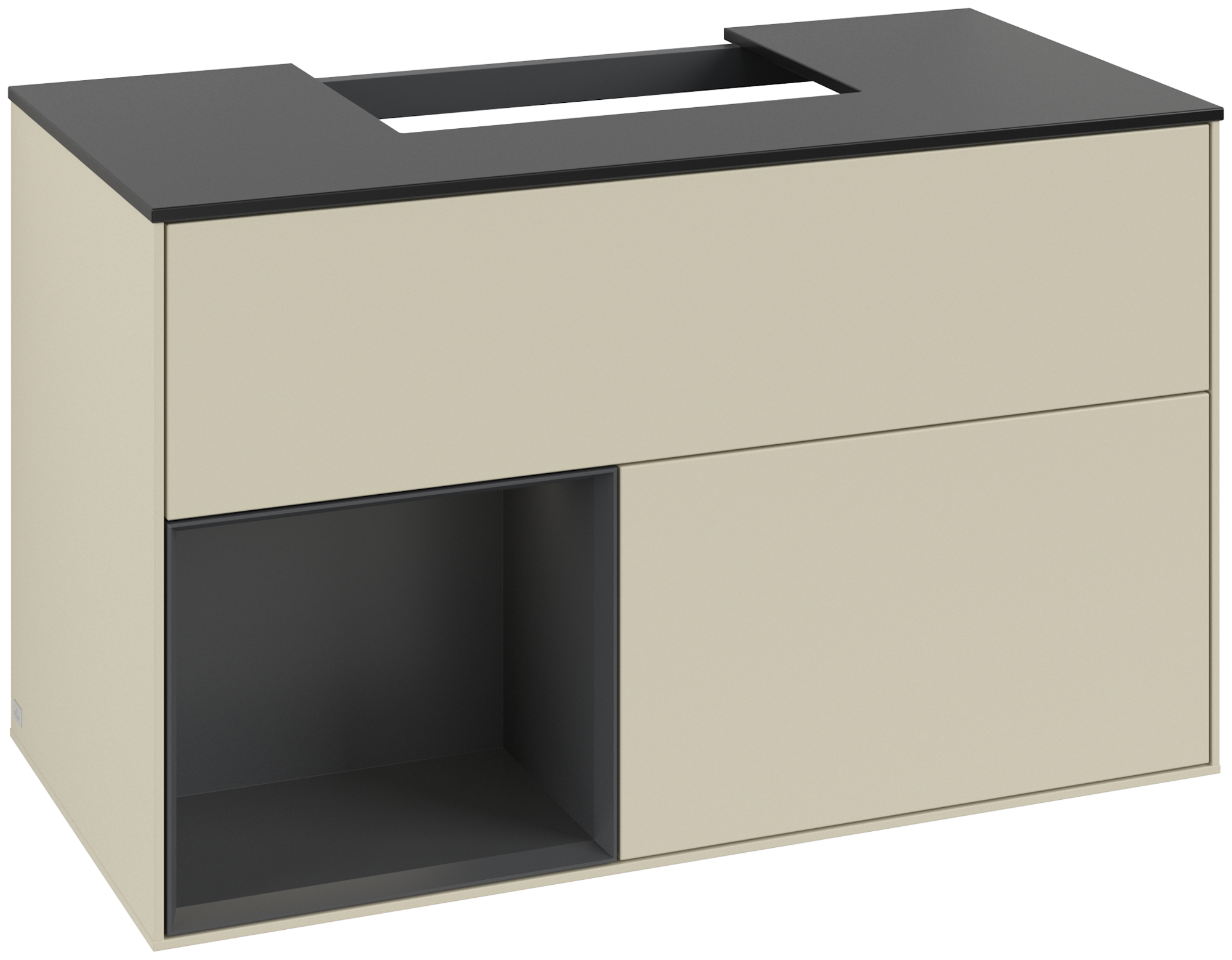 Finion Vanity unit, with lighting, 2 pull-out compartments, 1000x603x501mm, Body: Silk Grey Matt Lacquer, Front: Silk Grey Matt Lacquer, Shelf: White Matt Lacquer, Cover plate: Glass Black Matt