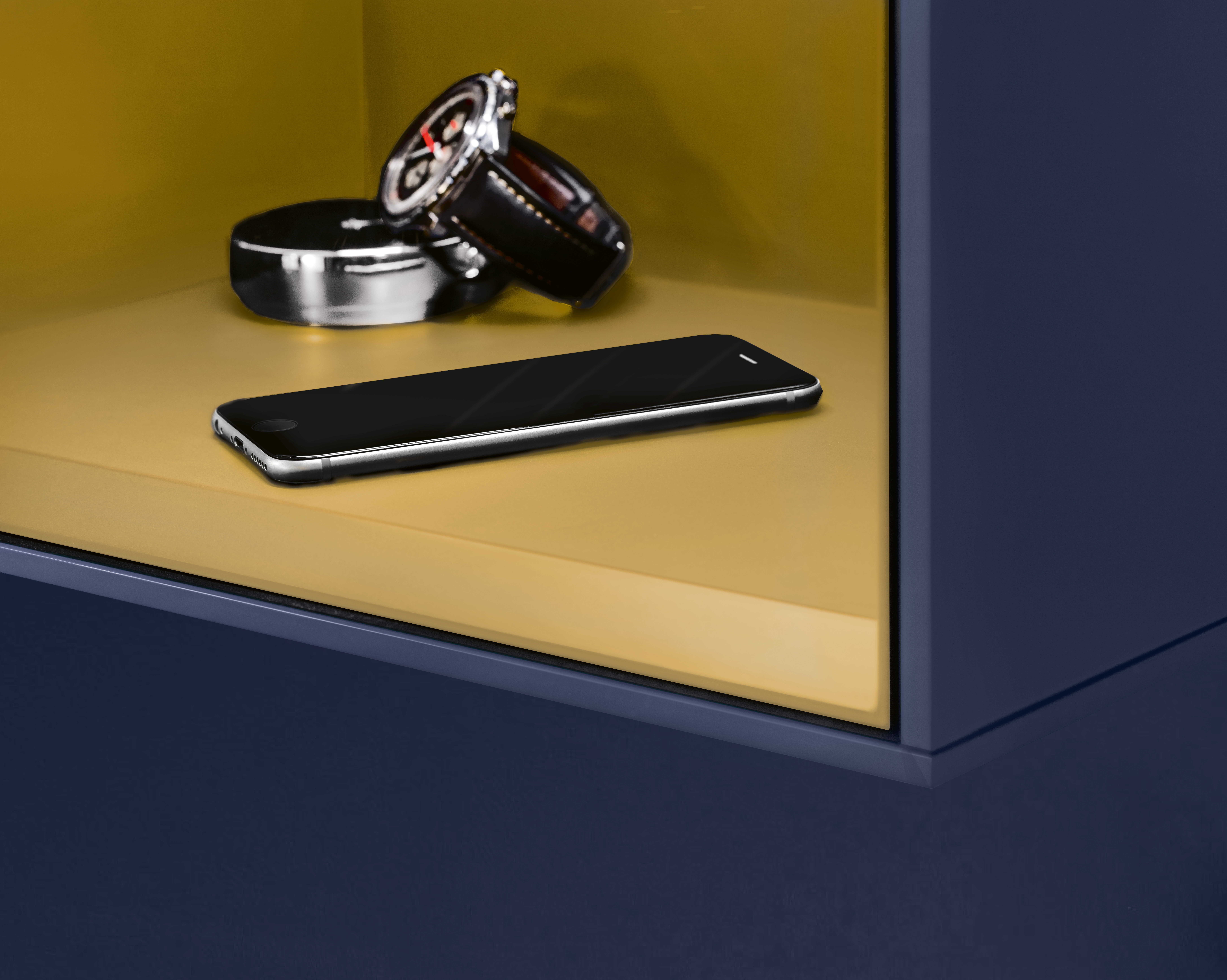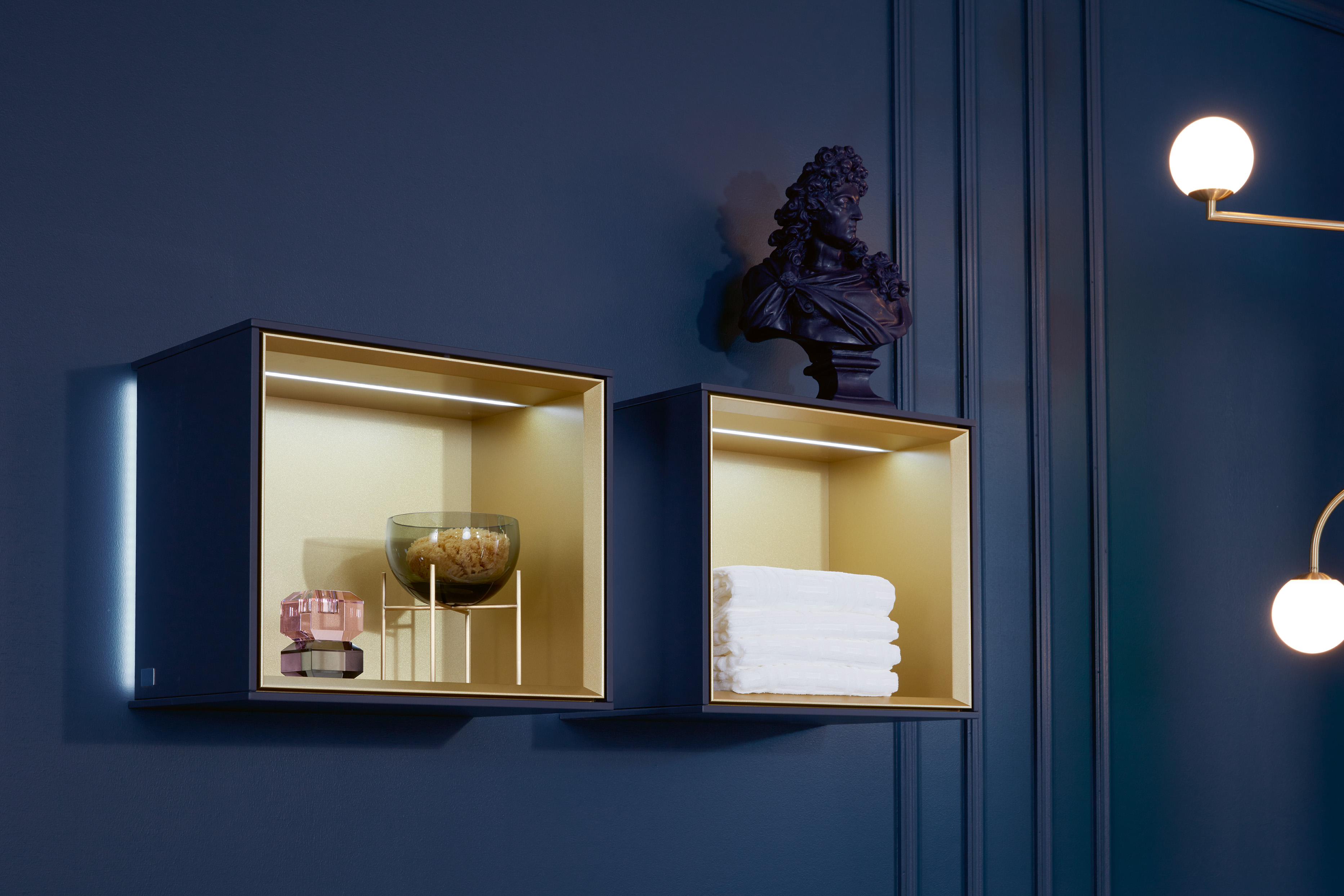 Finion Półka, z oświetleniem, 418x358x270mm, Korpus: Midnight Blue Matt Lacquer, Front: Midnight Blue Matt Lacquer, Element regałowy: Gold Matt Lacquer