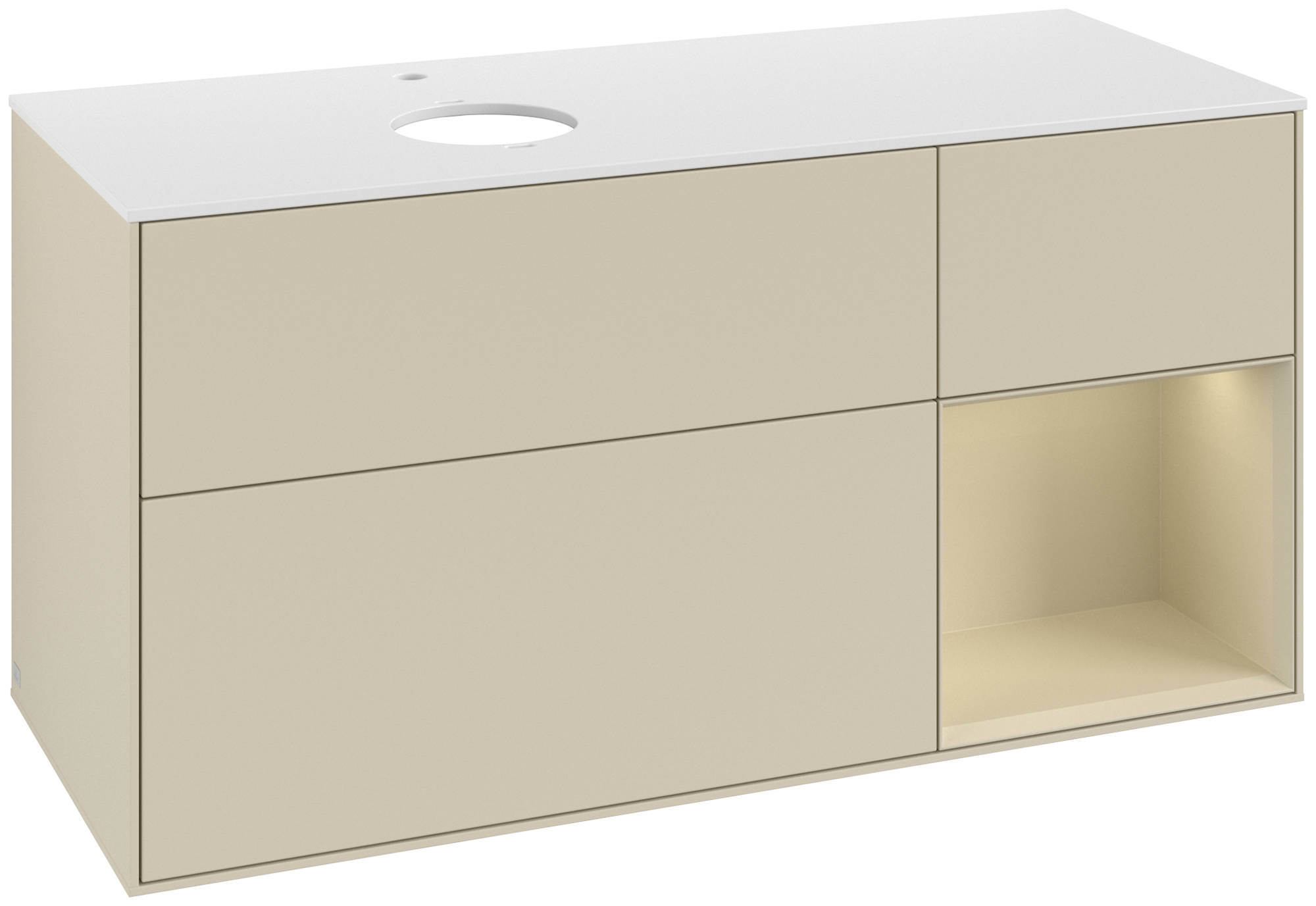 Finion Szafka podumywalkowa, z oświetleniem, 3 elementy wysuwane, 1200x603x501mm, Korpus: Silk Grey Matt Lacquer, Front: Silk Grey Matt Lacquer, Element regałowy: Silk Grey Matt Lacquer, Blat: Glass White Matt