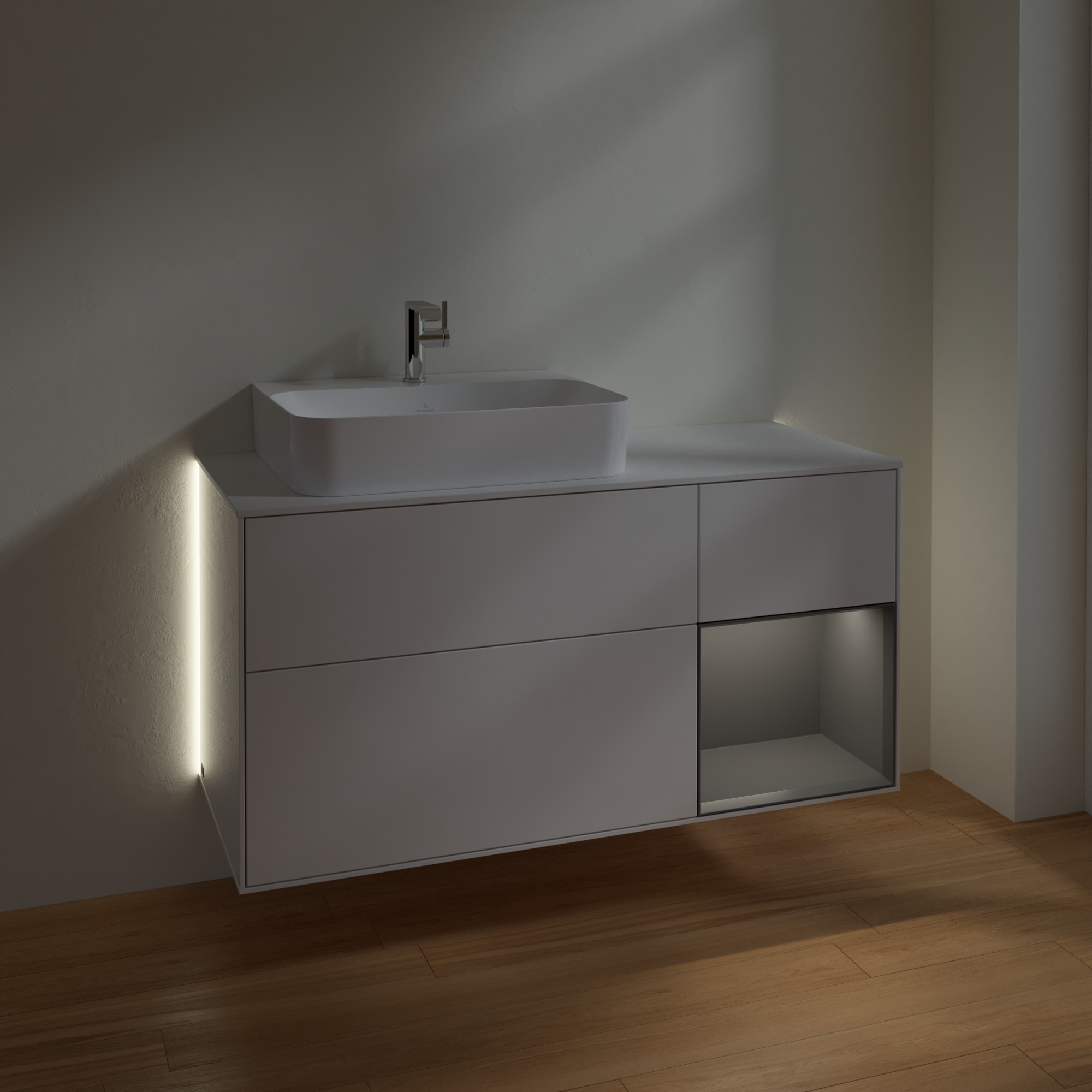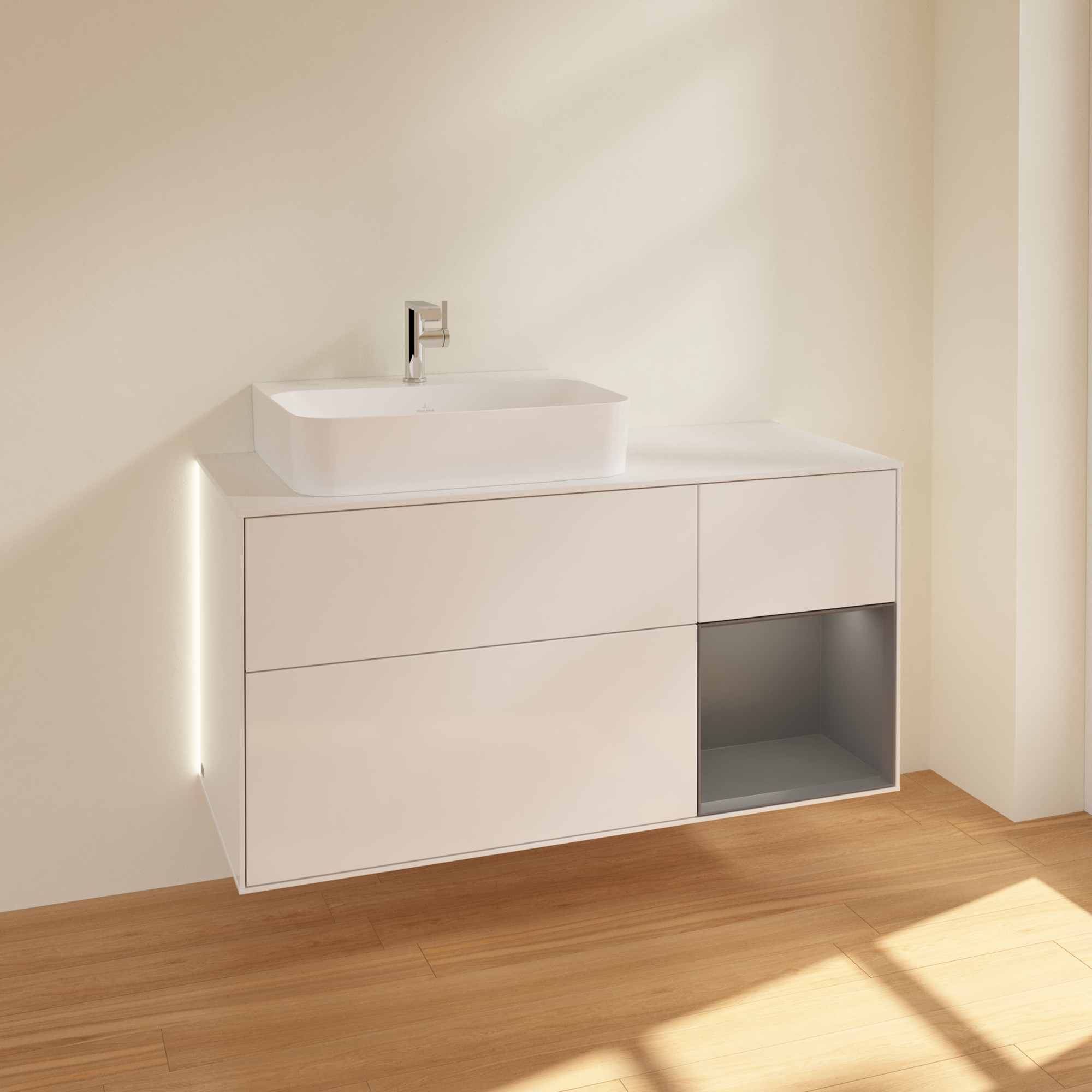 Finion Szafka podumywalkowa, z oświetleniem, 3 elementy wysuwane, 1200x603x501mm, Korpus: Glossy White Lacquer, Front: Glossy White Lacquer, Element regałowy: Anthracite Matt Lacquer, Blat: Glass White Matt