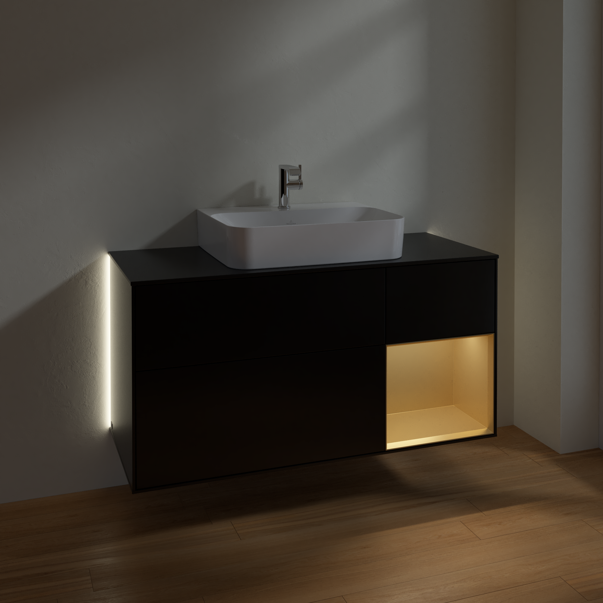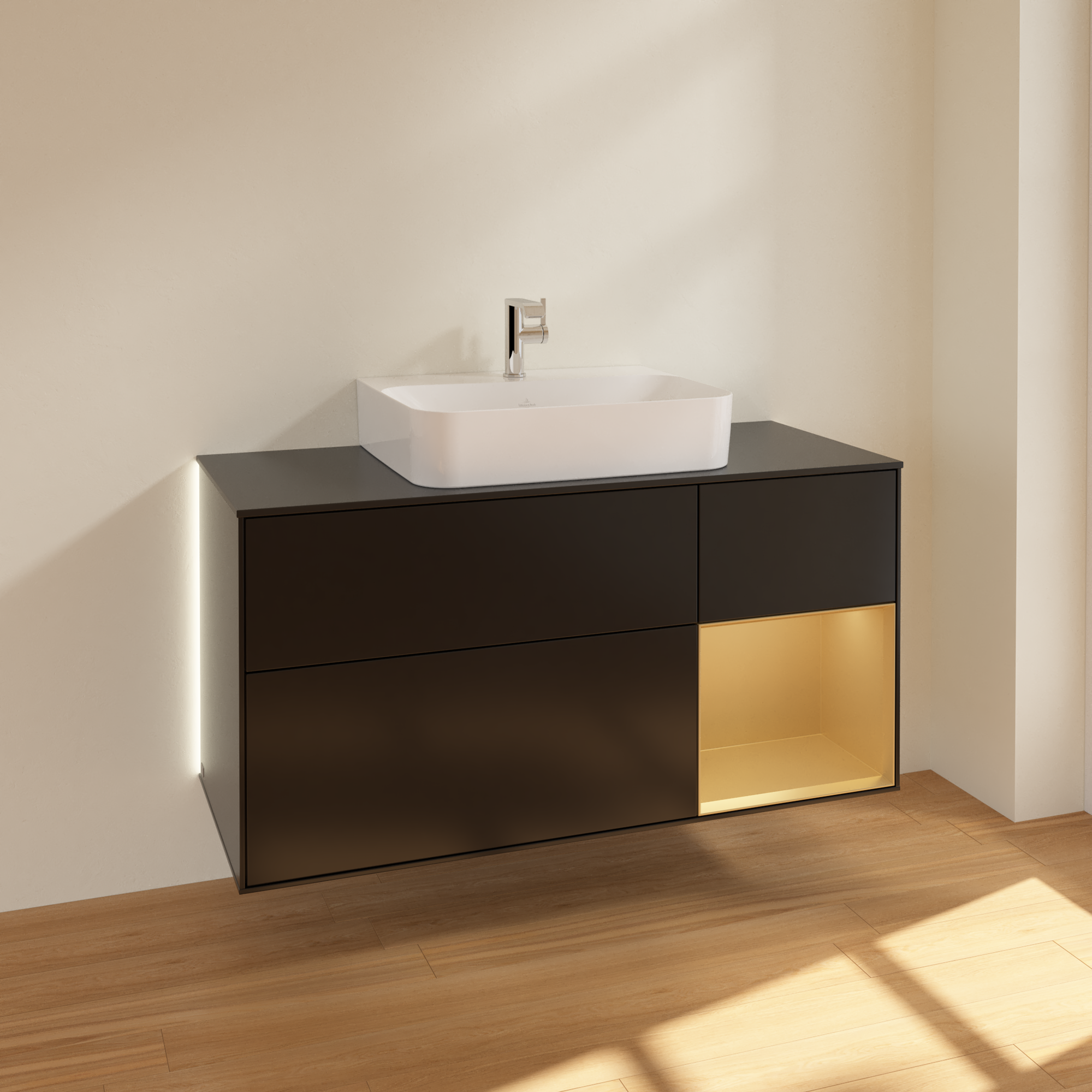 Finion Szafka podumywalkowa, z oświetleniem, 3 elementy wysuwane, 1200x603x501mm, Korpus: Black Matt Lacquer, Front: Black Matt Lacquer, Element regałowy: Gold Matt Lacquer, Blat: Glass Black Matt