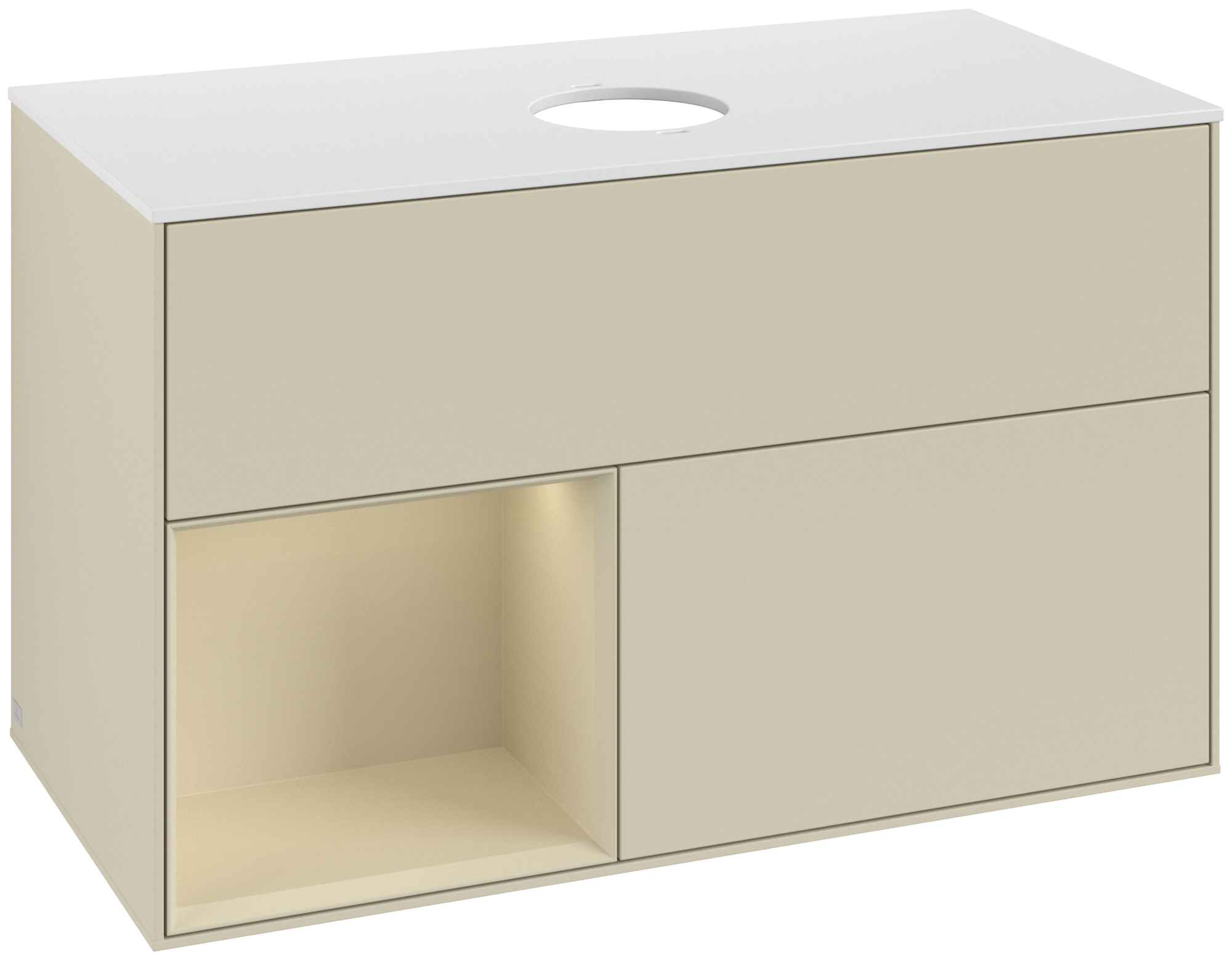 Finion Szafka podumywalkowa, z oświetleniem, 2 elementy wysuwane, 1000x603x501mm, Korpus: Silk Grey Matt Lacquer, Front: Silk Grey Matt Lacquer, Element regałowy: Silk Grey Matt Lacquer, Blat: Glass White Matt