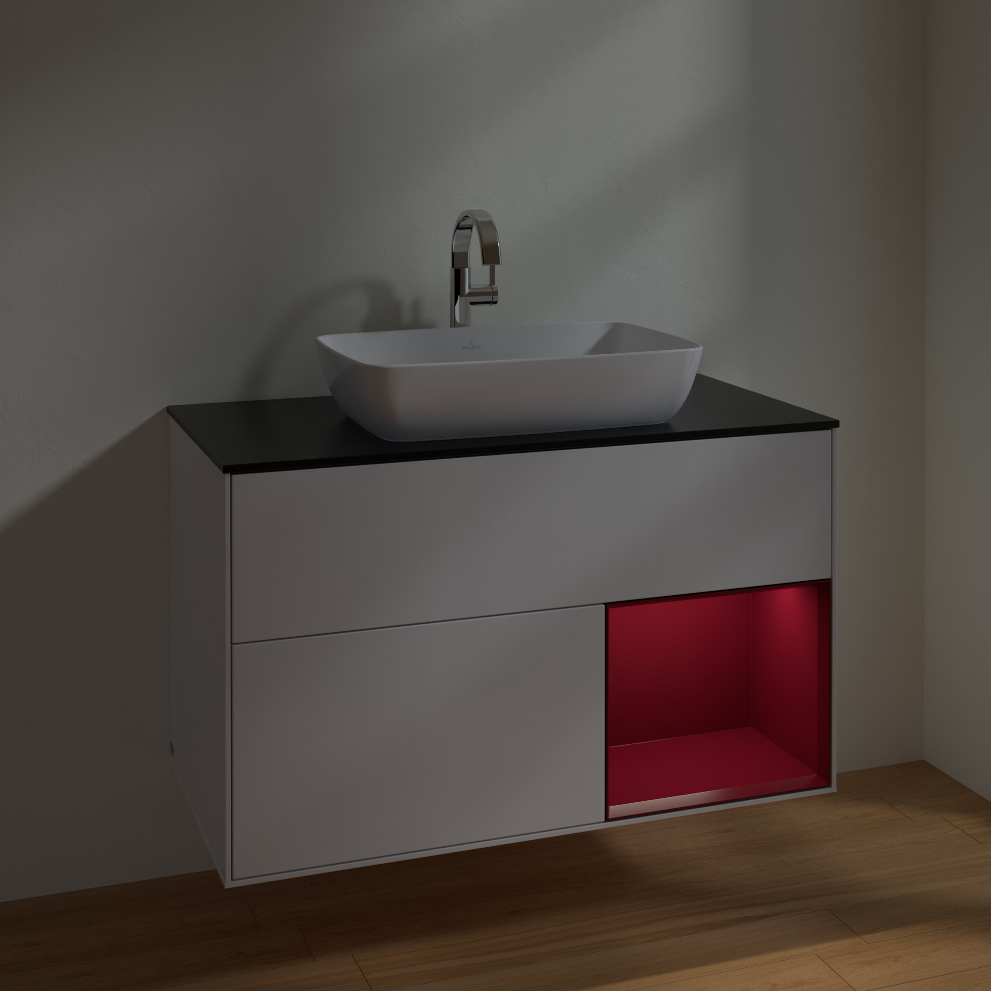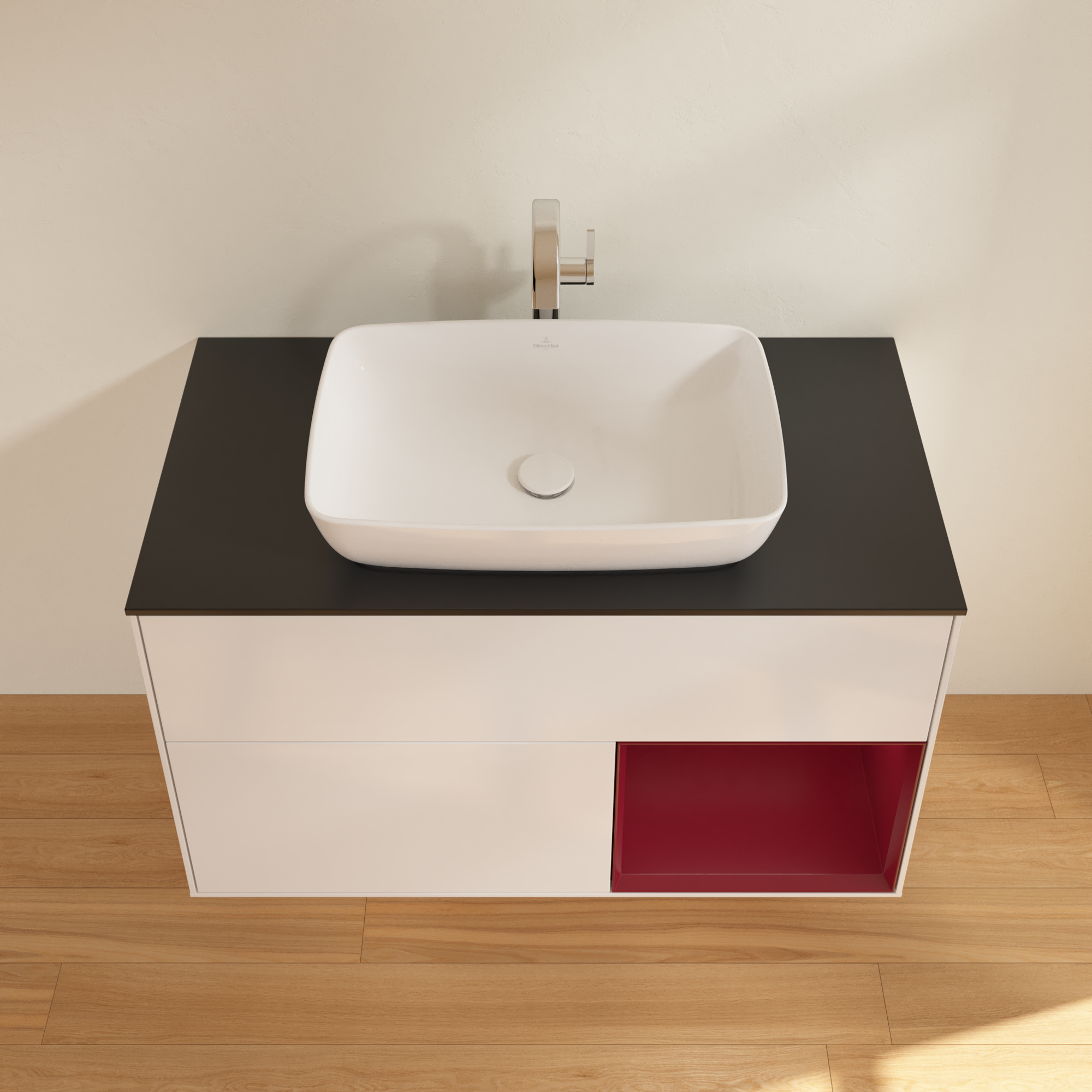 Finion Szafka podumywalkowa, z oświetleniem, 2 elementy wysuwane, 1000x603x501mm, Korpus: Glossy White Lacquer, Front: Glossy White Lacquer, Element regałowy: Peony Matt Lacquer, Blat: Glass Black Matt