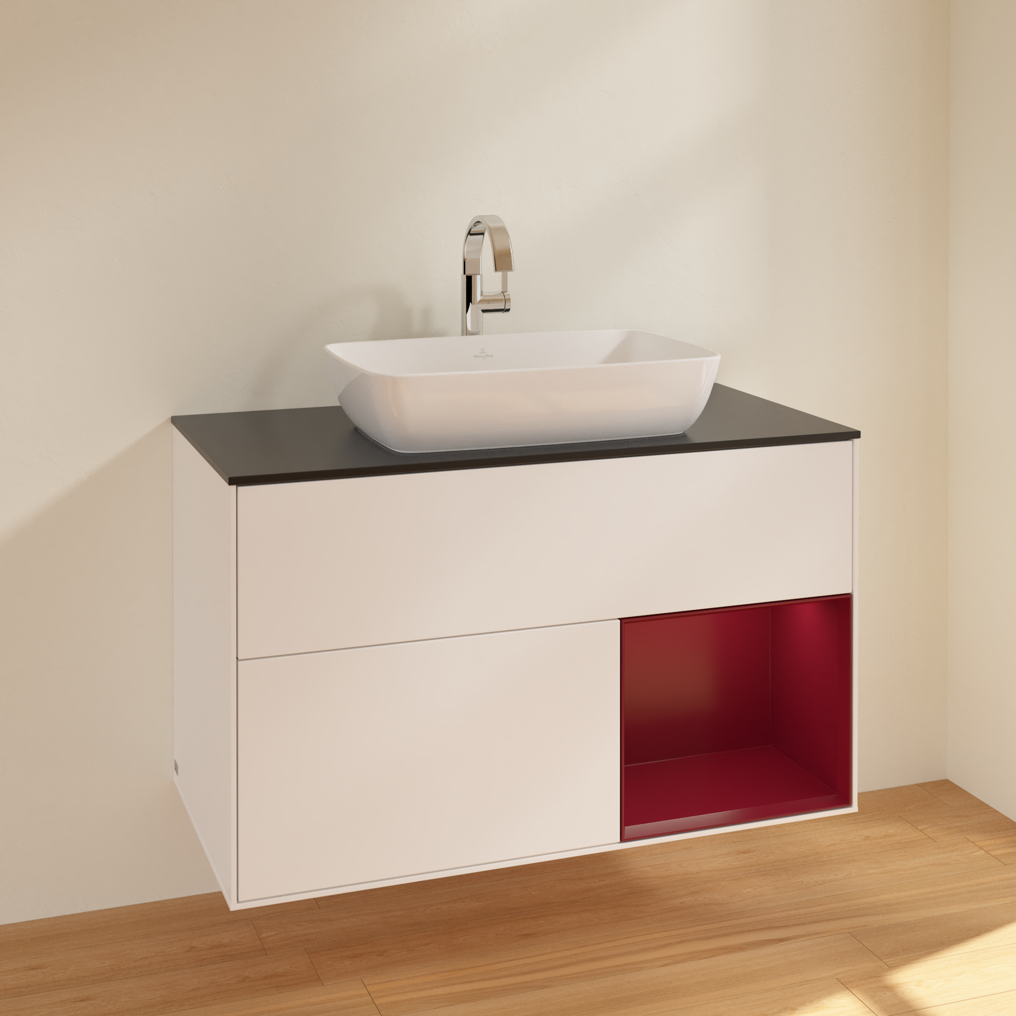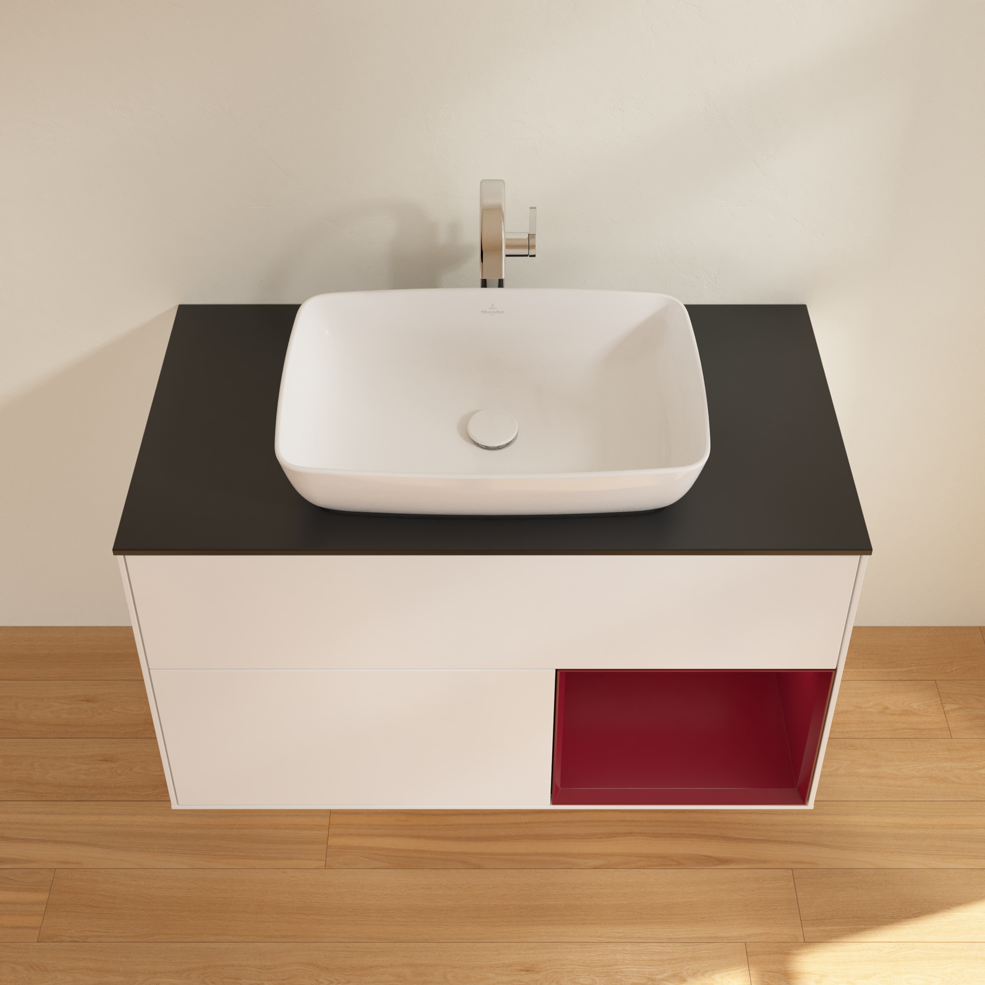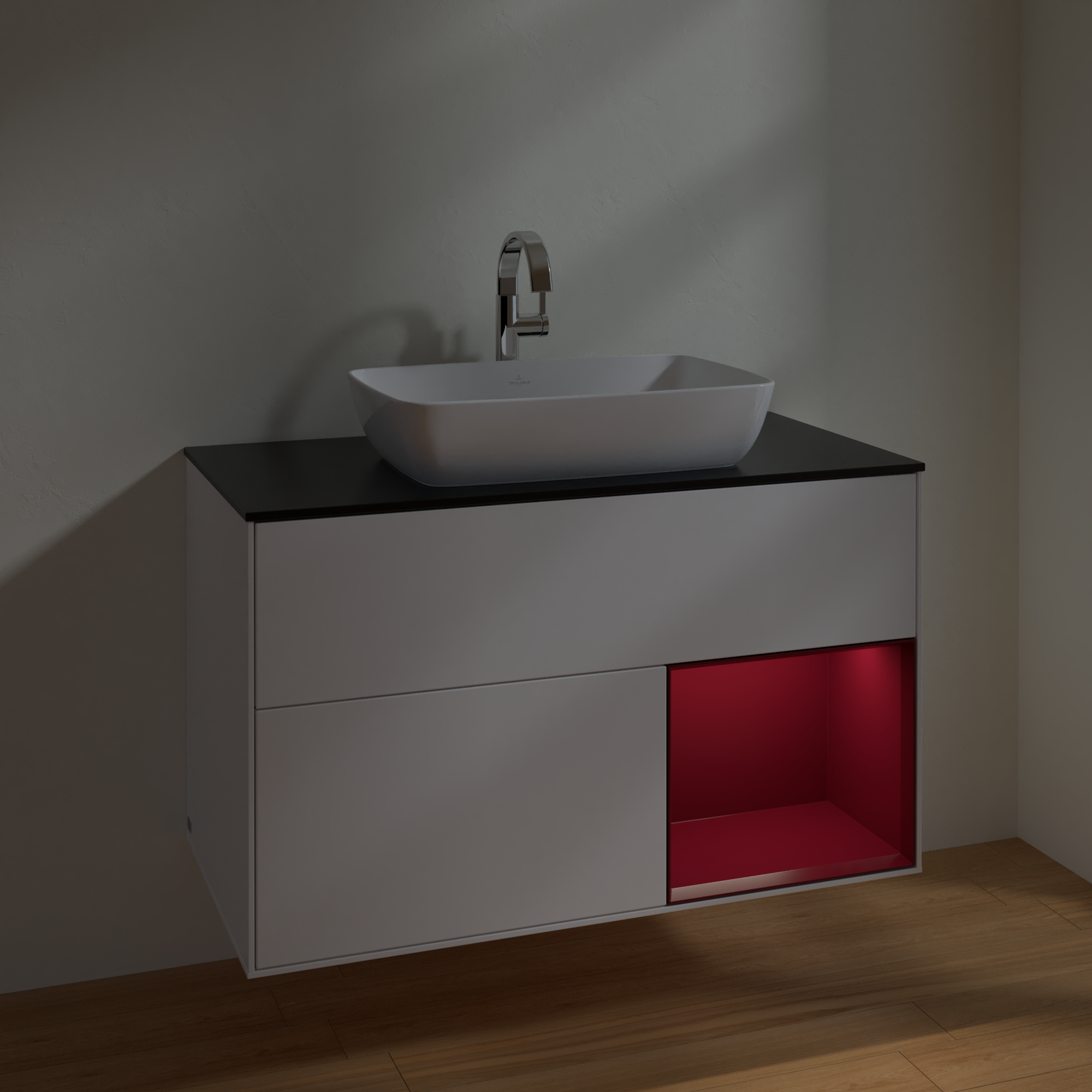 Finion Szafka podumywalkowa, z oświetleniem, 2 elementy wysuwane, 1000x603x501mm, Korpus: White Matt Lacquer, Front: White Matt Lacquer, Element regałowy: Peony Matt Lacquer, Blat: Glass Black Matt