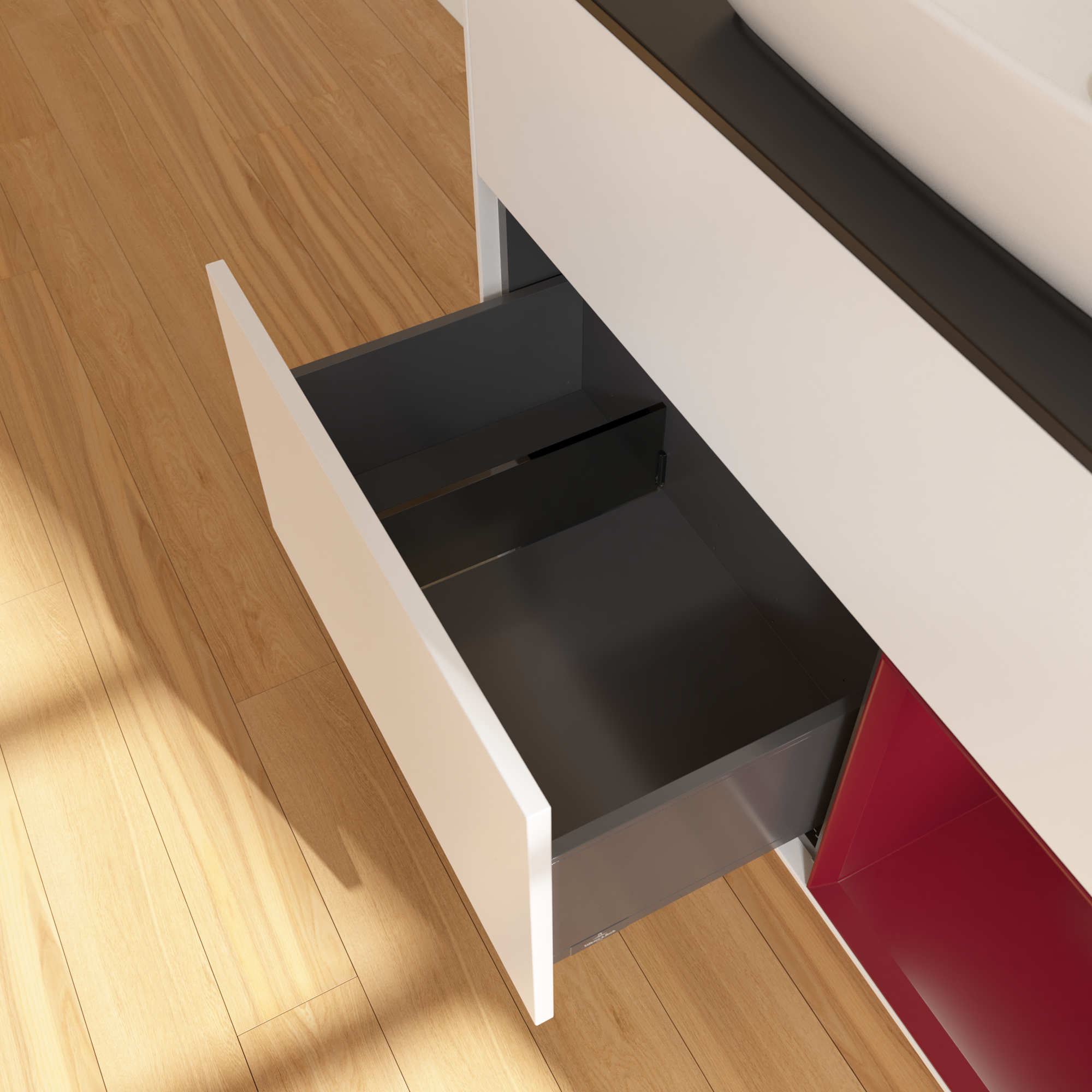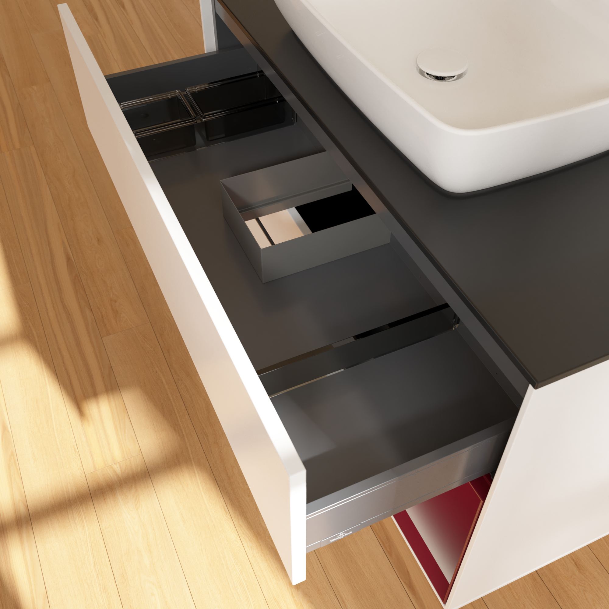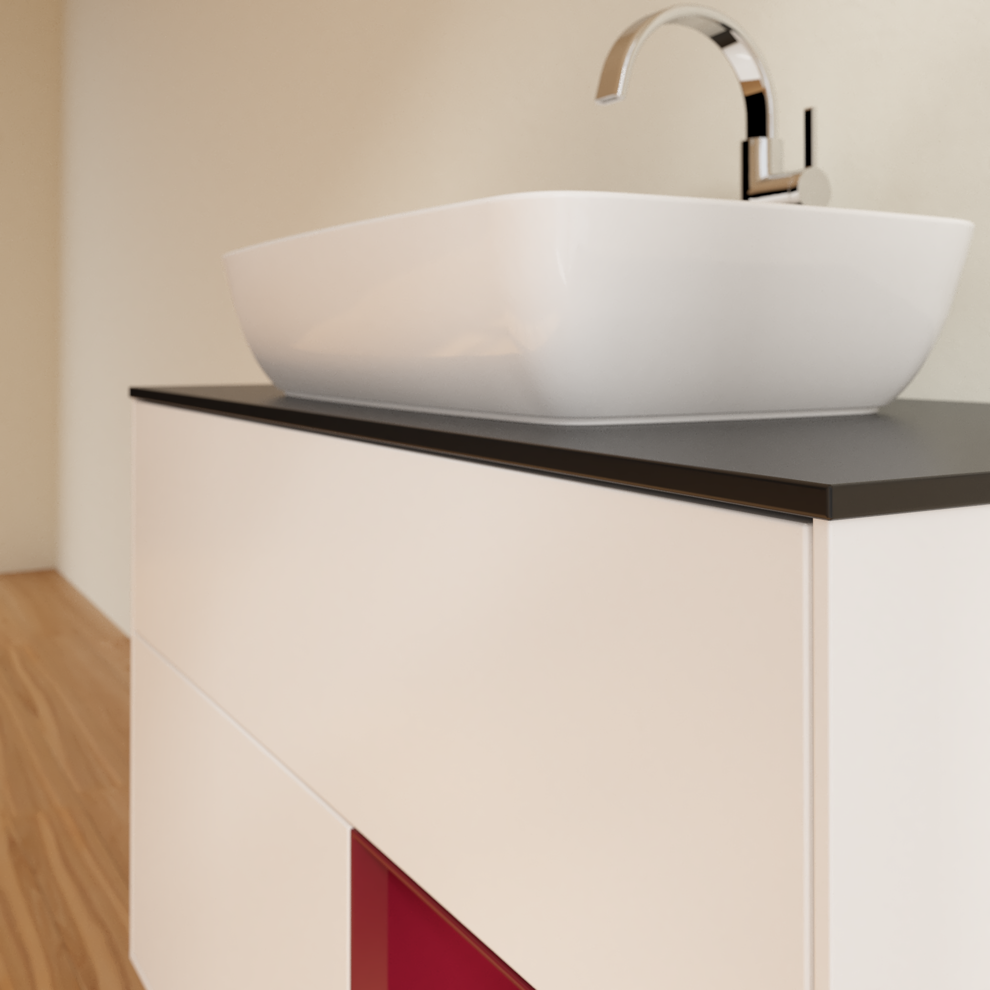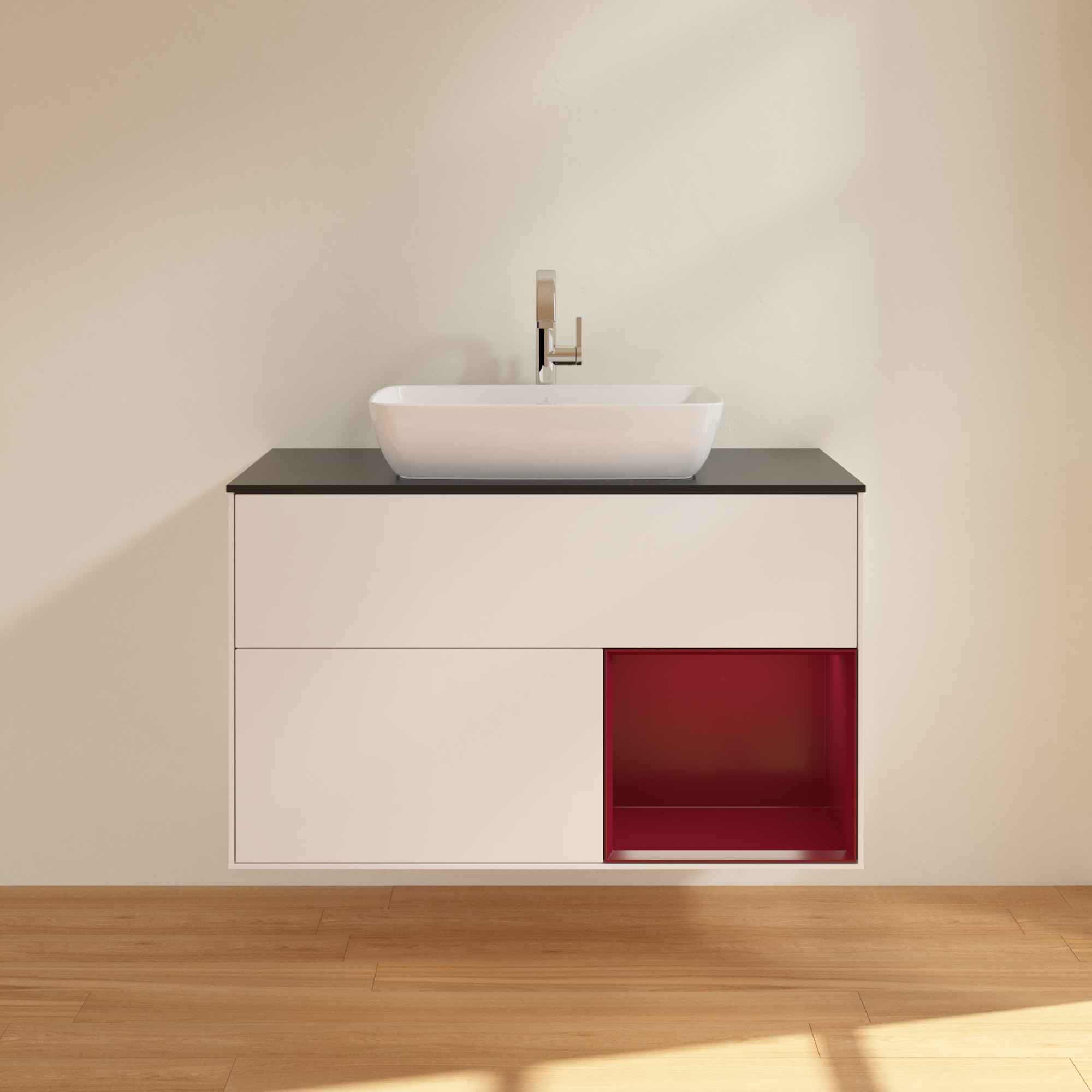 Finion Szafka podumywalkowa, z oświetleniem, 2 elementy wysuwane, 1000x603x501mm, Korpus: White Matt Lacquer, Front: White Matt Lacquer, Element regałowy: Peony Matt Lacquer, Blat: Glass Black Matt