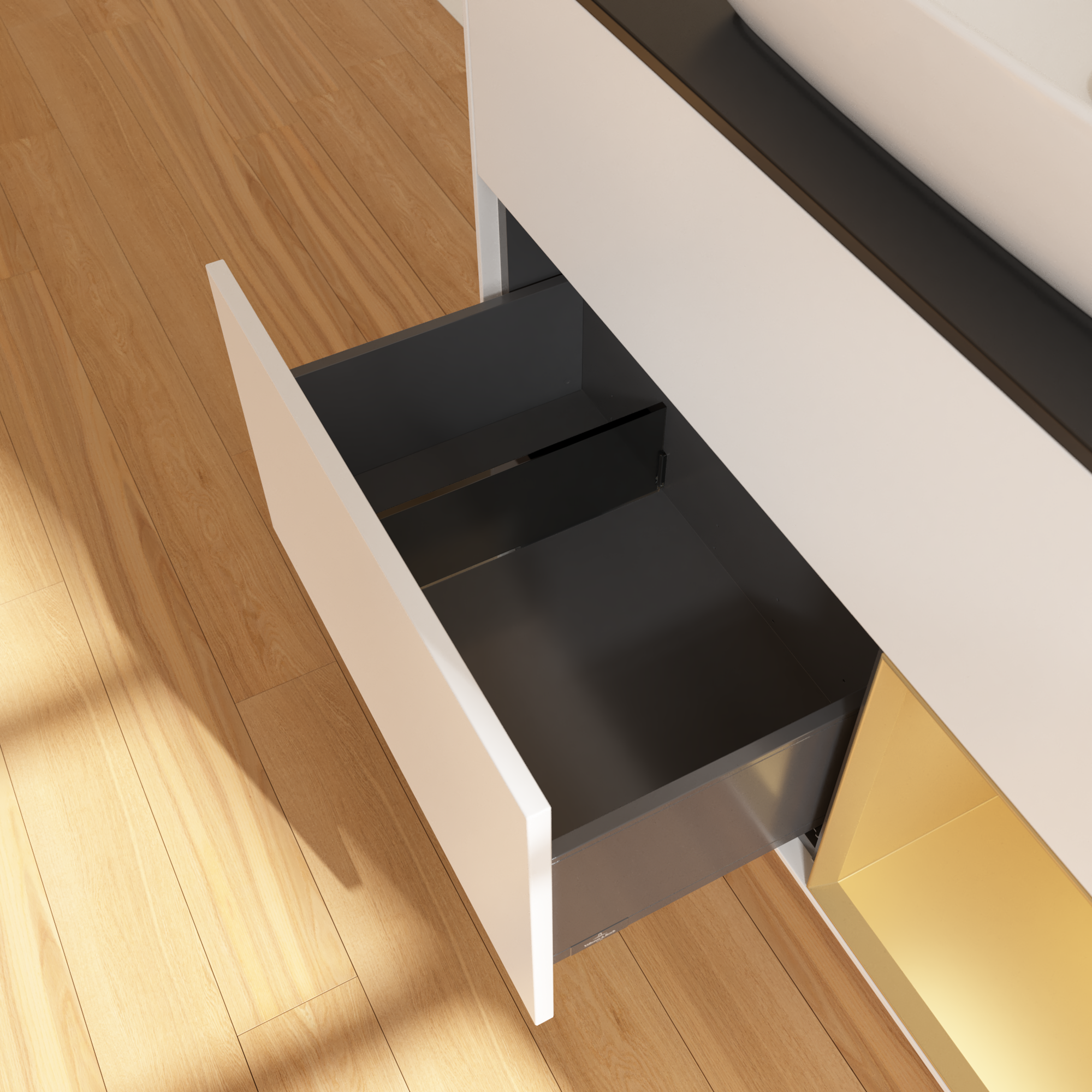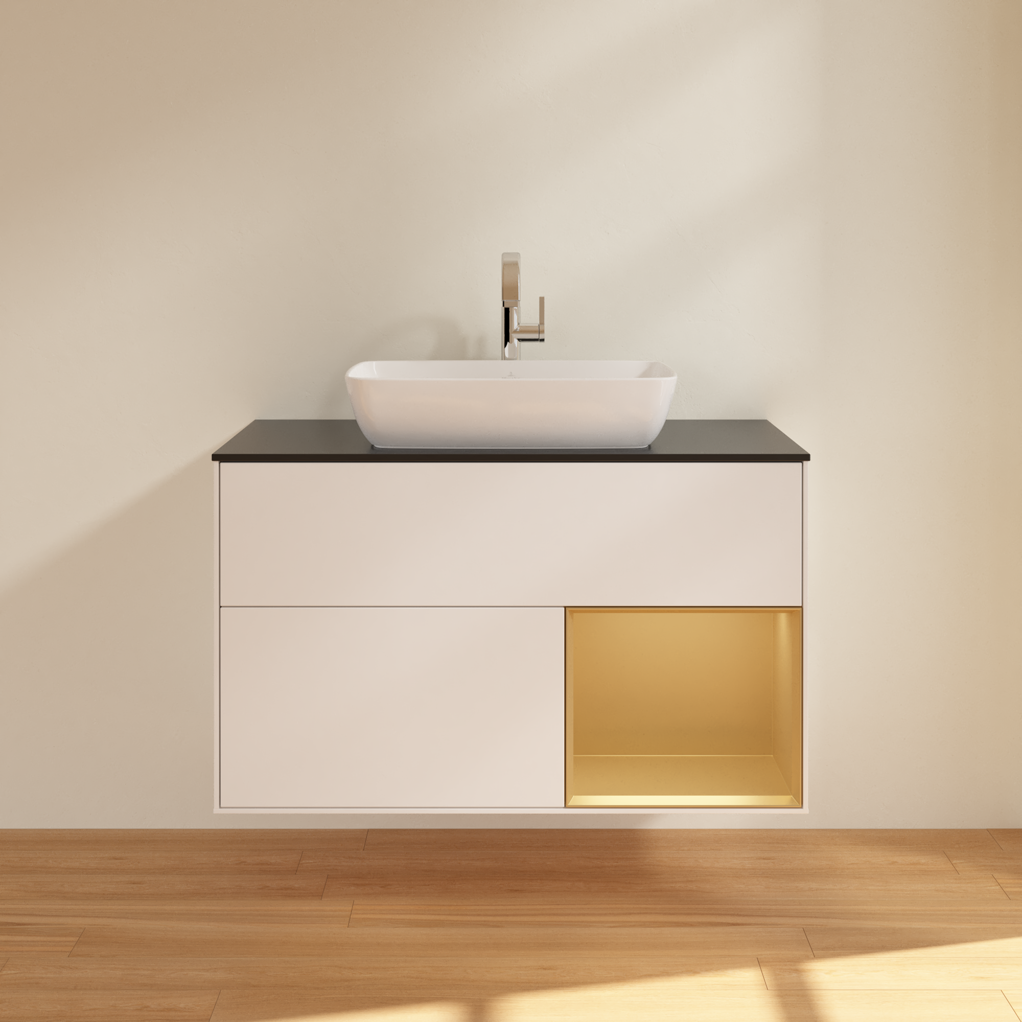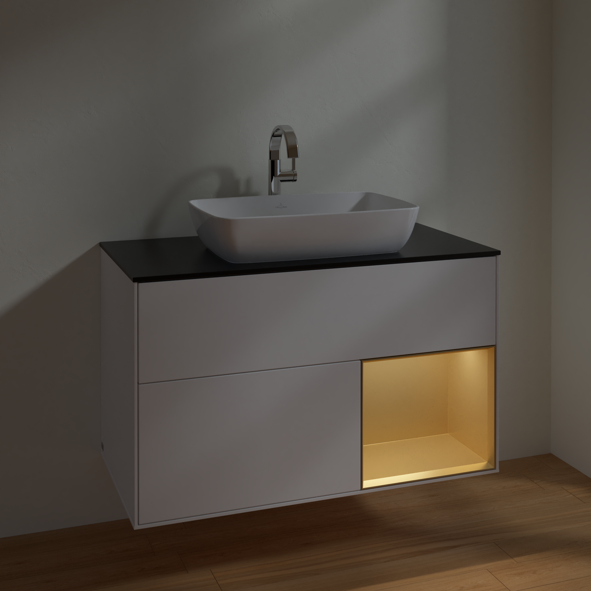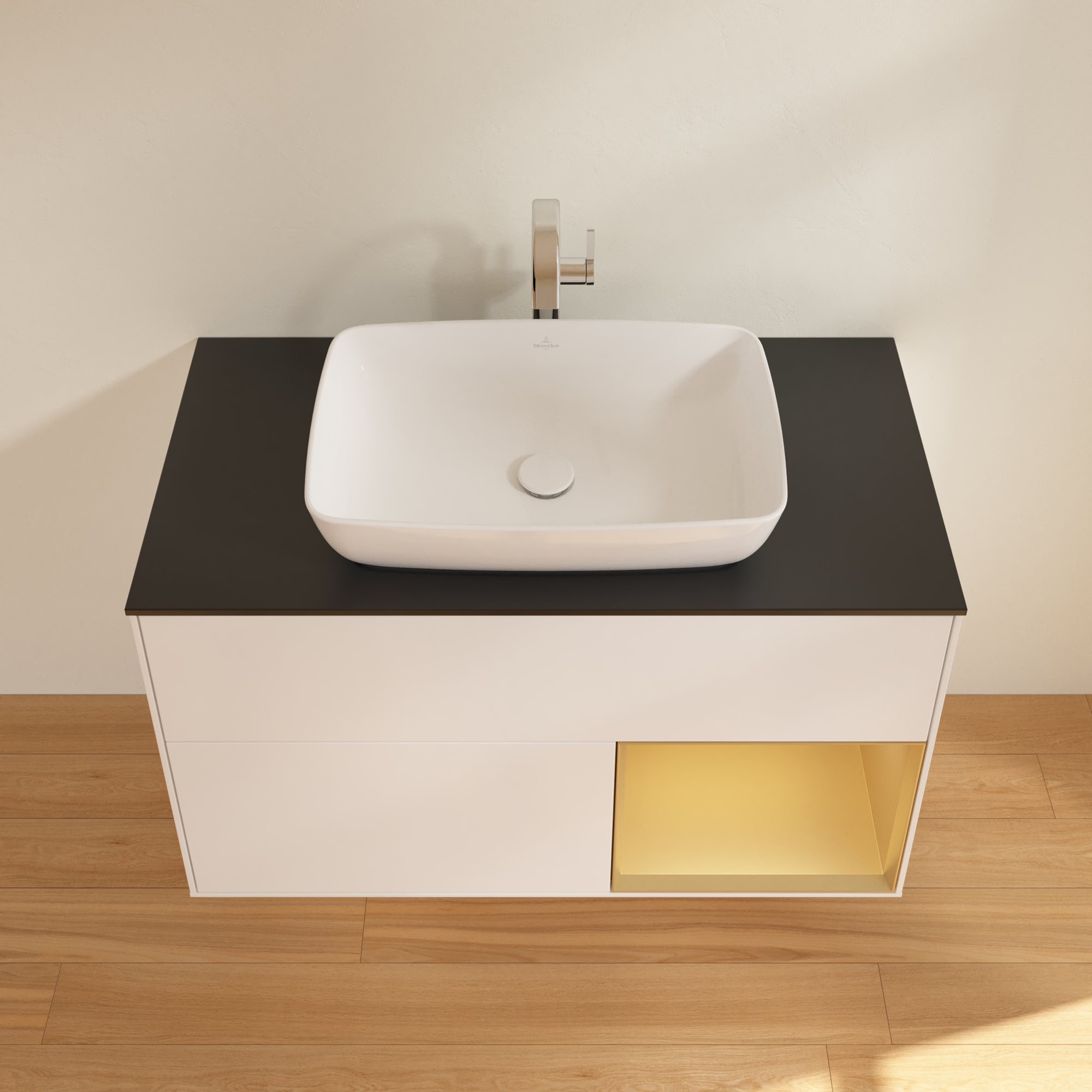 Finion Szafka podumywalkowa, z oświetleniem, 2 elementy wysuwane, 1000x603x501mm, Korpus: White Matt Lacquer, Front: White Matt Lacquer, Element regałowy: Gold Matt Lacquer, Blat: Glass Black Matt
