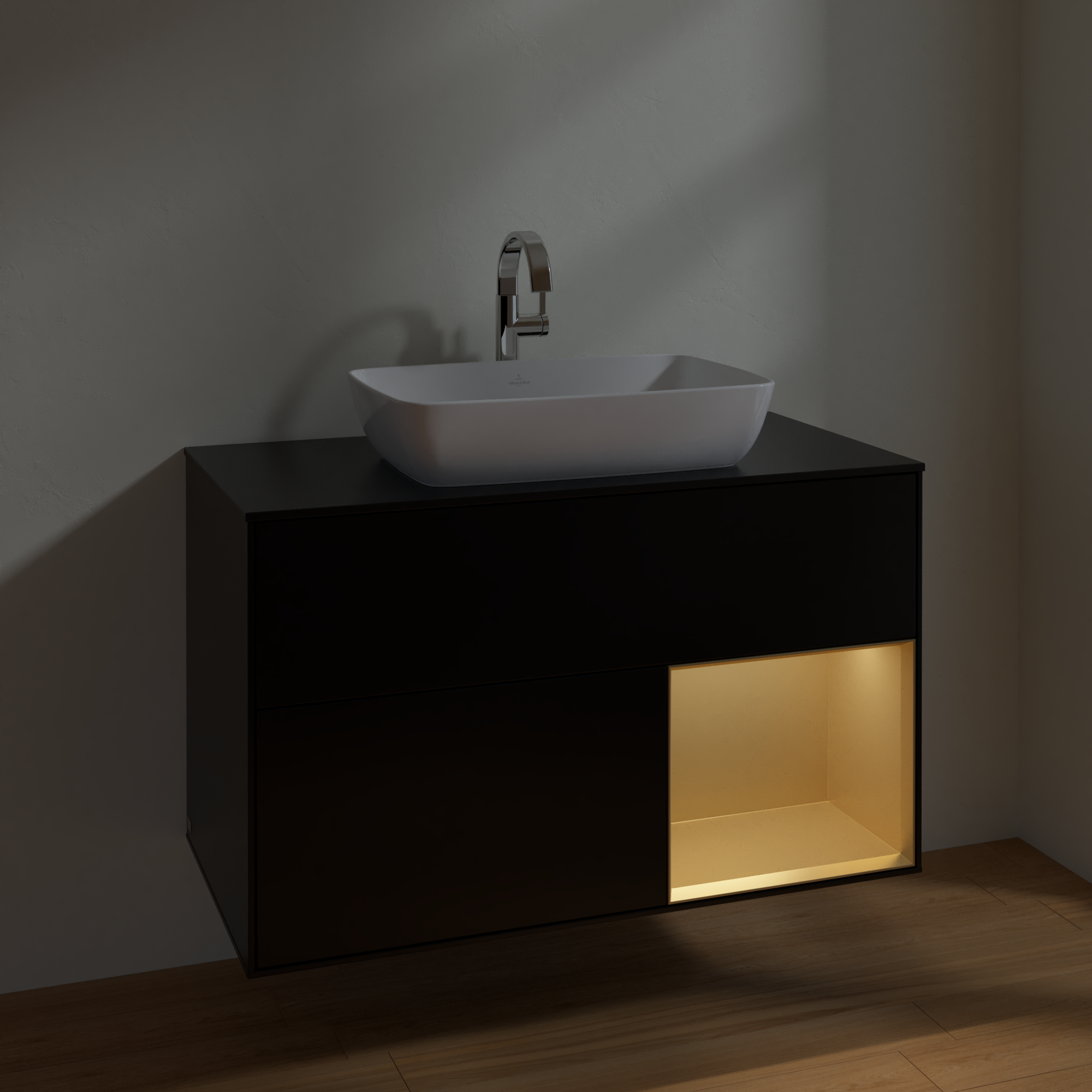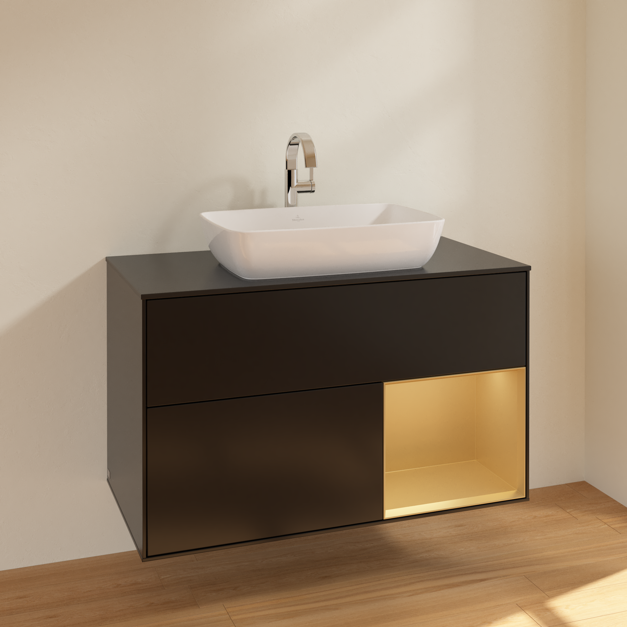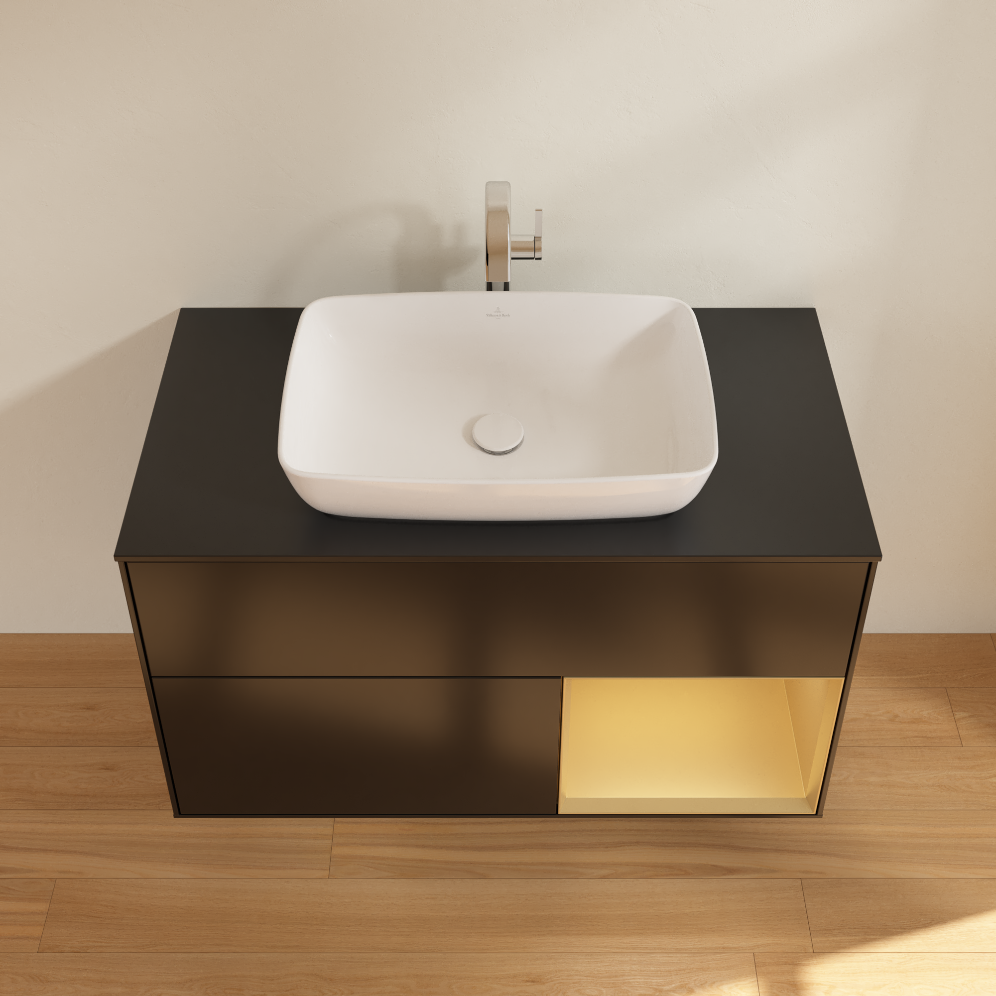 Finion Szafka podumywalkowa, z oświetleniem, 2 elementy wysuwane, 1000x603x501mm, Korpus: Black Matt Lacquer, Front: Black Matt Lacquer, Element regałowy: Gold Matt Lacquer, Blat: Glass Black Matt