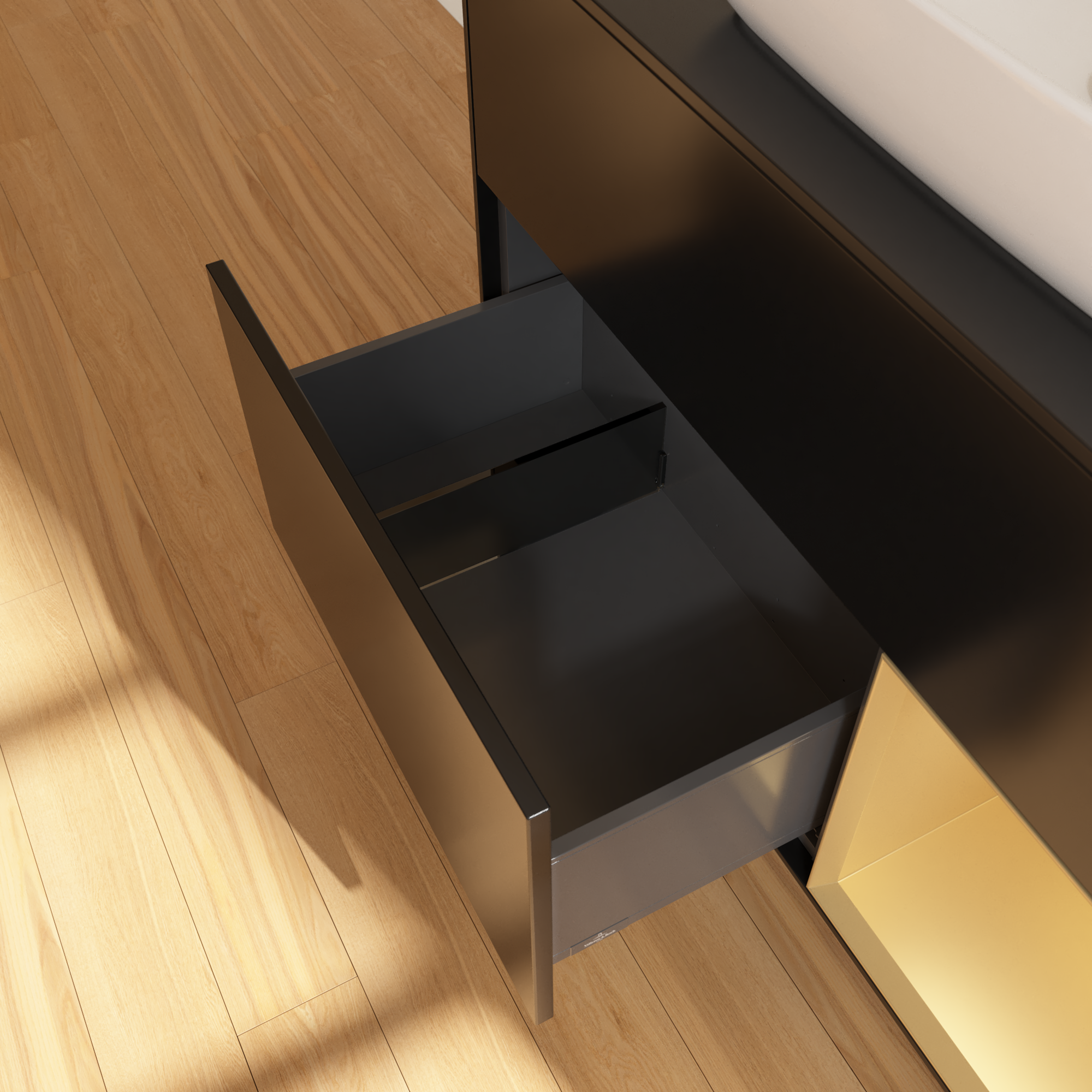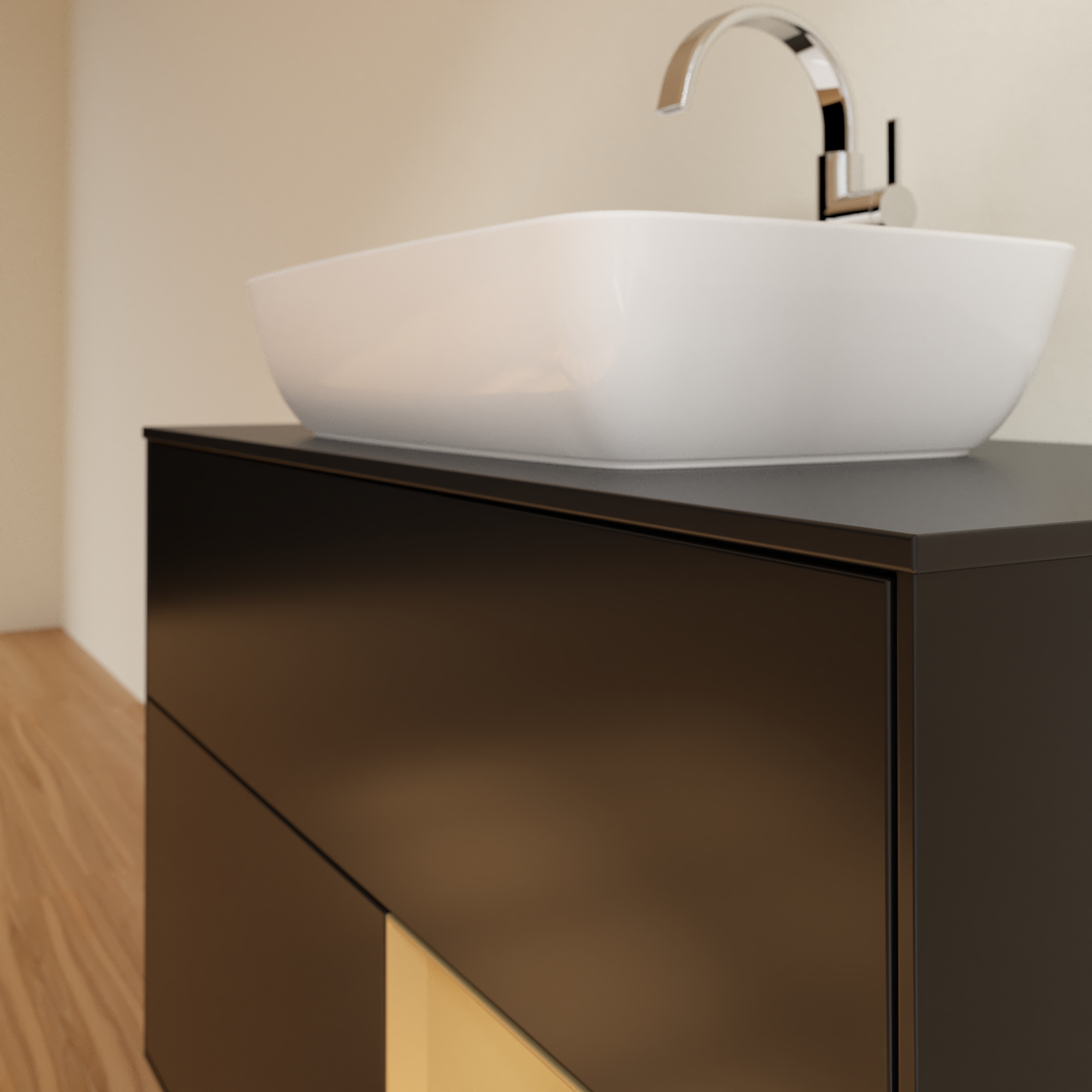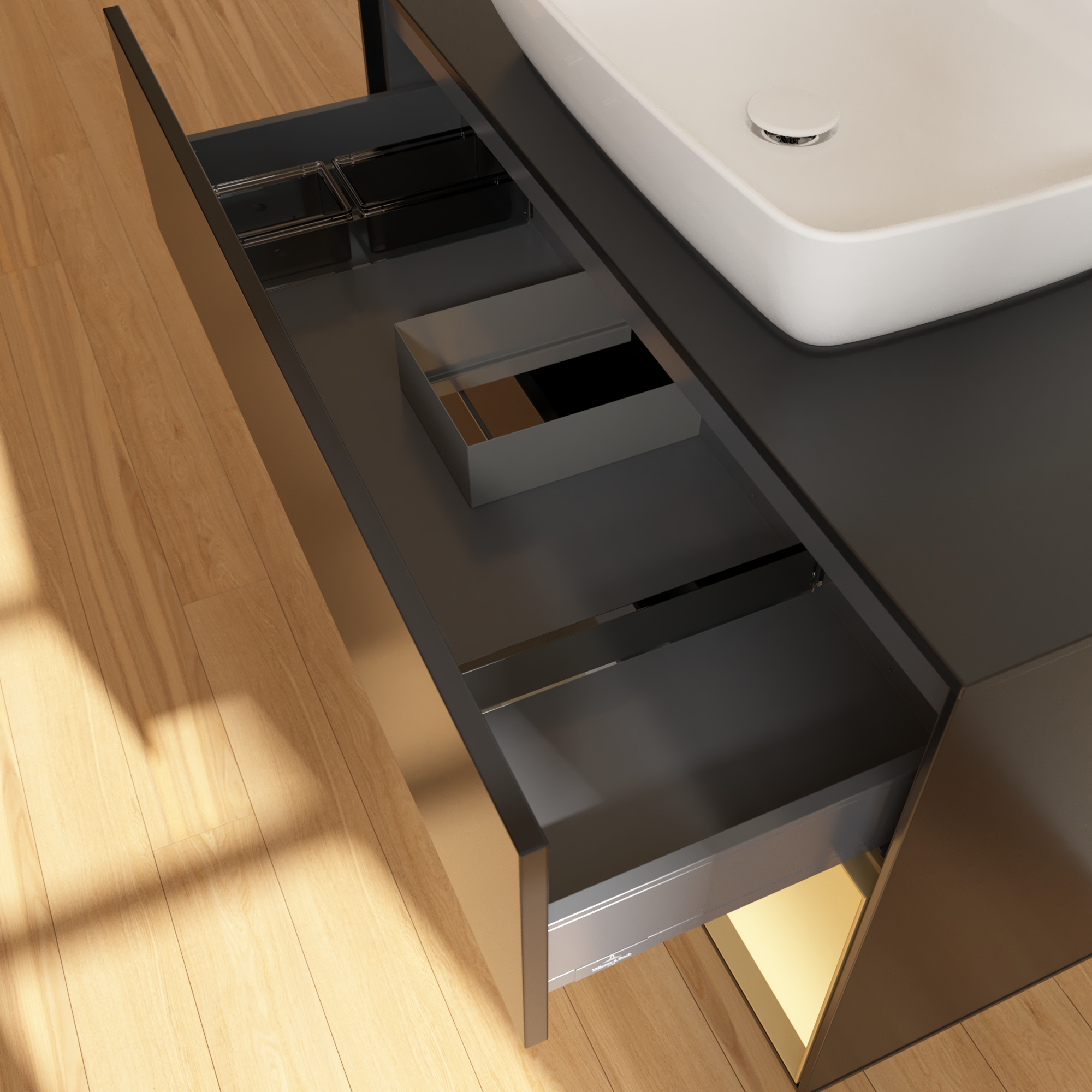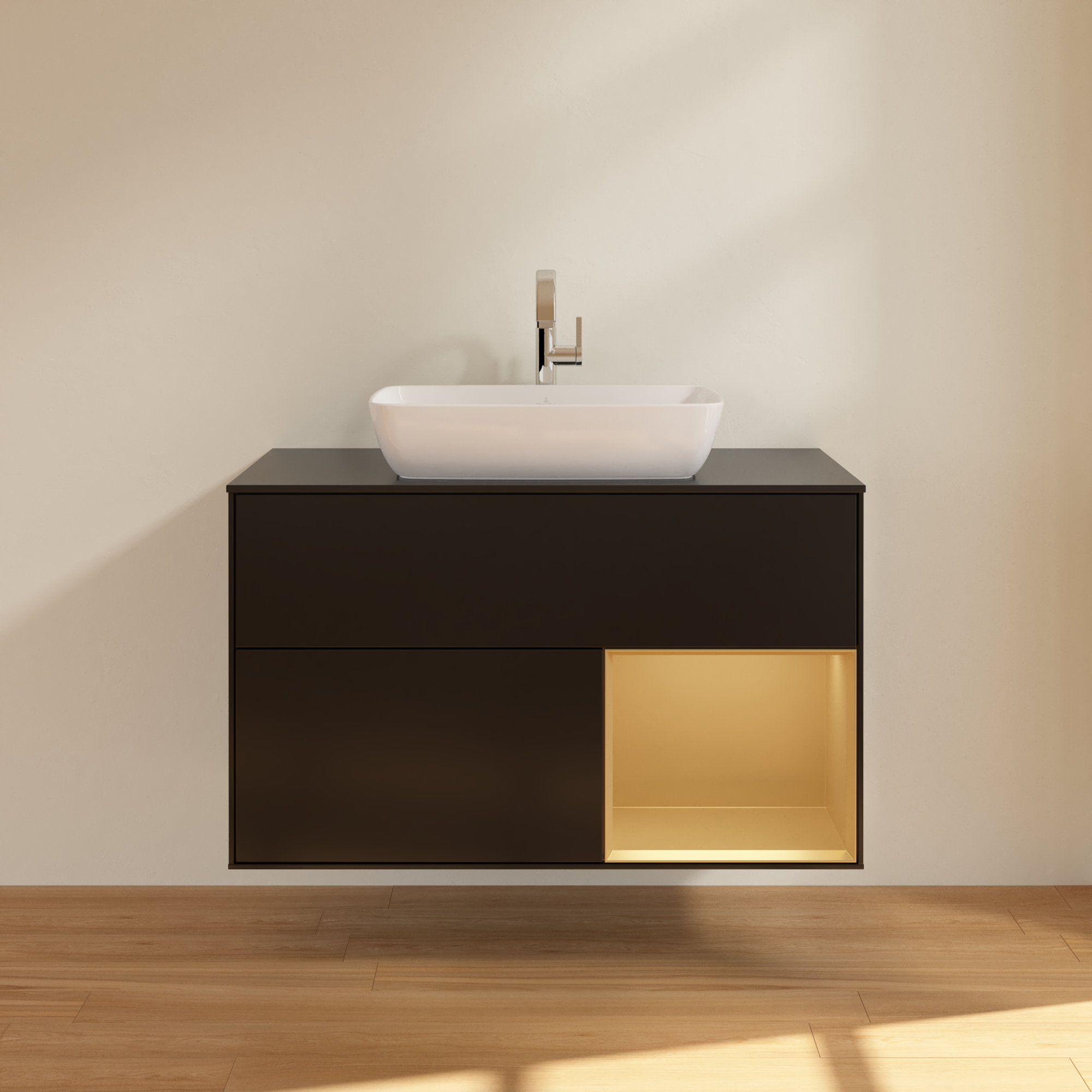 Finion Szafka podumywalkowa, z oświetleniem, 2 elementy wysuwane, 1000x603x501mm, Korpus: Black Matt Lacquer, Front: Black Matt Lacquer, Element regałowy: Gold Matt Lacquer, Blat: Glass Black Matt