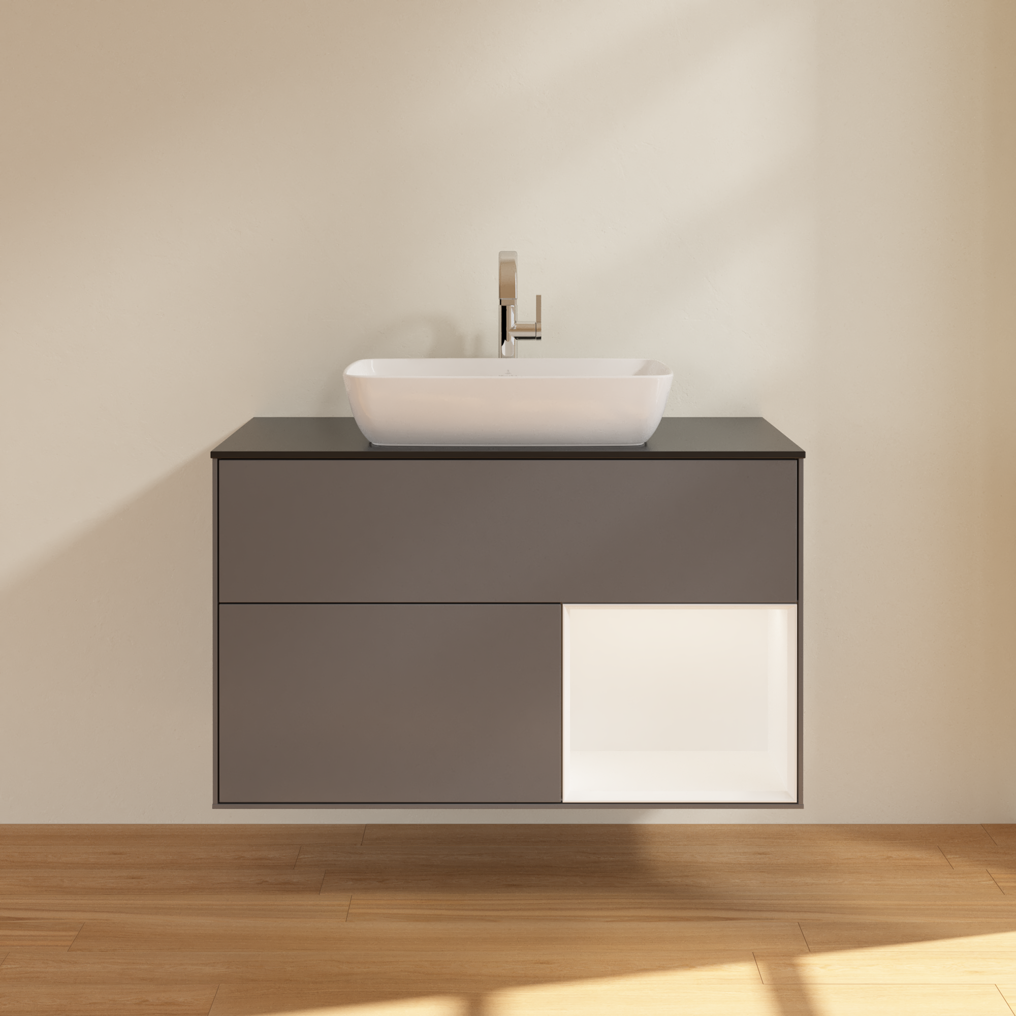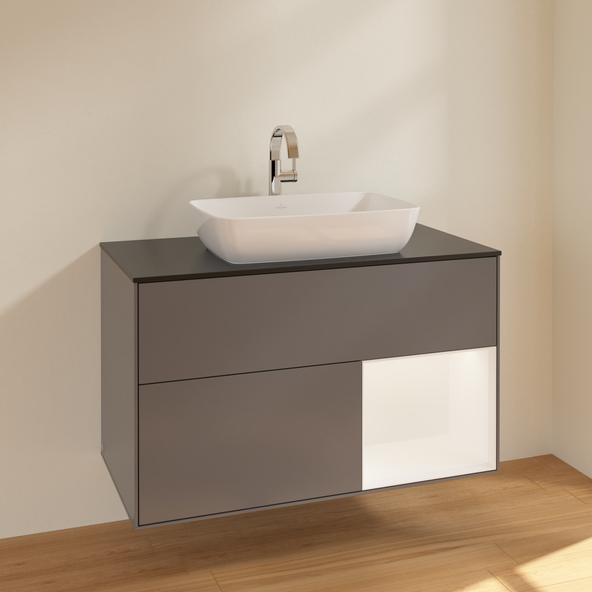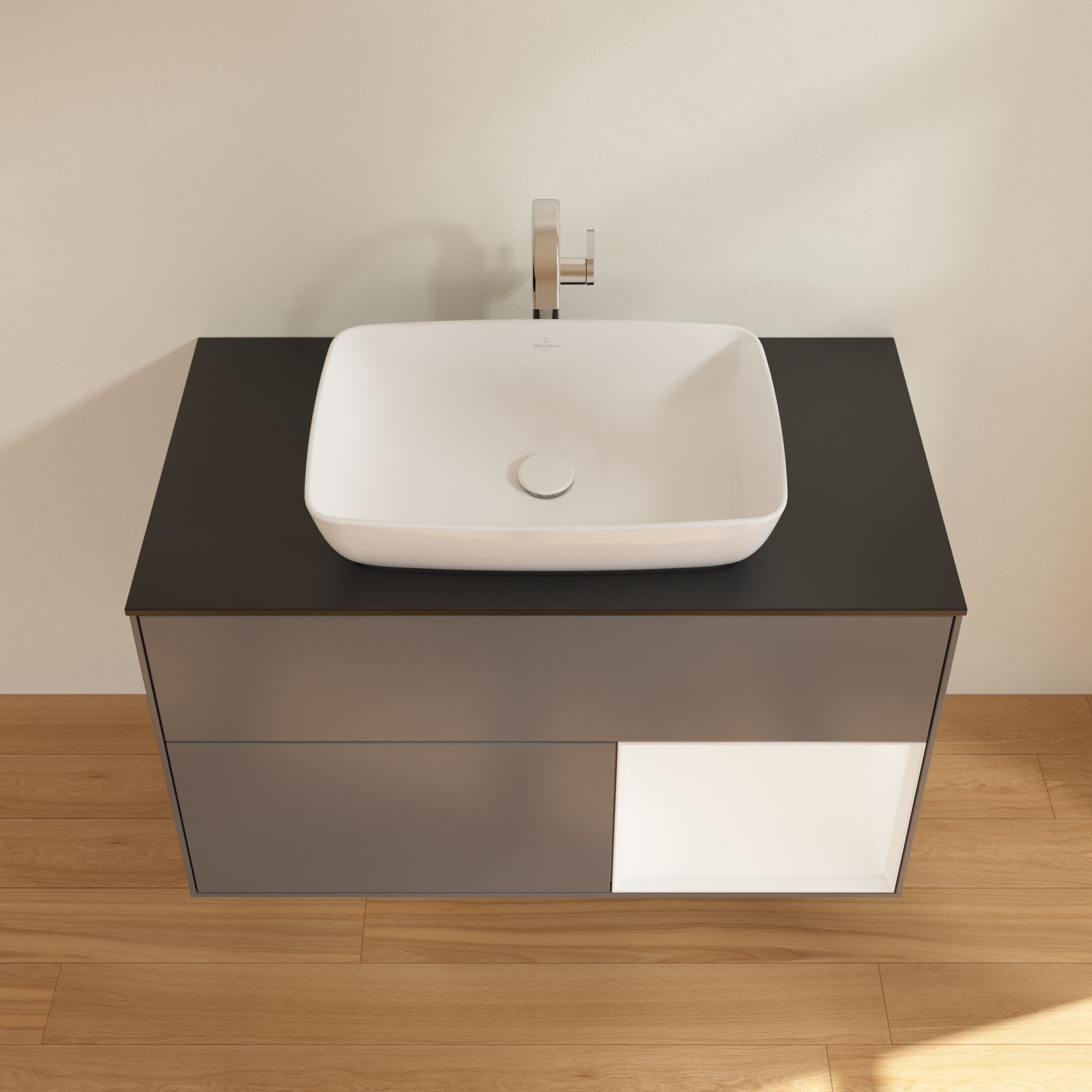 Finion Szafka podumywalkowa, z oświetleniem, 2 elementy wysuwane, 1000x603x501mm, Korpus: Anthracite Matt Lacquer, Front: Anthracite Matt Lacquer, Element regałowy: White Matt Lacquer, Blat: Glass Black Matt
