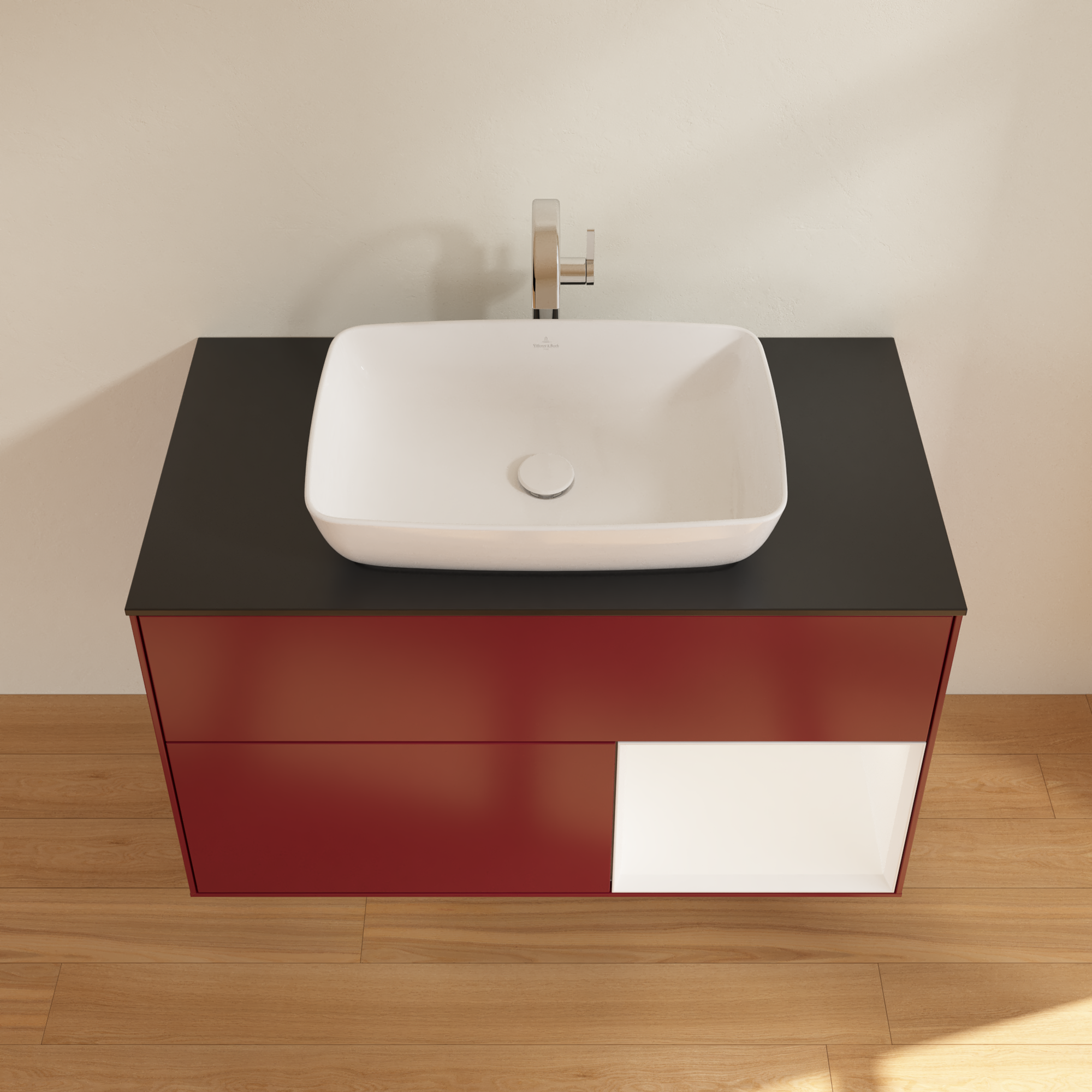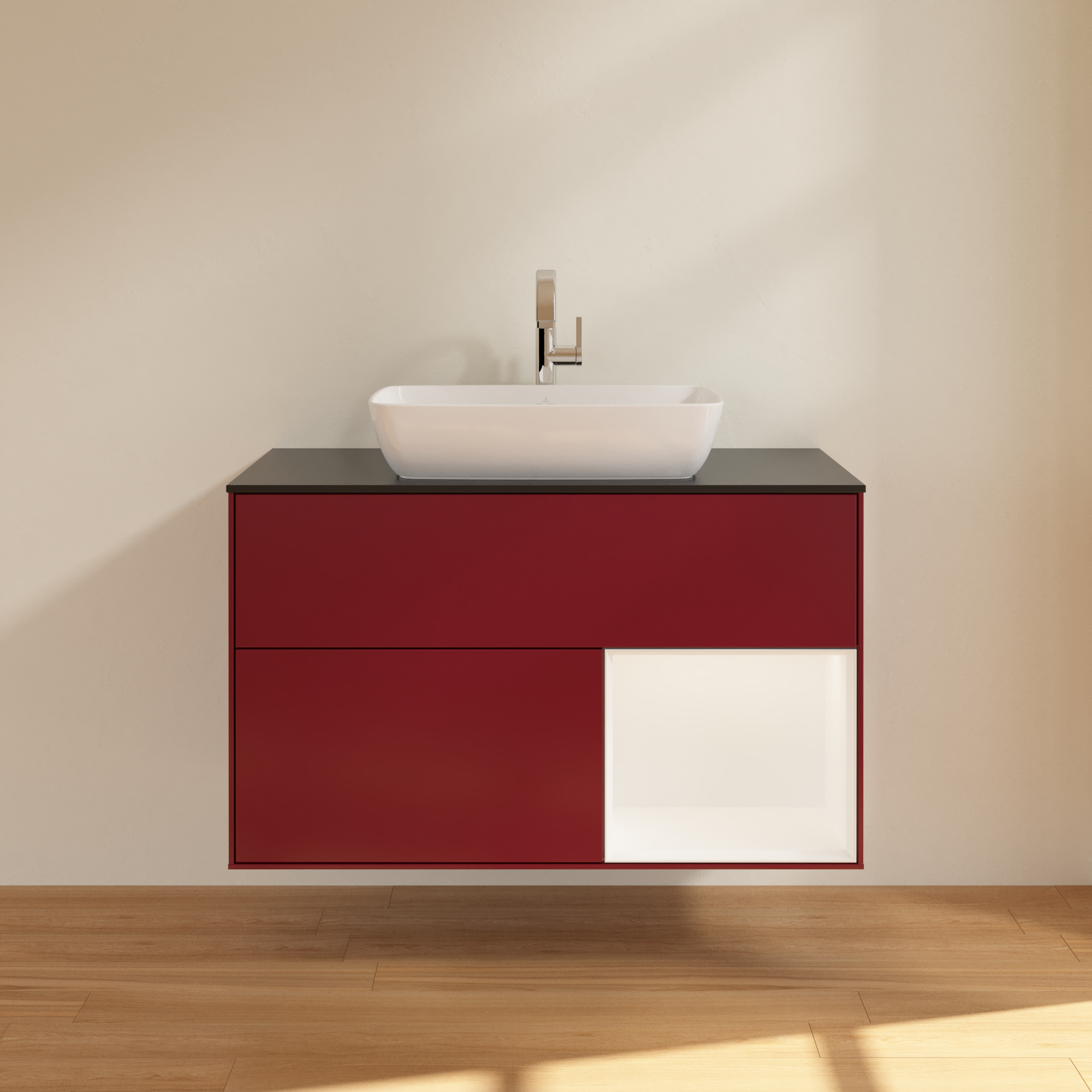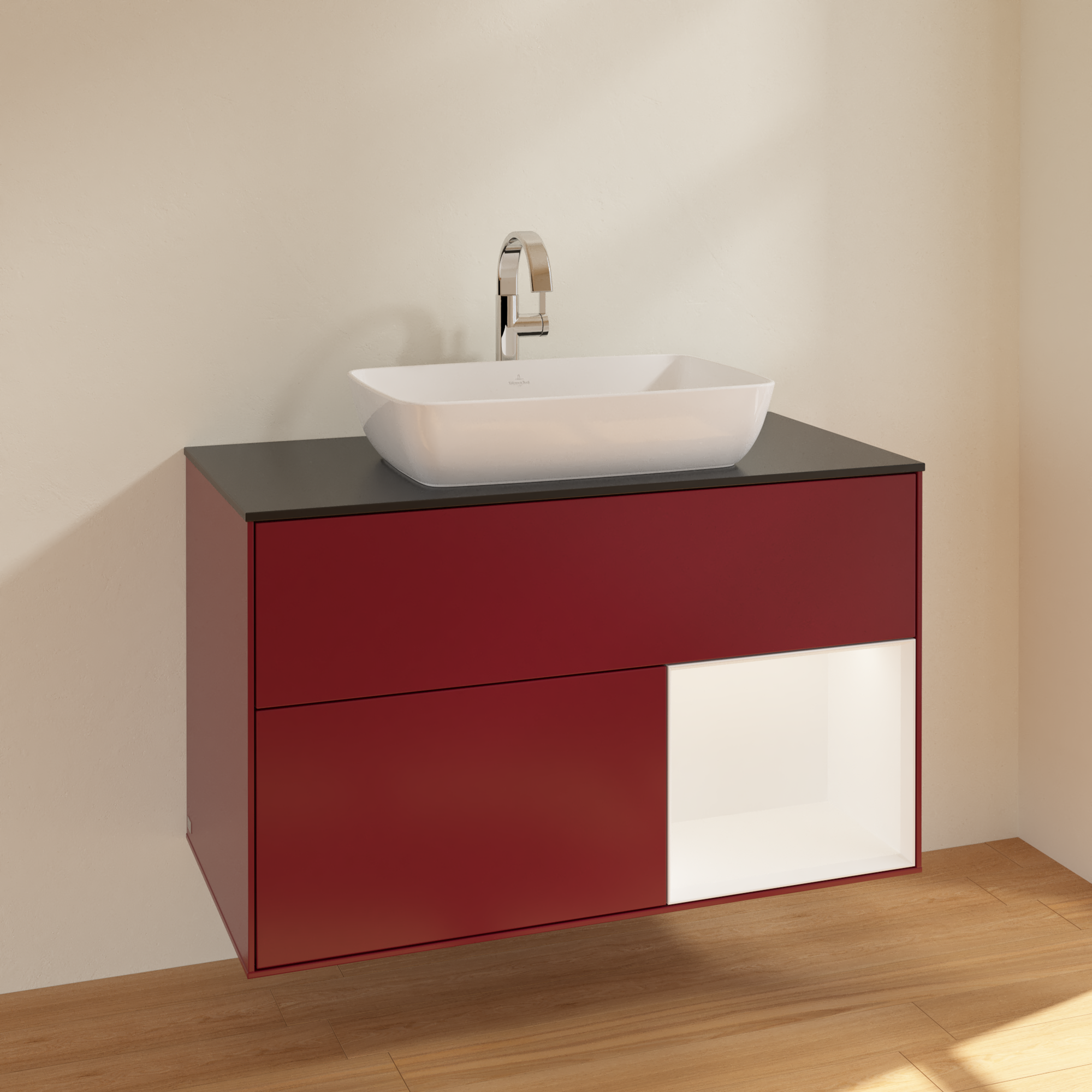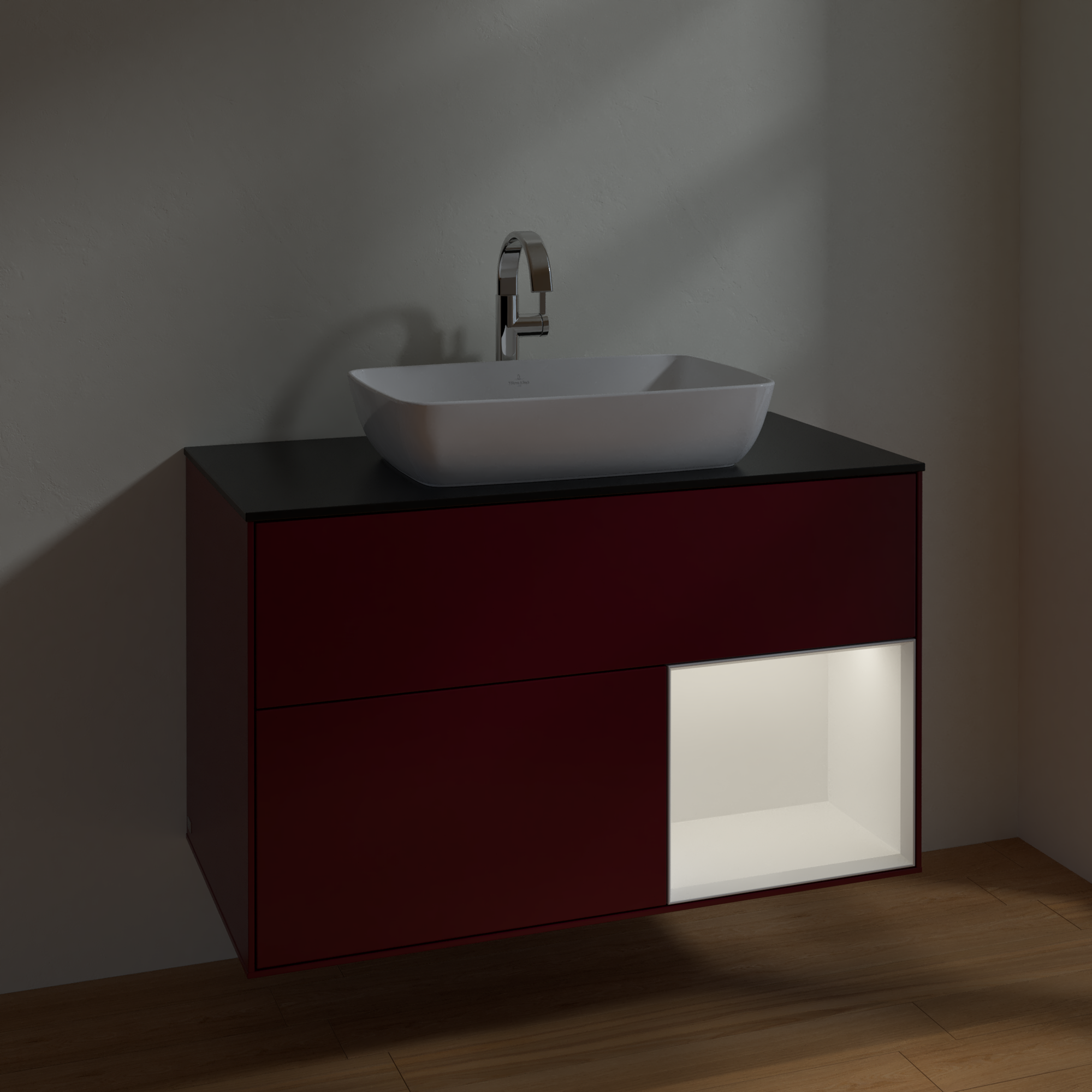 Finion Szafka podumywalkowa, z oświetleniem, 2 elementy wysuwane, 1000x603x501mm, Korpus: Peony Matt Lacquer, Front: Peony Matt Lacquer, Element regałowy: White Matt Lacquer, Blat: Glass Black Matt