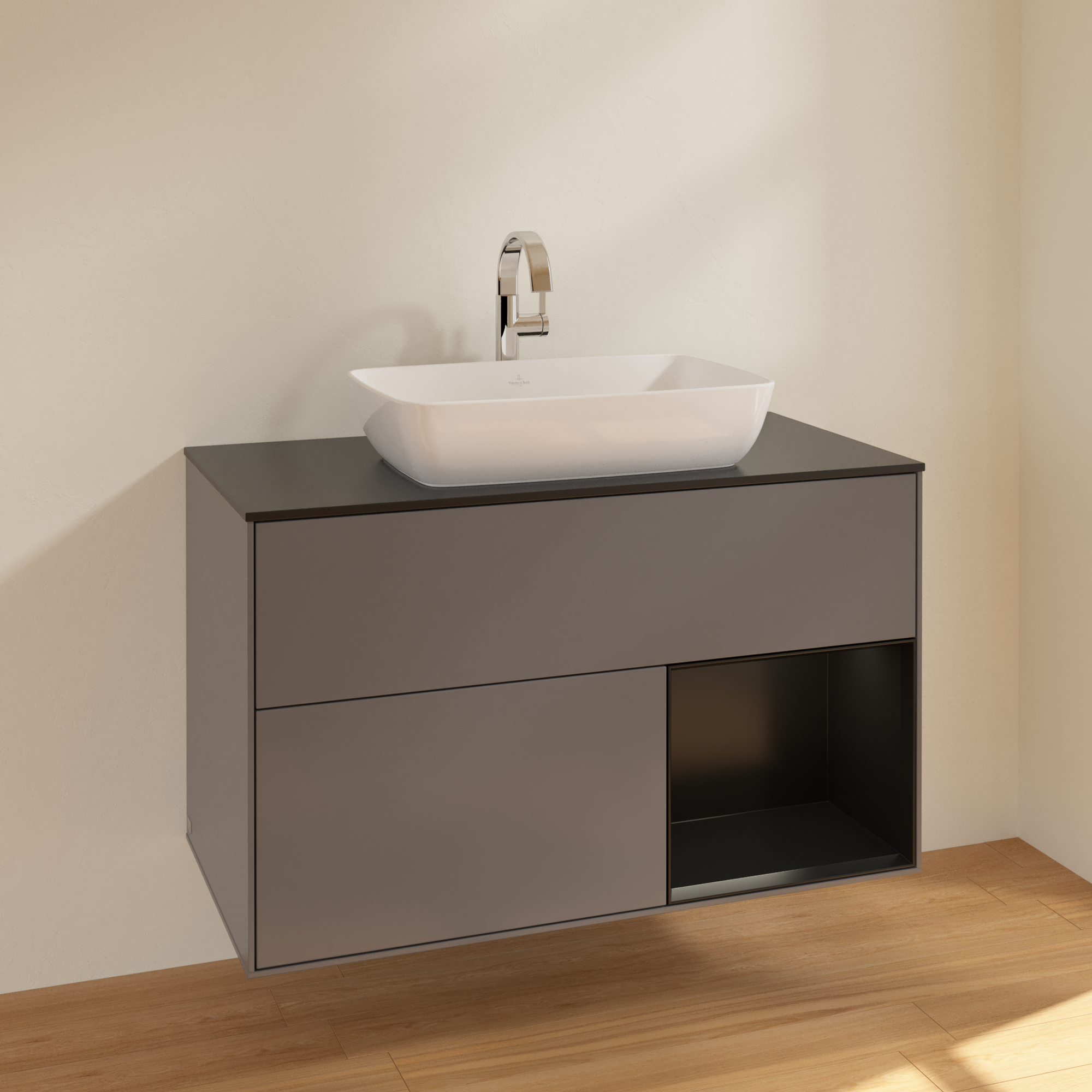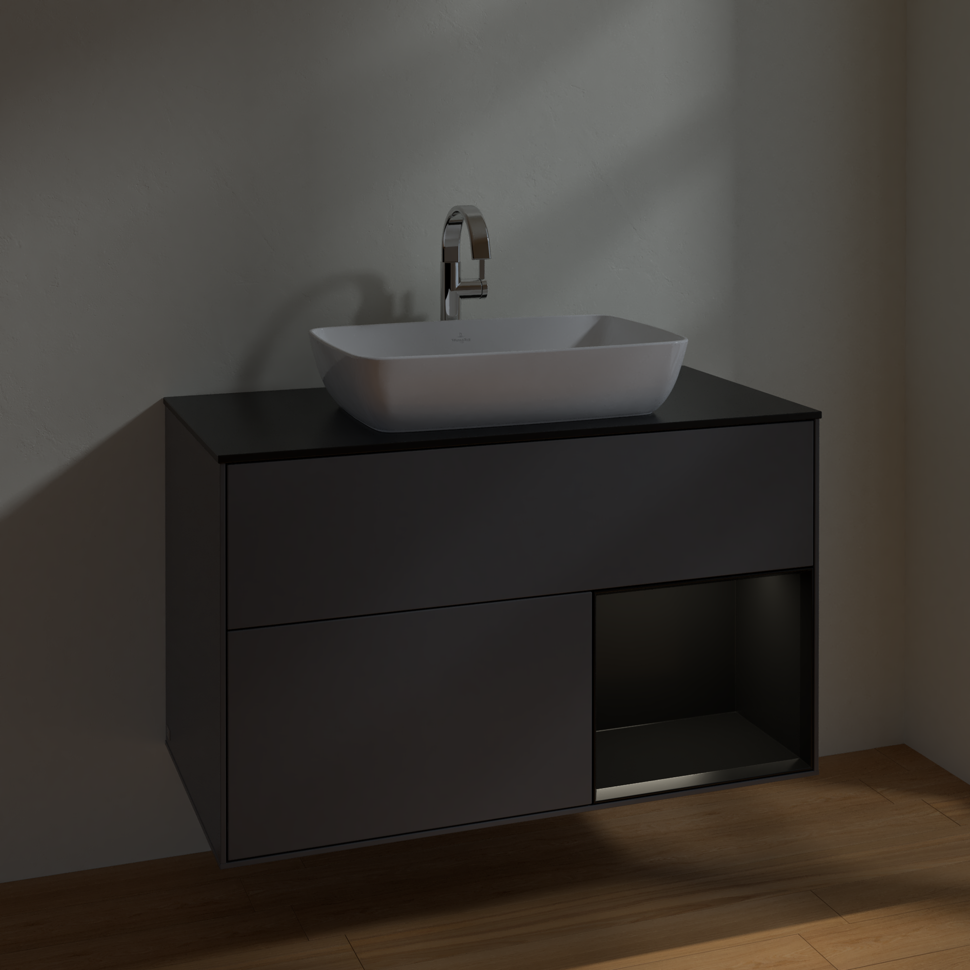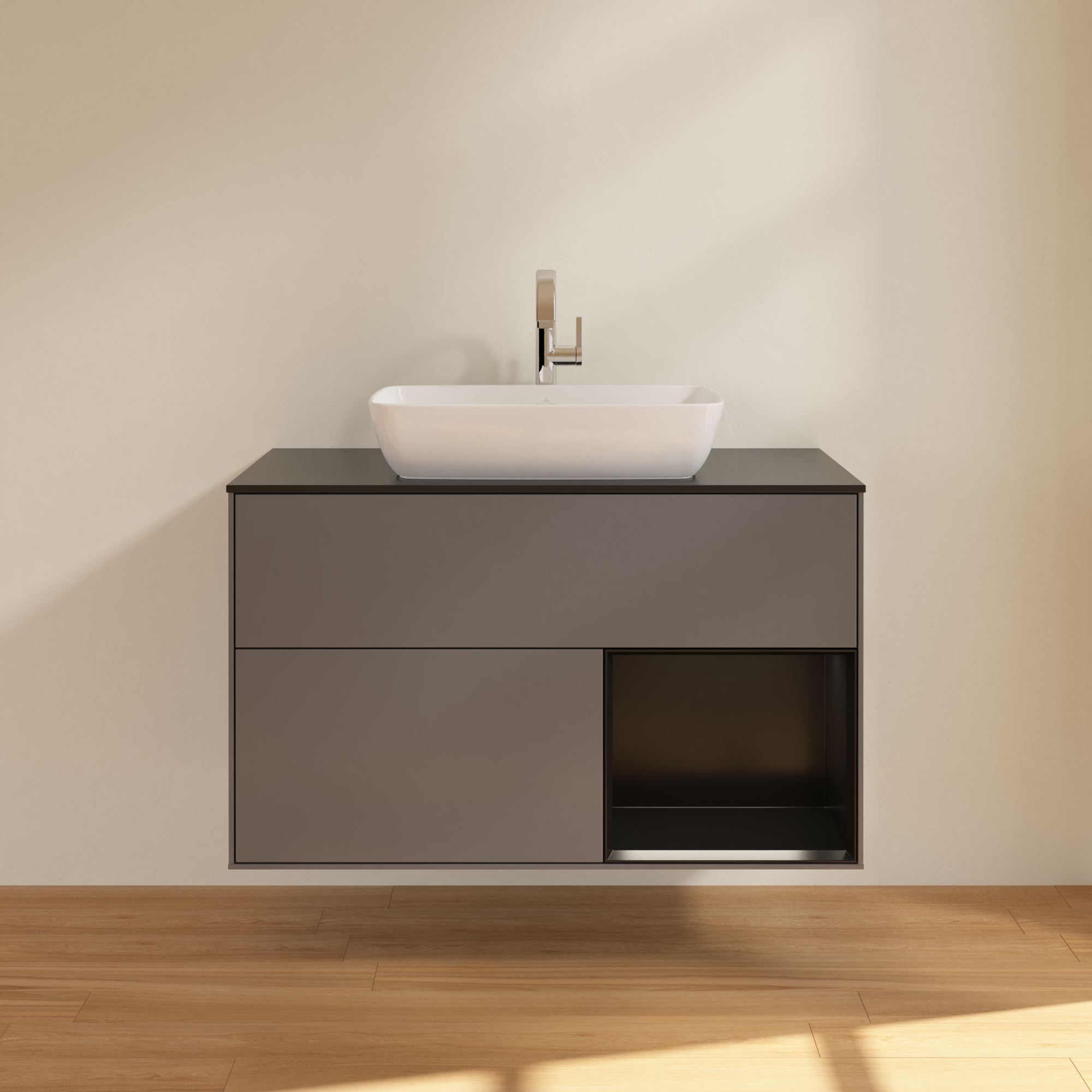Finion Szafka podumywalkowa, z oświetleniem, 2 elementy wysuwane, 1000x603x501mm, Korpus: Anthracite Matt Lacquer, Front: Anthracite Matt Lacquer, Element regałowy: Black Matt Lacquer, Blat: Glass Black Matt
