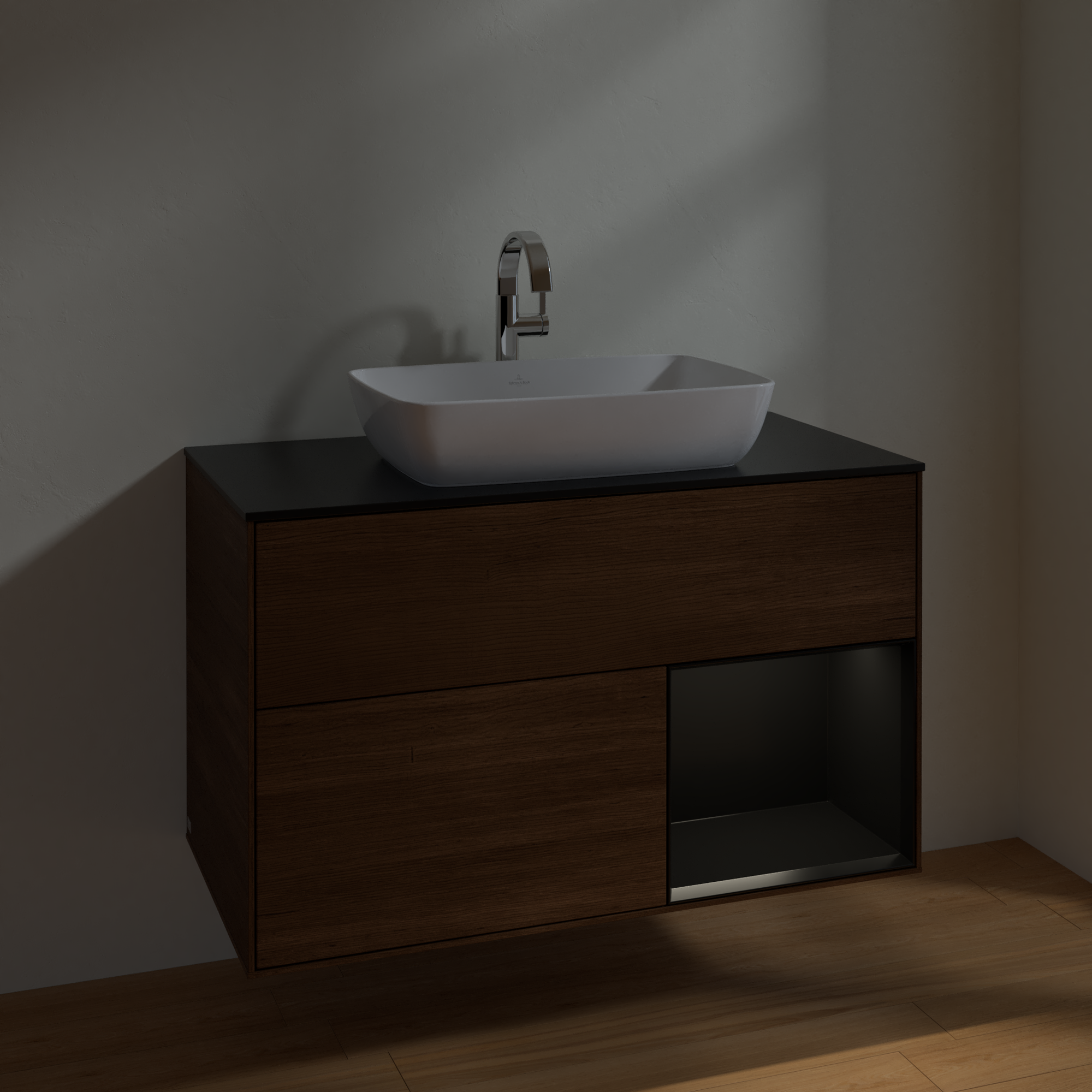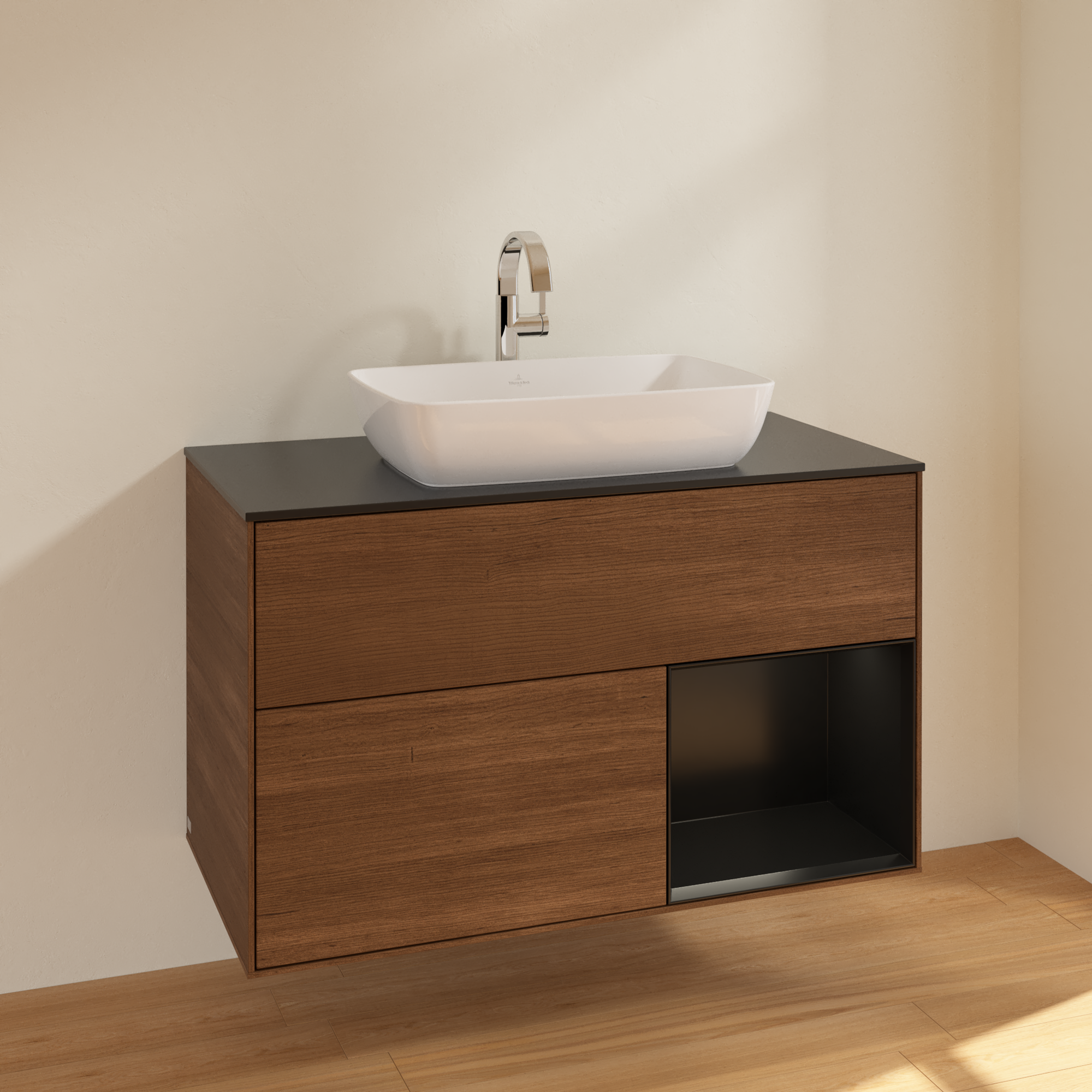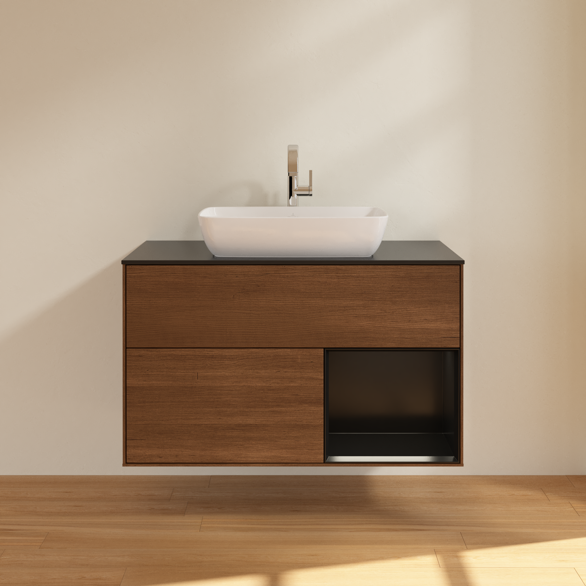 Finion Szafka podumywalkowa, z oświetleniem, 2 elementy wysuwane, 1000x603x501mm, Korpus: Walnut Veneer, Front: Walnut Veneer, Element regałowy: Black Matt Lacquer, Blat: Glass Black Matt