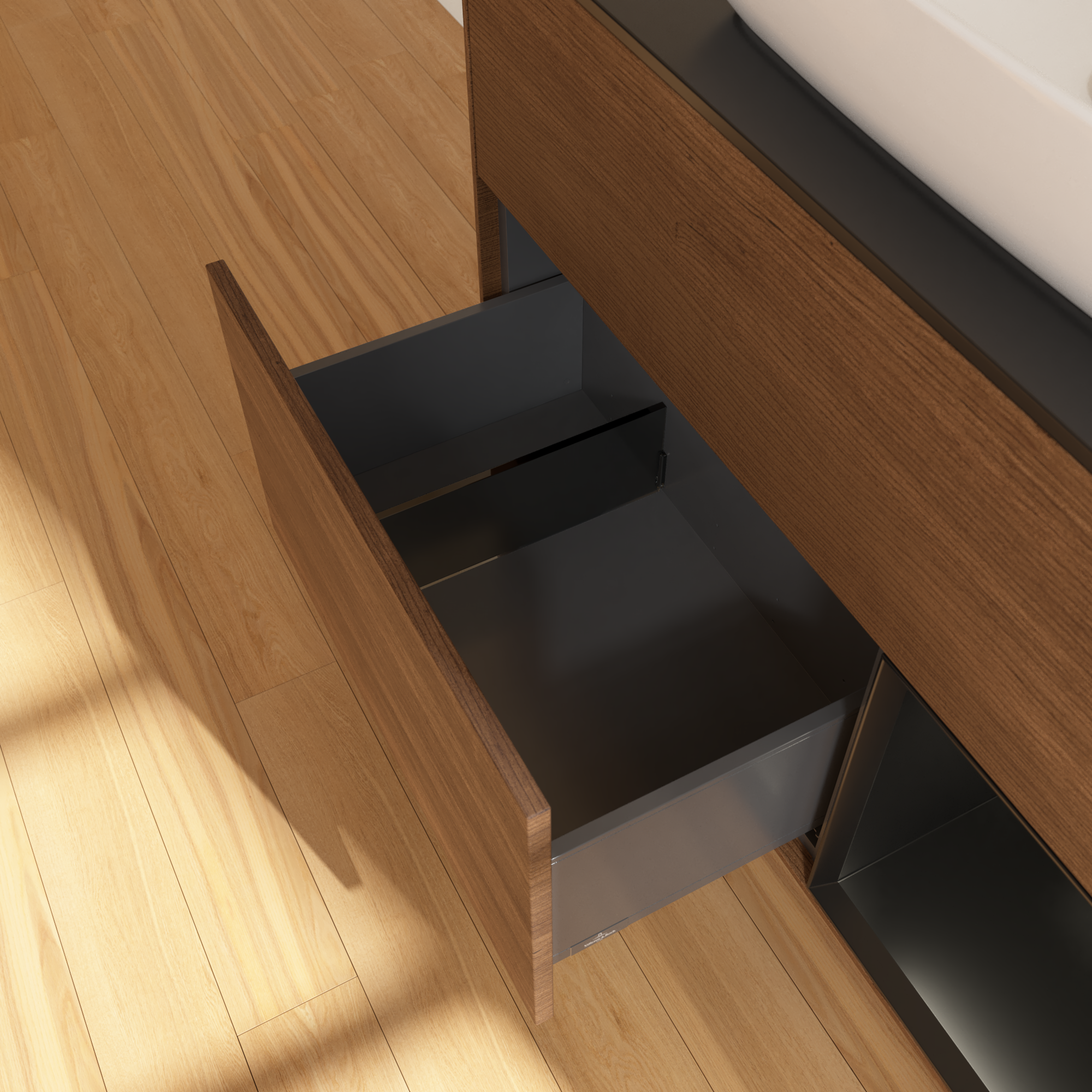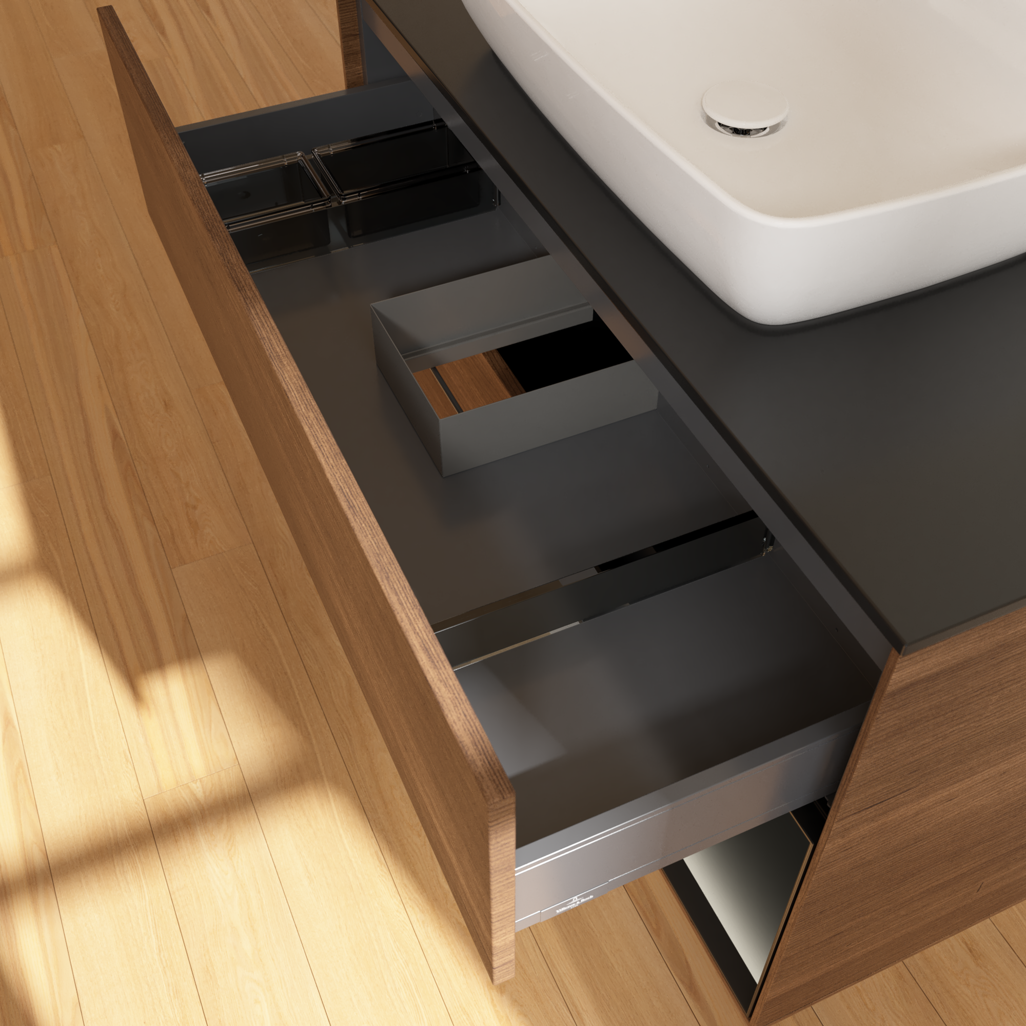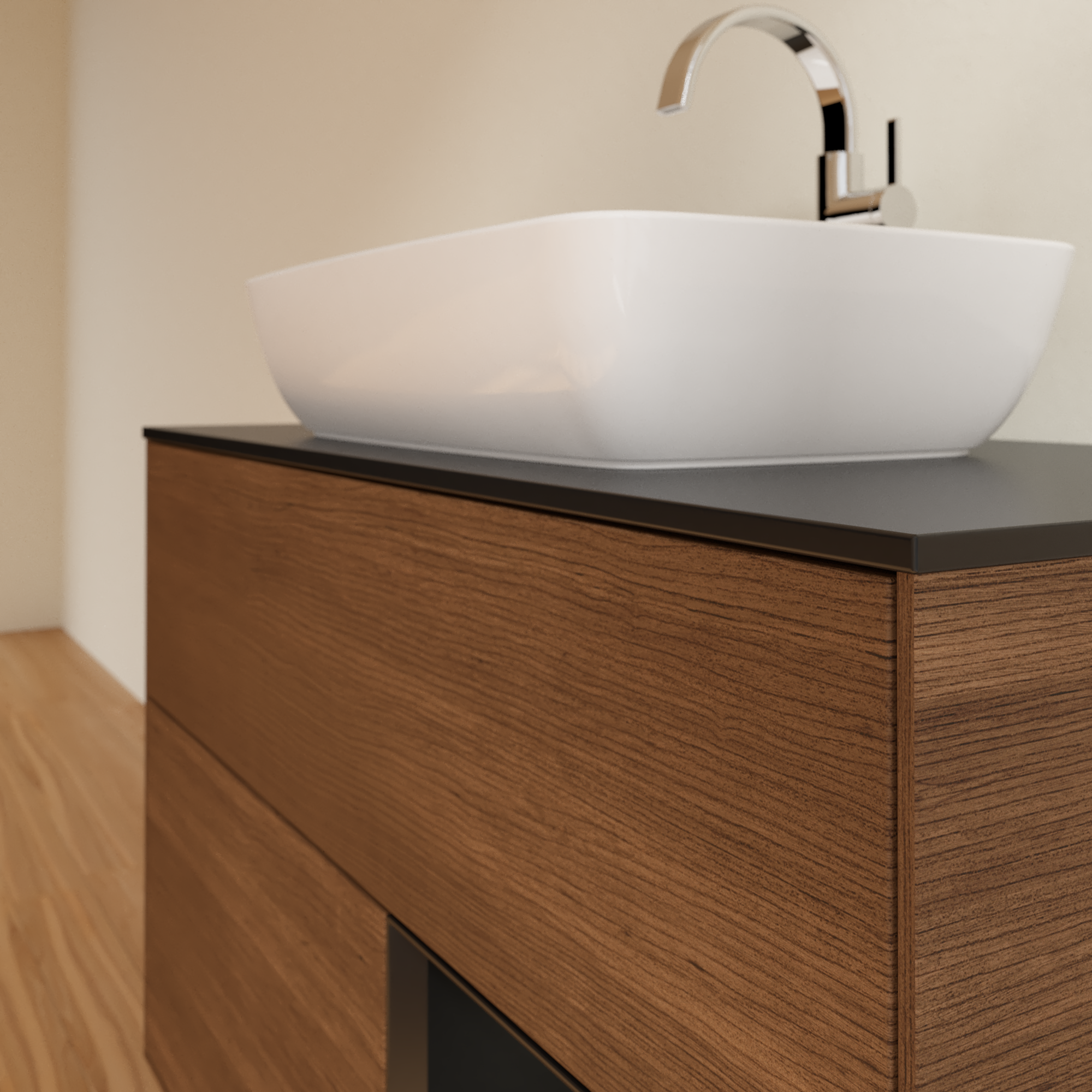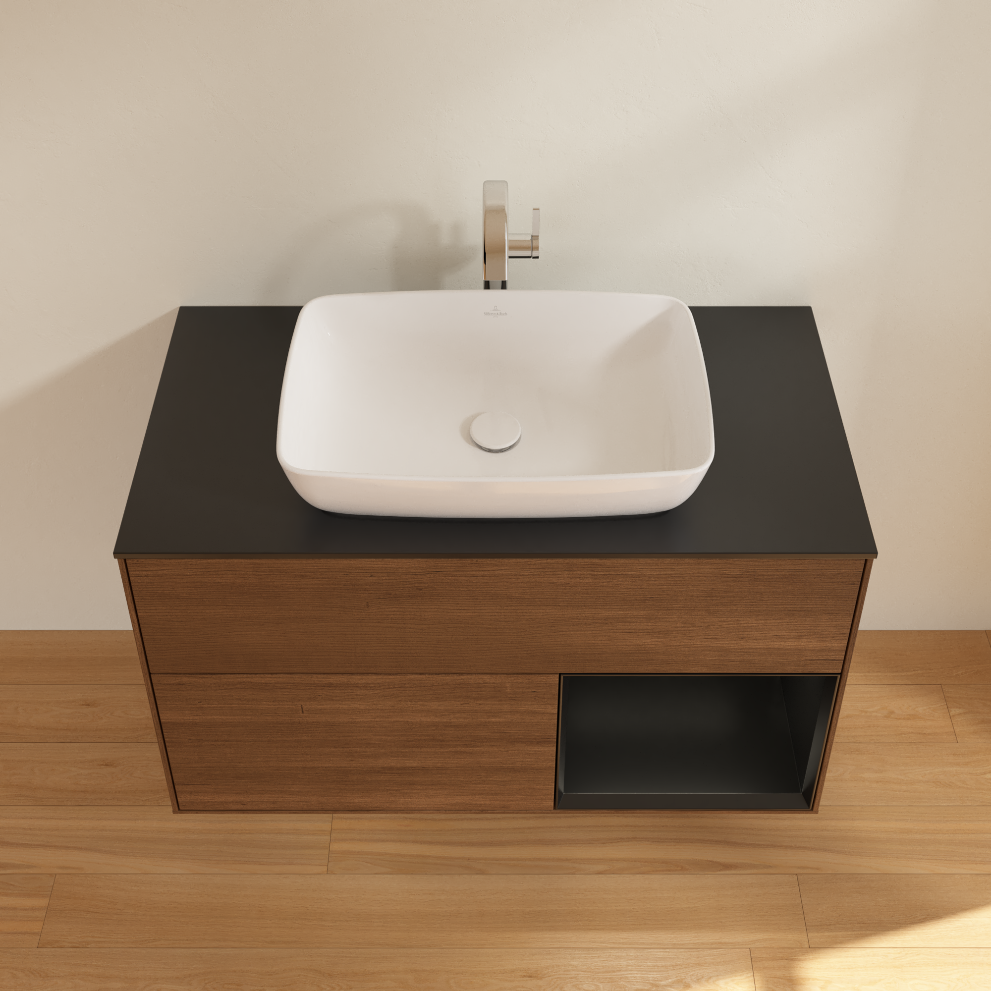 Finion Szafka podumywalkowa, z oświetleniem, 2 elementy wysuwane, 1000x603x501mm, Korpus: Walnut Veneer, Front: Walnut Veneer, Element regałowy: Black Matt Lacquer, Blat: Glass Black Matt