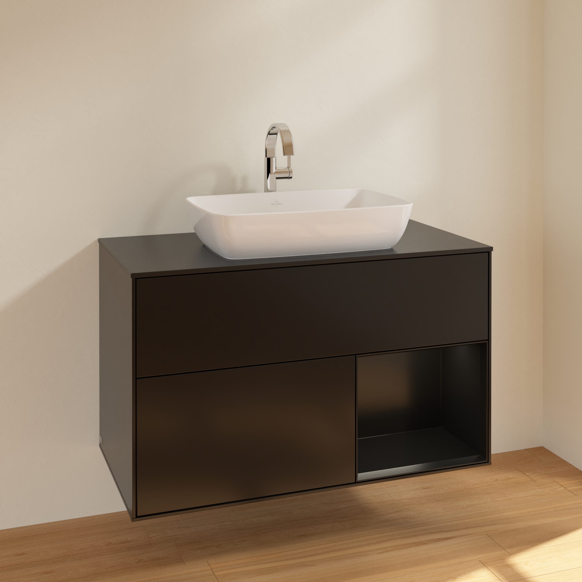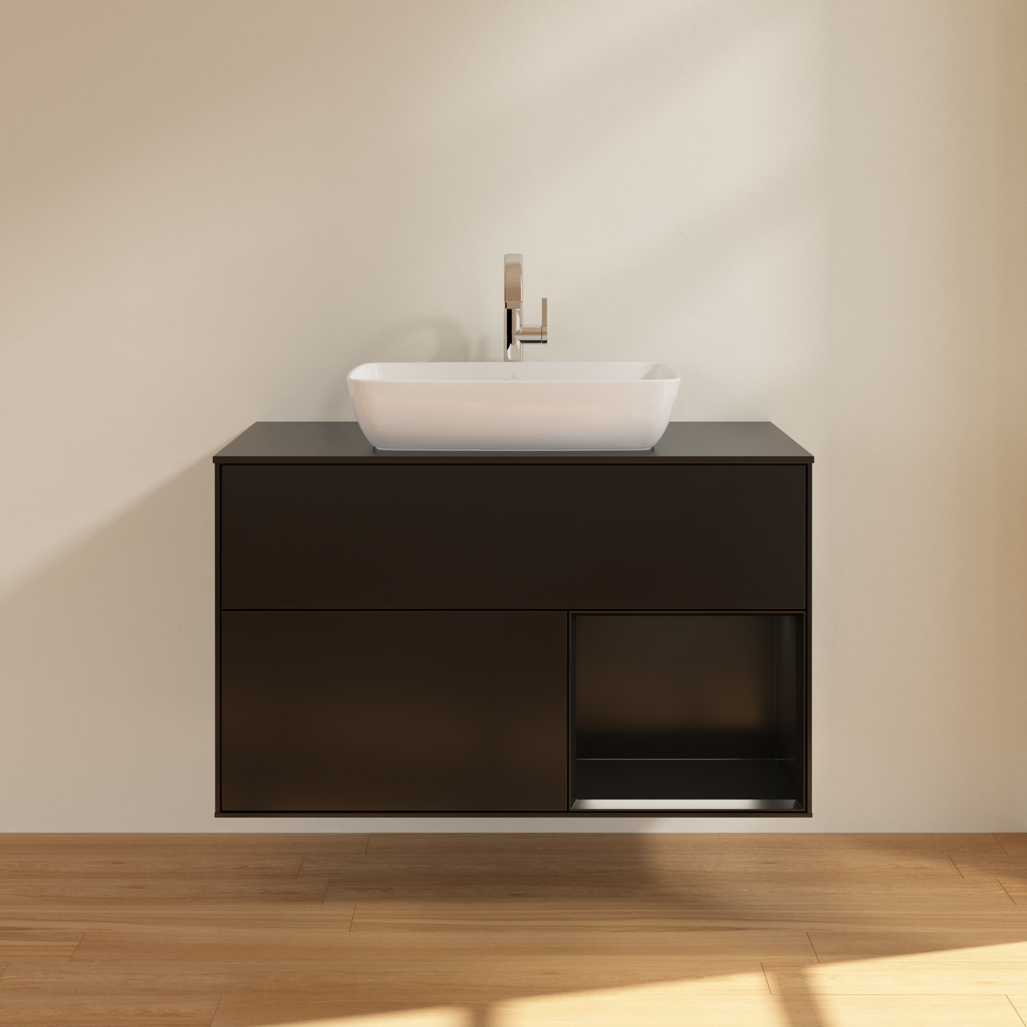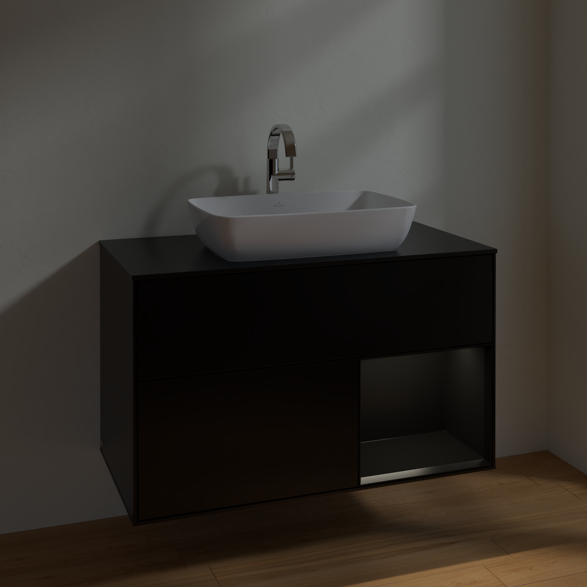 Finion Szafka podumywalkowa, z oświetleniem, 2 elementy wysuwane, 1000x603x501mm, Korpus: Black Matt Lacquer, Front: Black Matt Lacquer, Element regałowy: Black Matt Lacquer, Blat: Glass Black Matt