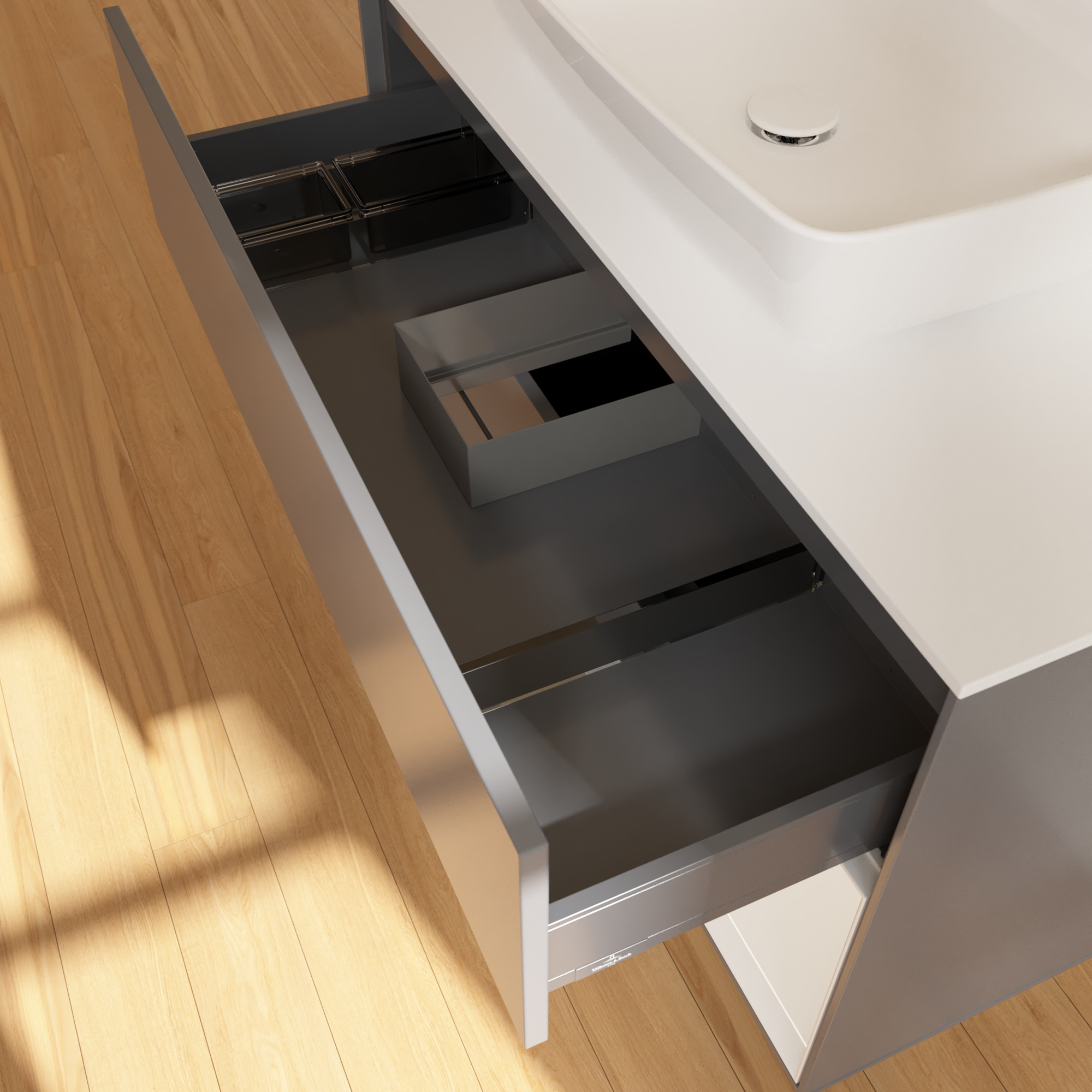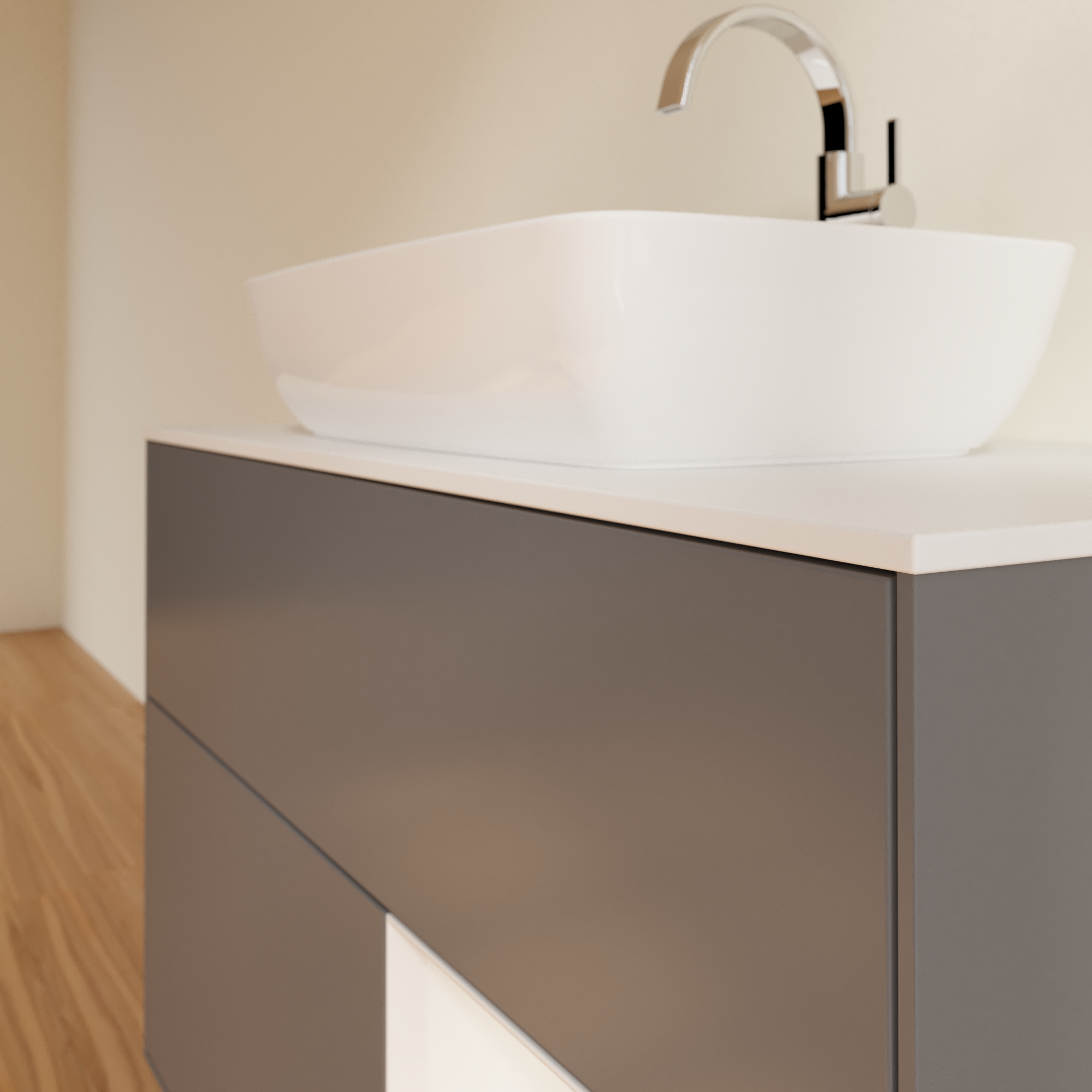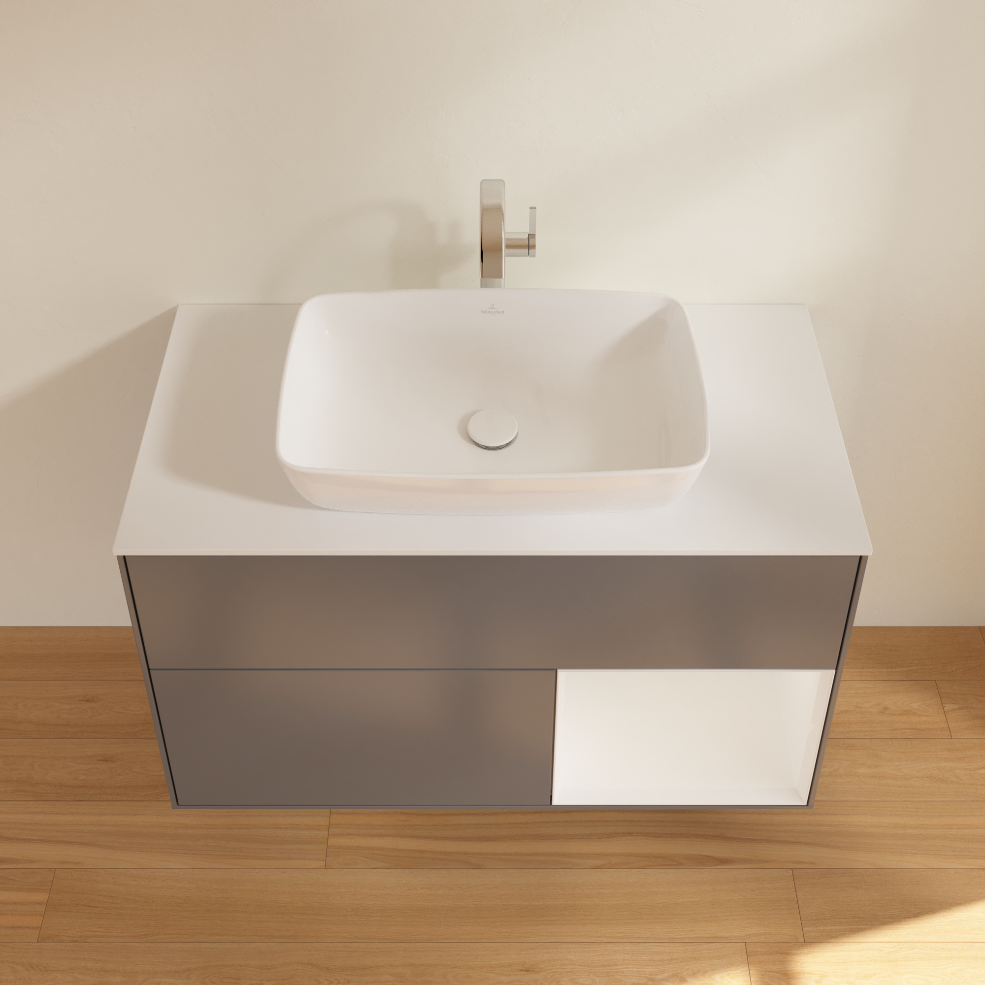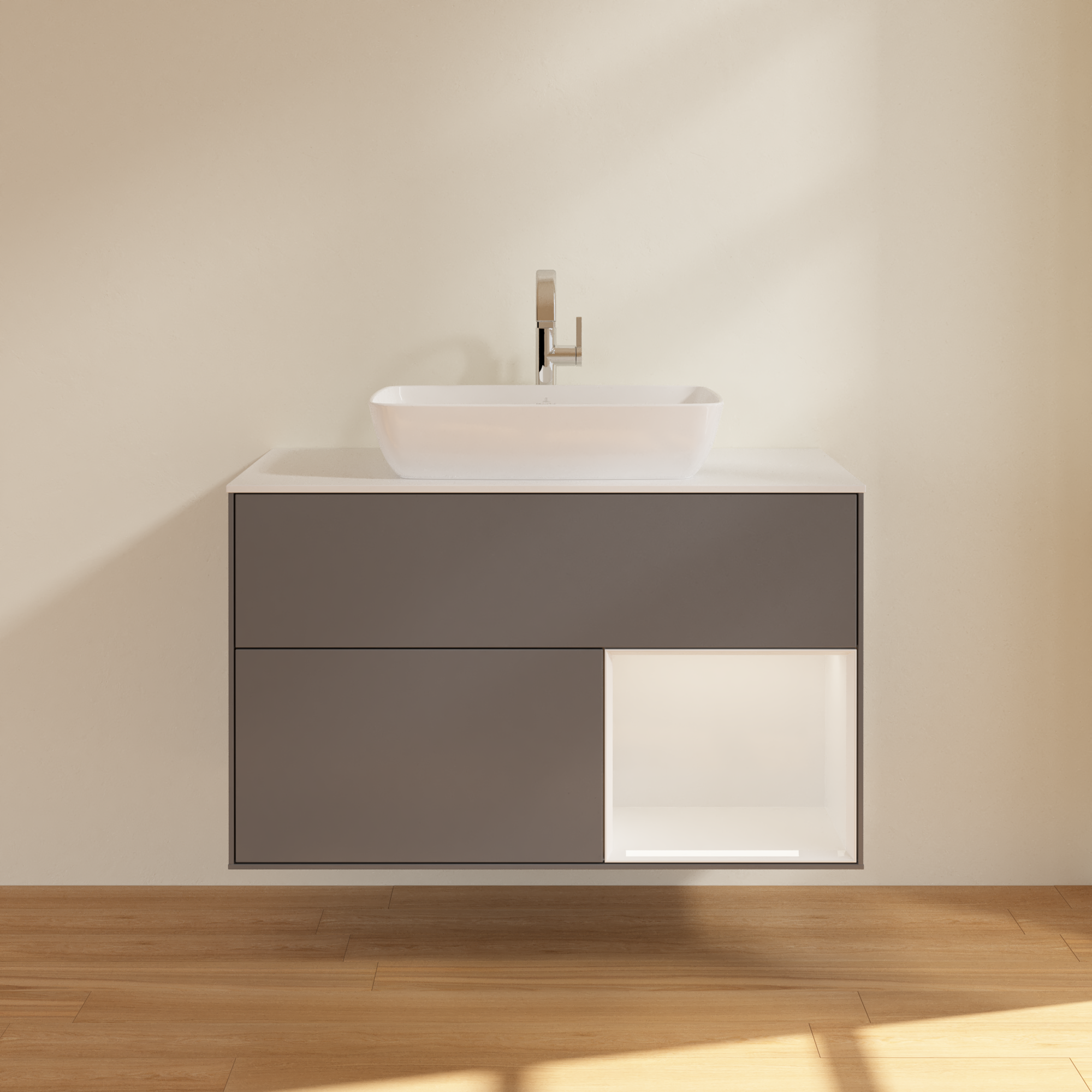Finion Szafka podumywalkowa, z oświetleniem, 2 elementy wysuwane, 1000x603x501mm, Korpus: Anthracite Matt Lacquer, Front: Anthracite Matt Lacquer, Element regałowy: Glossy White Lacquer, Blat: Glass White Matt