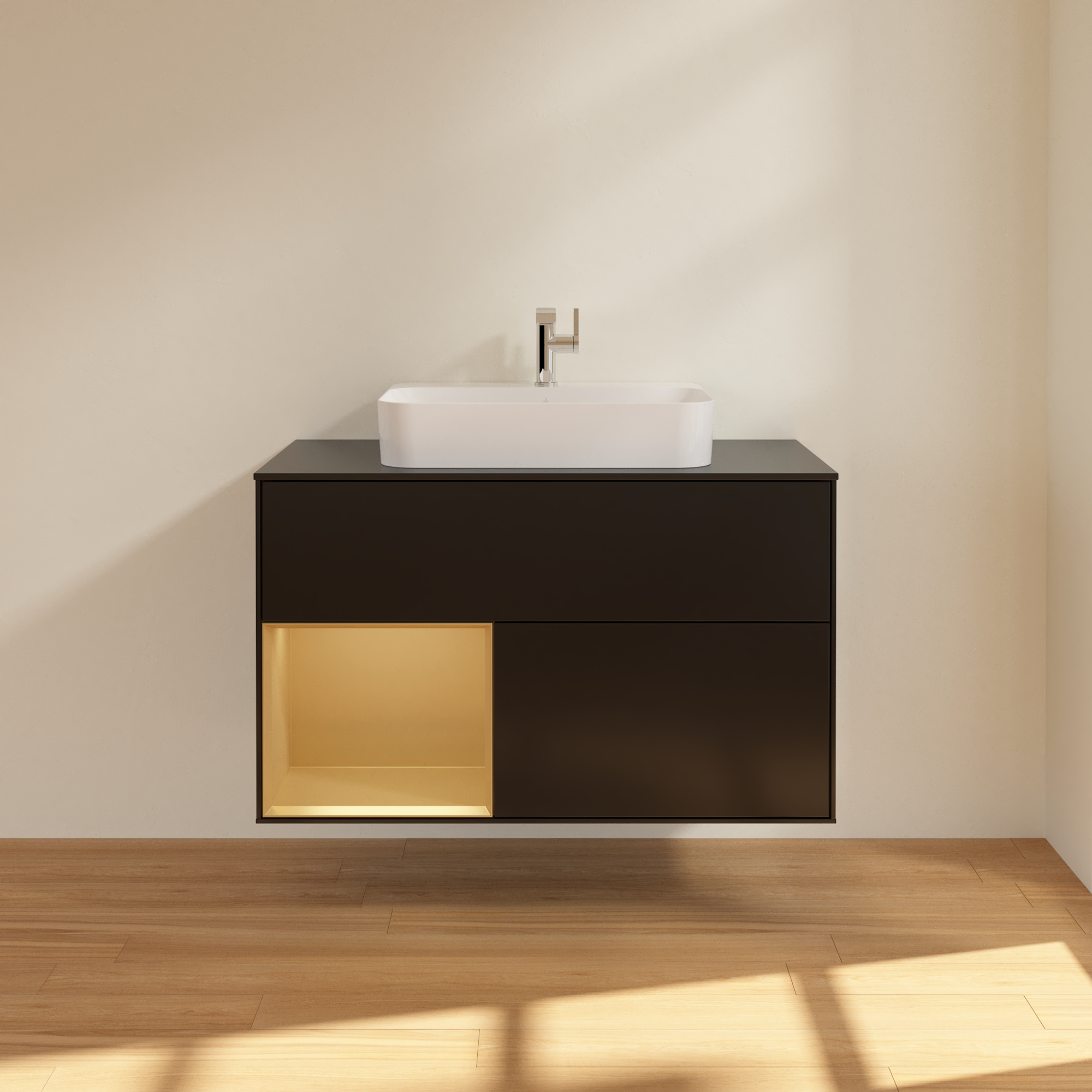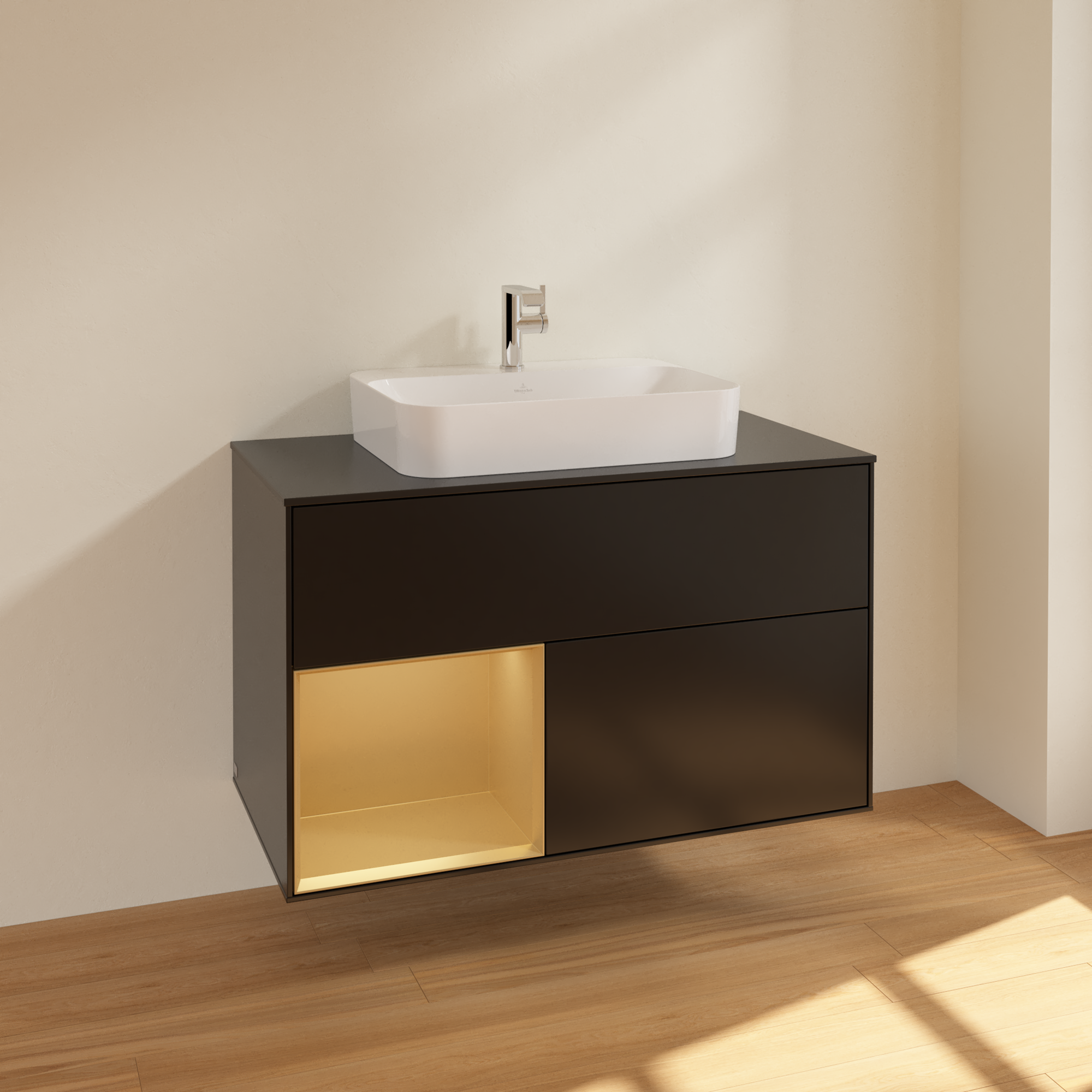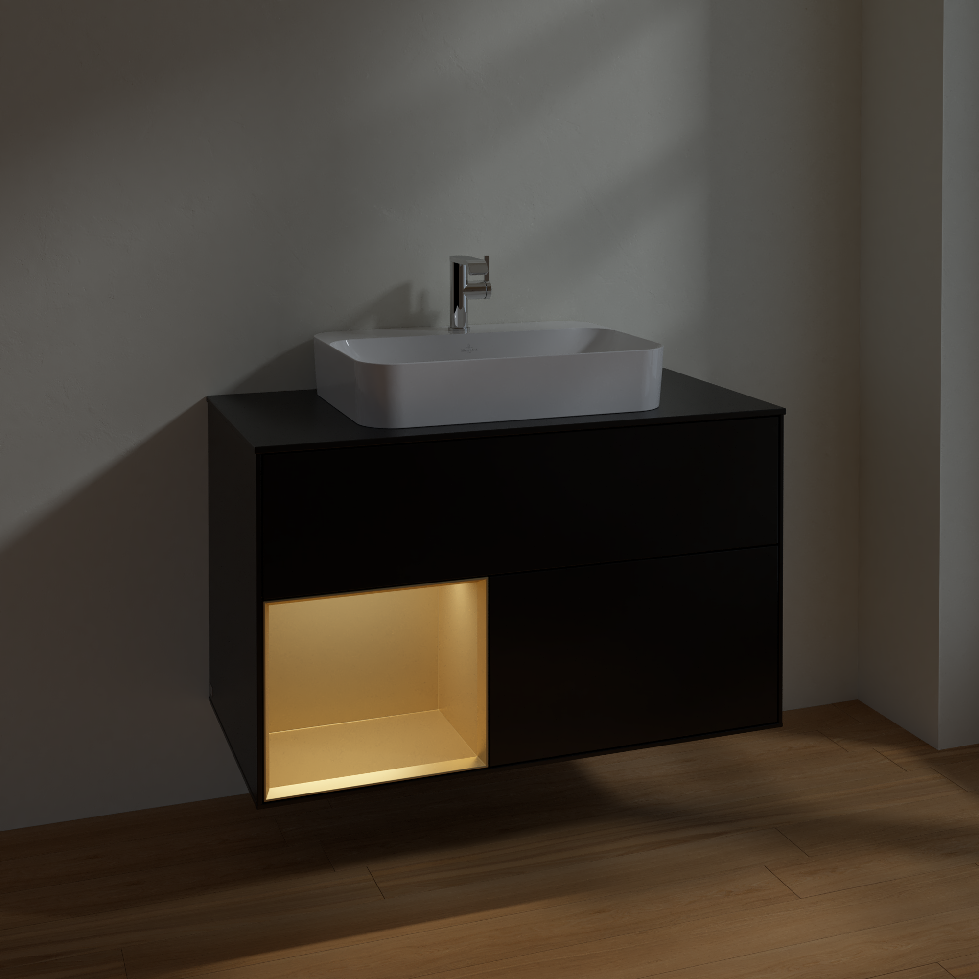 Finion Vanity unit, with lighting, 2 pull-out compartments, 1000x603x501mm, Body: Black Matt Lacquer, Front: Black Matt Lacquer, Shelf: Gold Matt Lacquer, Cover plate: Glass Black Matt