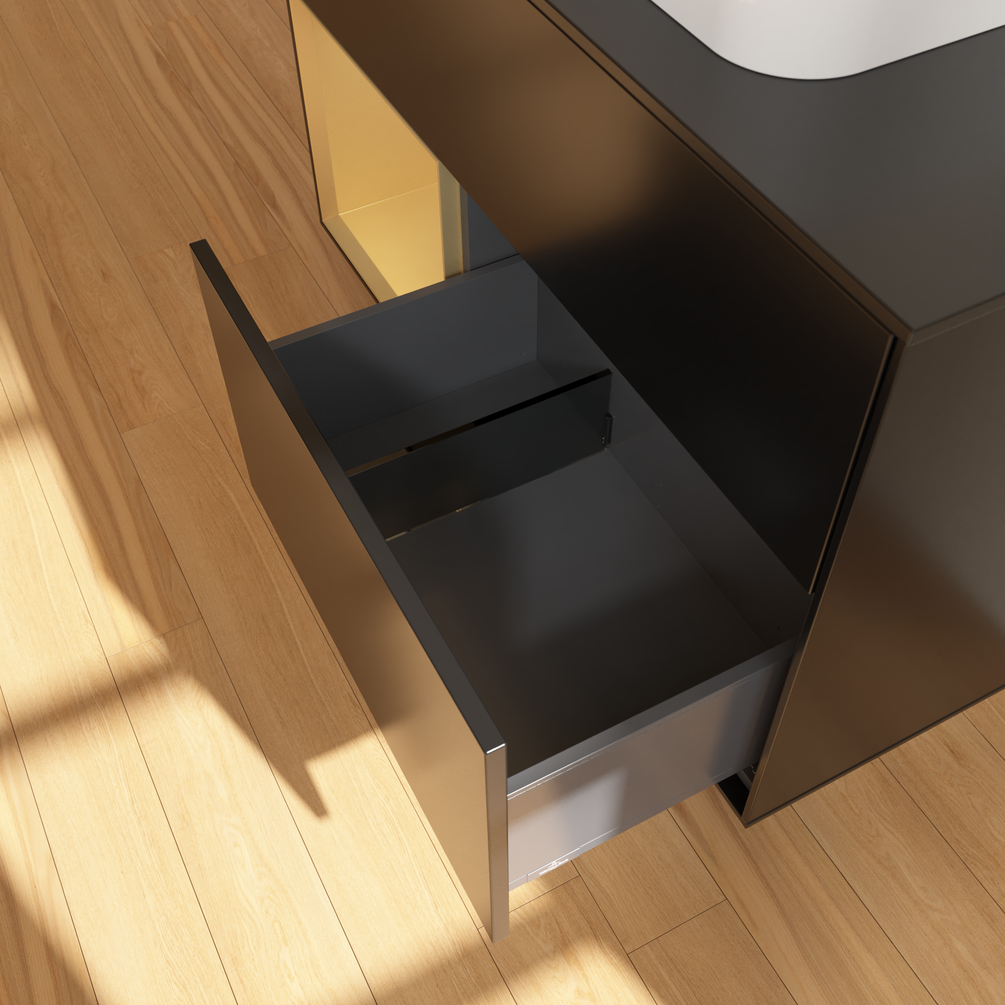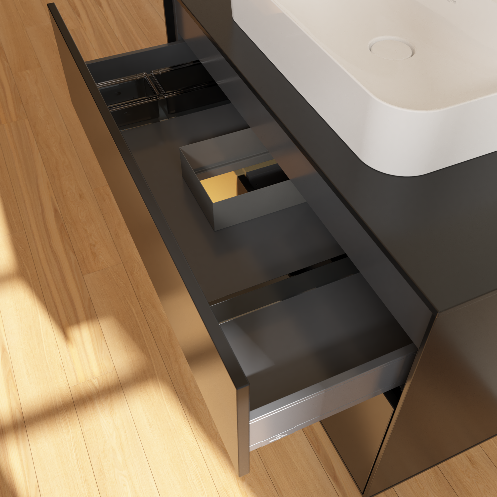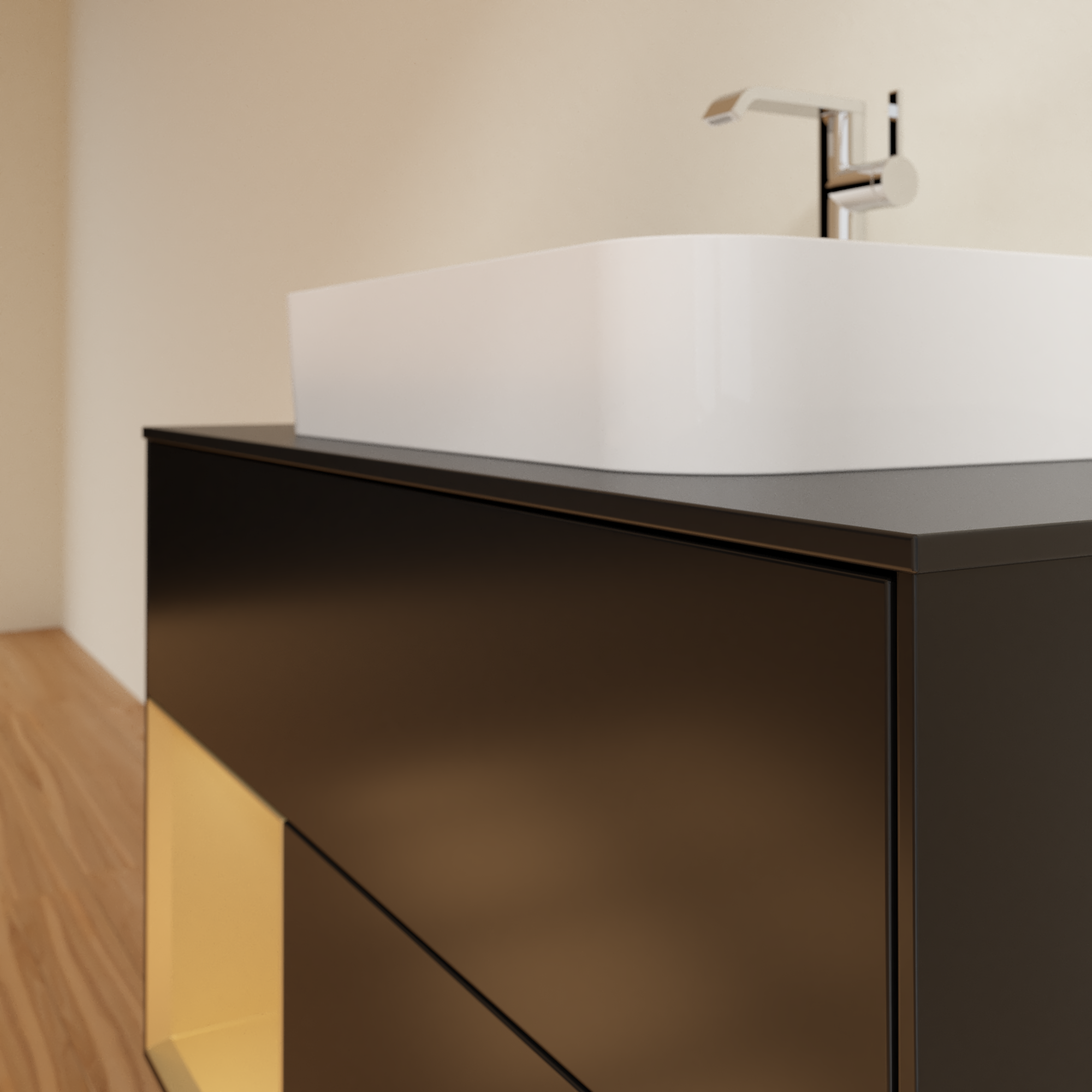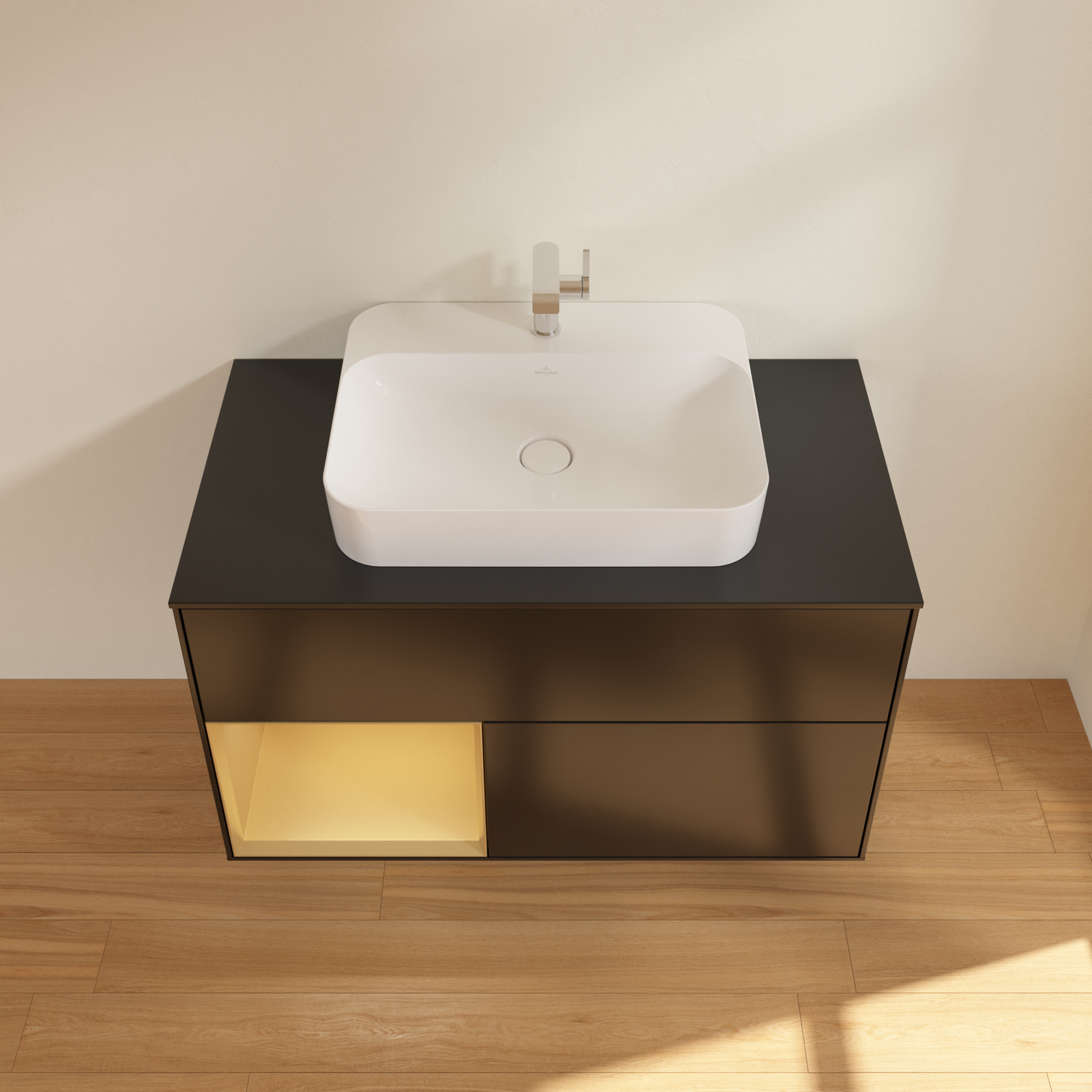 Finion Vanity unit, with lighting, 2 pull-out compartments, 1000x603x501mm, Body: Black Matt Lacquer, Front: Black Matt Lacquer, Shelf: Gold Matt Lacquer, Cover plate: Glass Black Matt