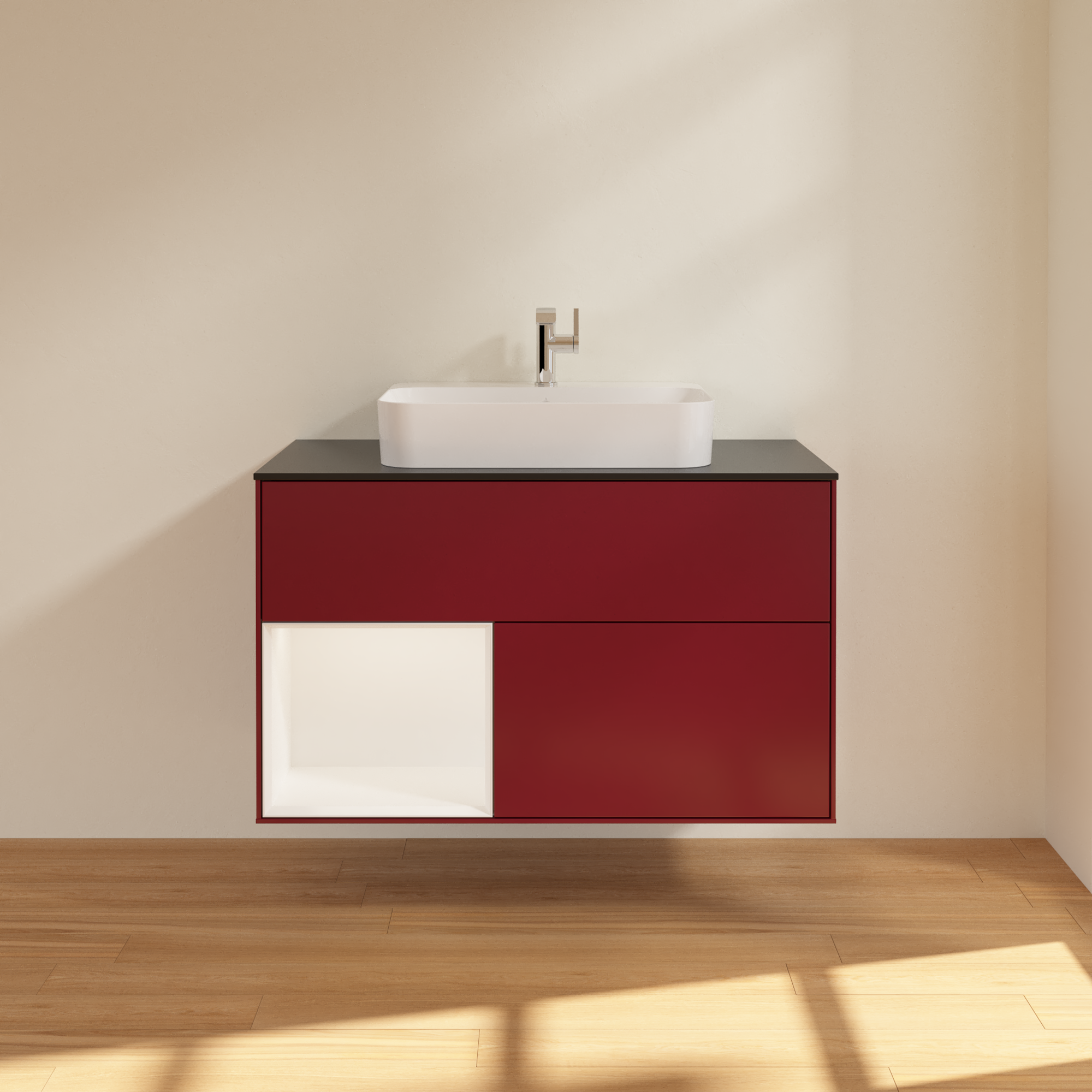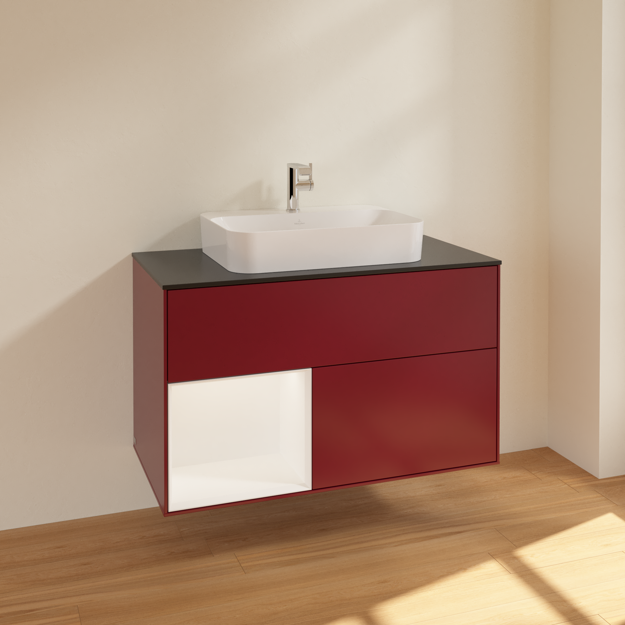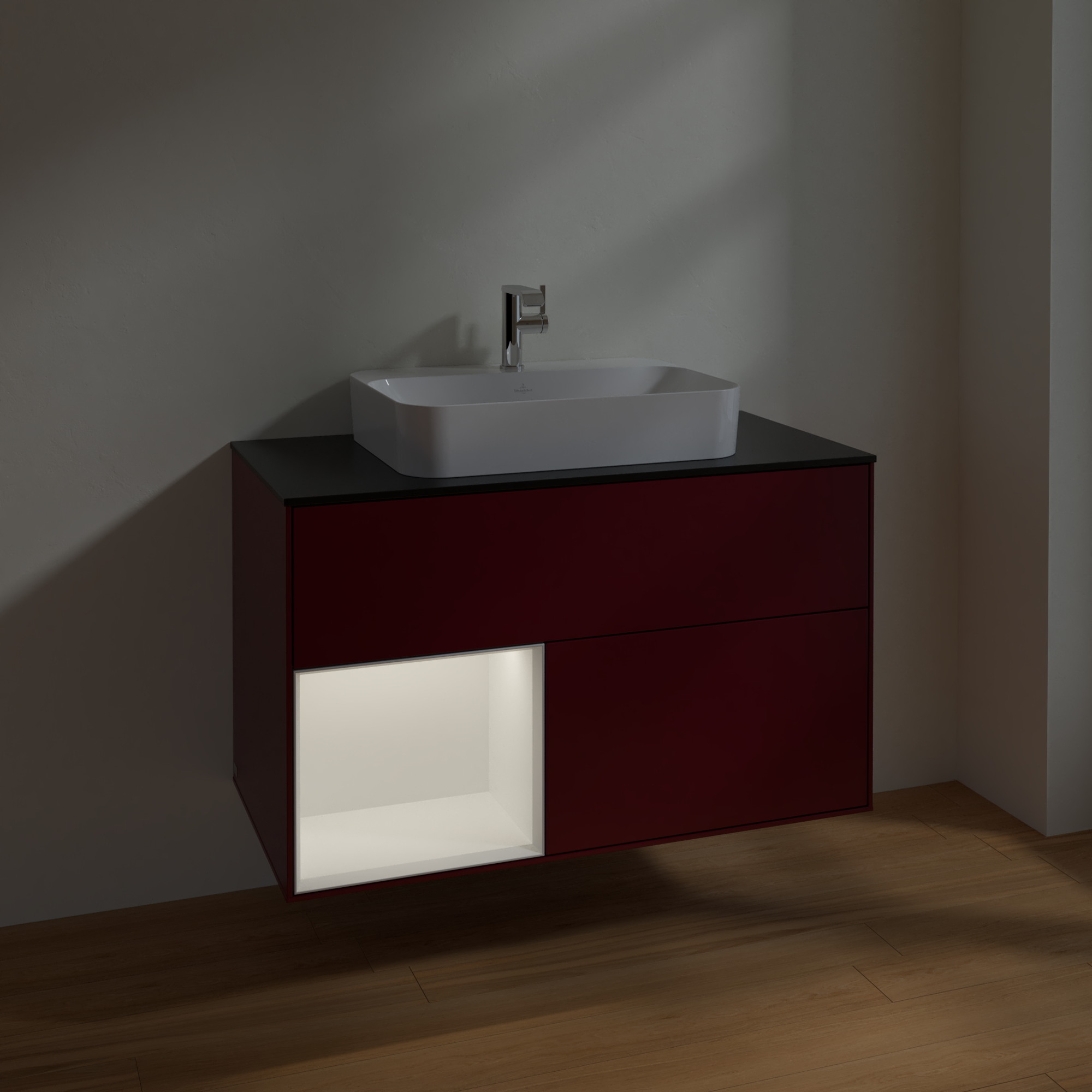 Finion Vanity unit, with lighting, 2 pull-out compartments, 1000x603x501mm, Body: Peony Matt Lacquer, Front: Peony Matt Lacquer, Shelf: White Matt Lacquer, Cover plate: Glass Black Matt