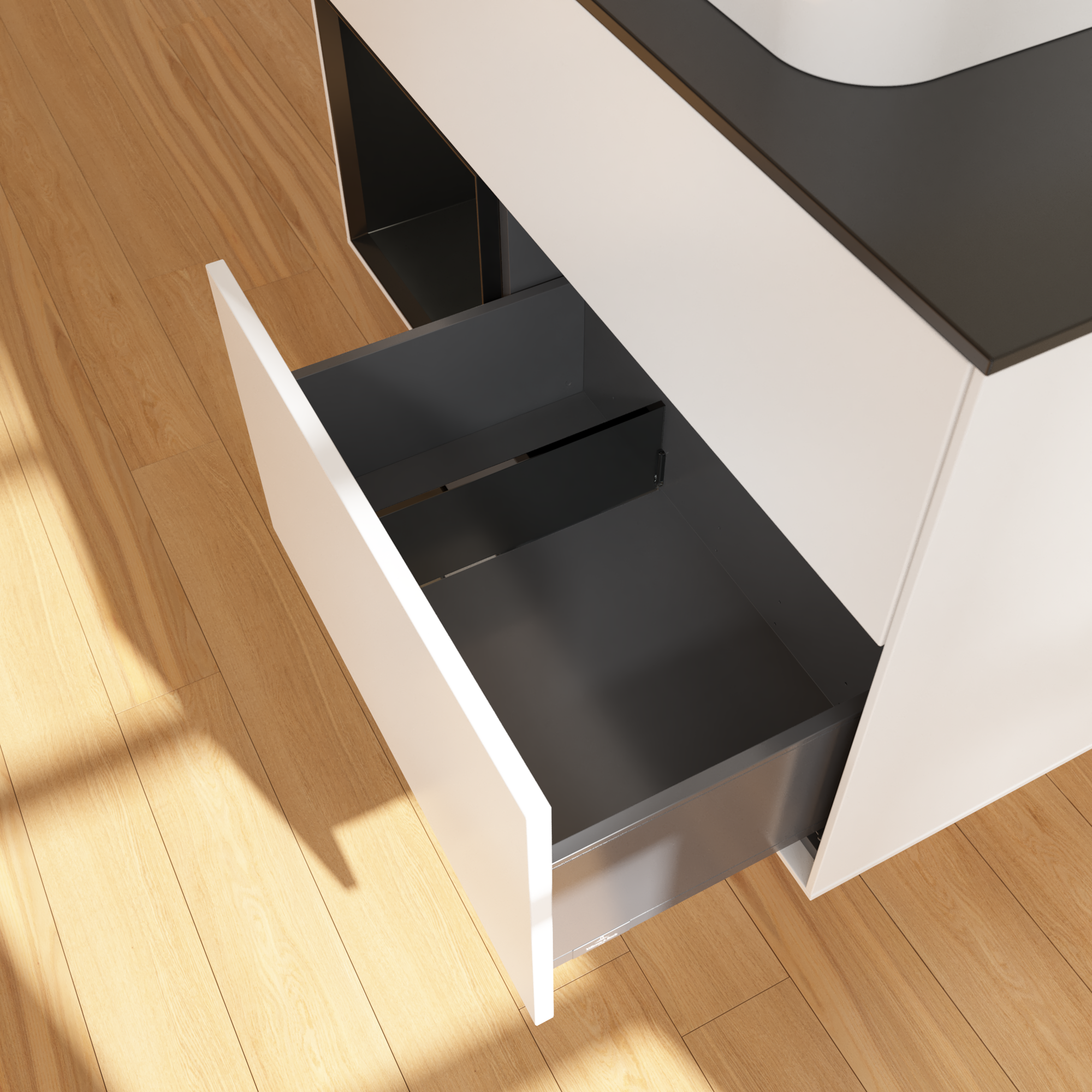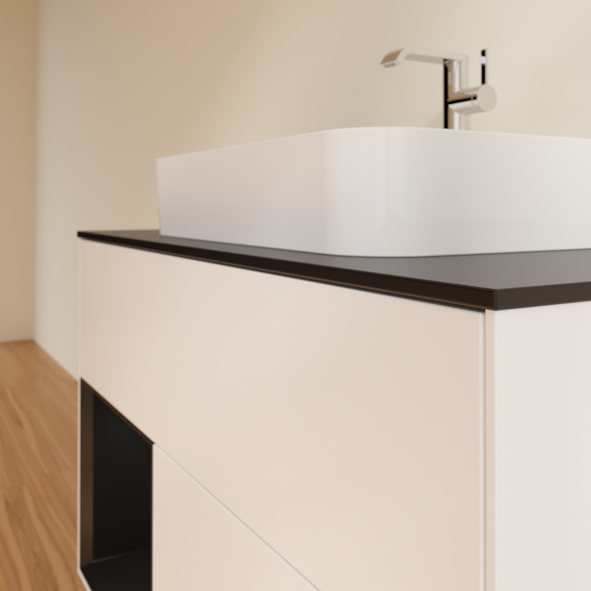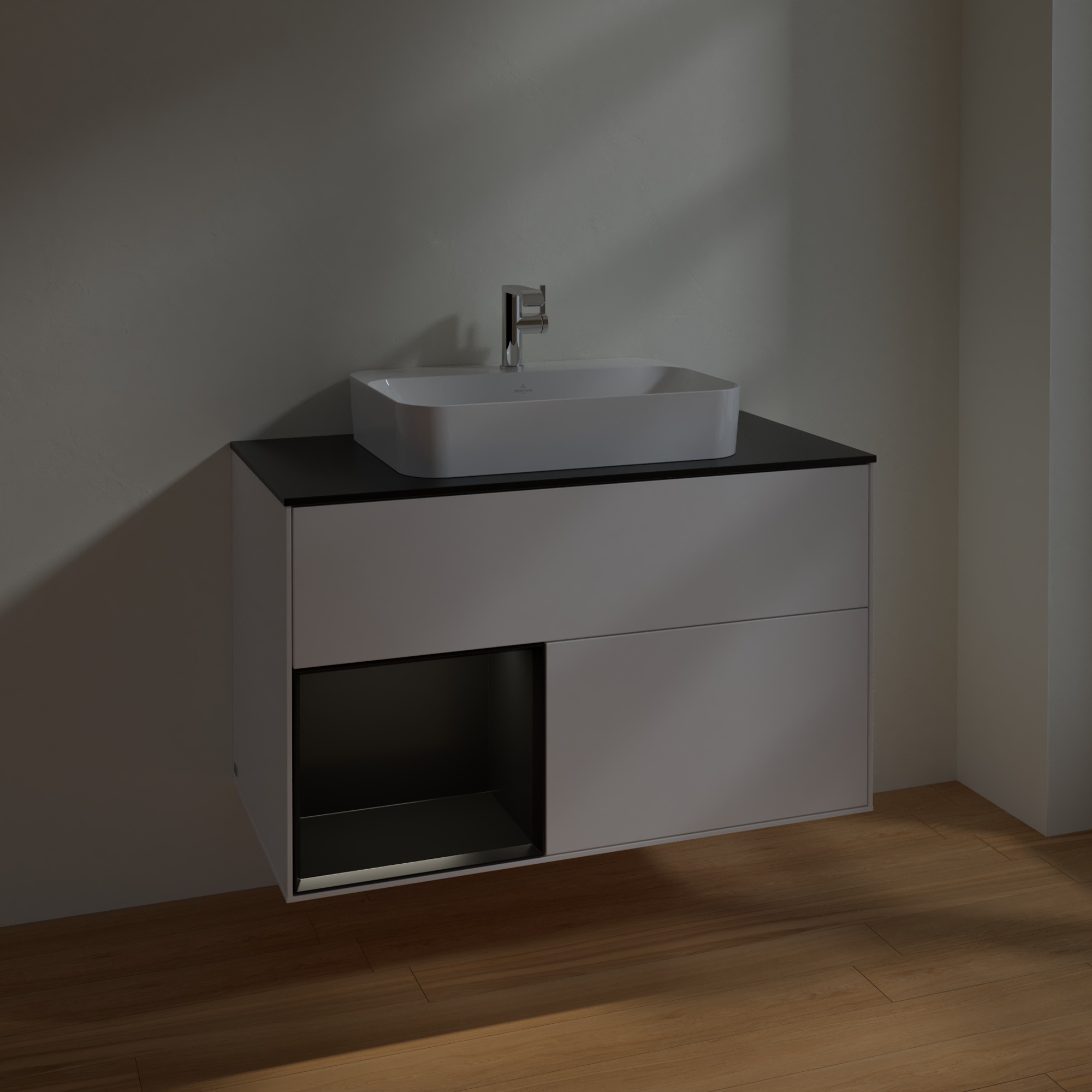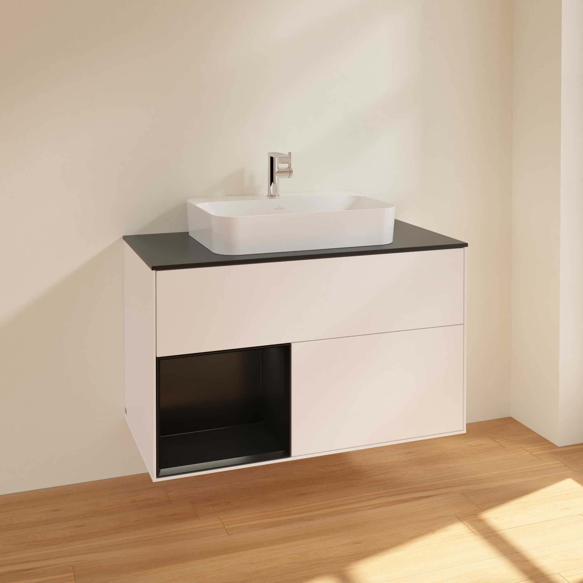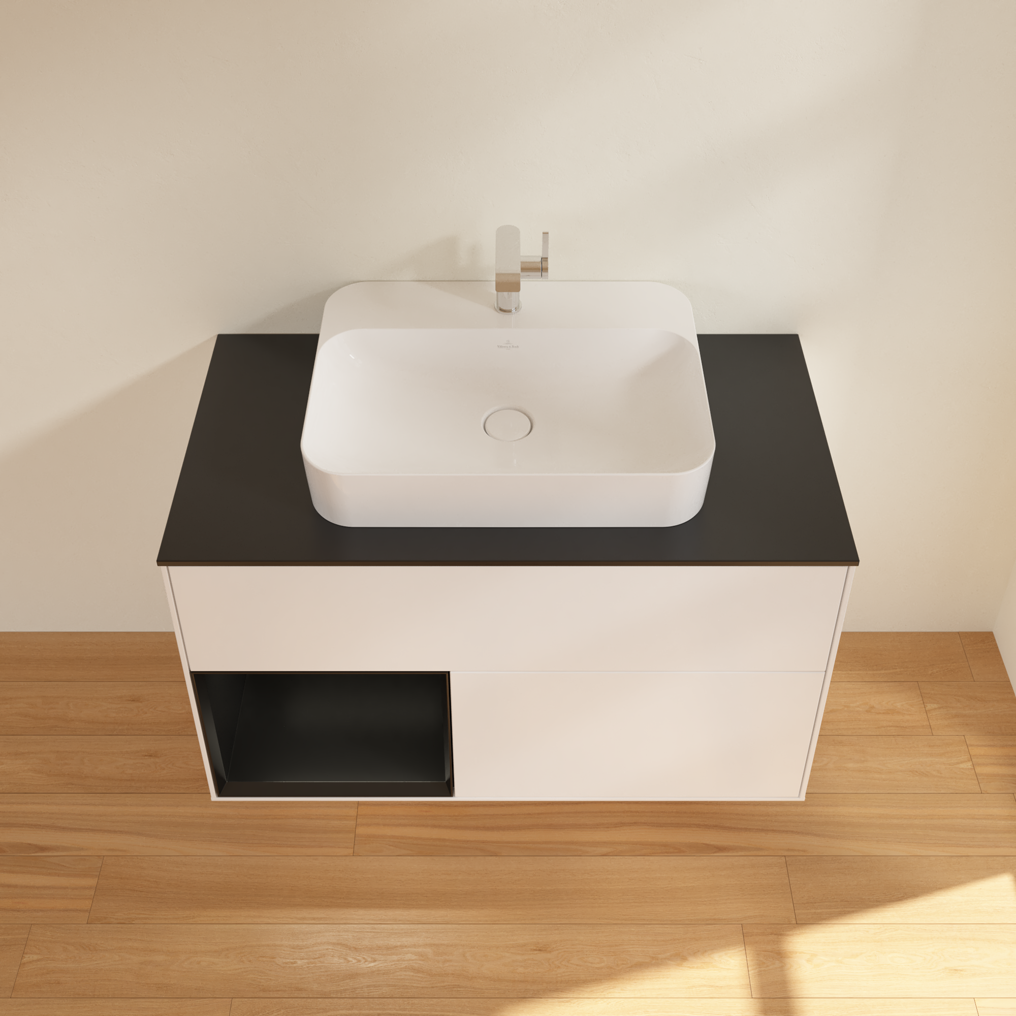 Finion Vanity unit, with lighting, 2 pull-out compartments, 1000x603x501mm, Body: White Matt Lacquer, Front: White Matt Lacquer, Shelf: Black Matt Lacquer, Cover plate: Glass Black Matt