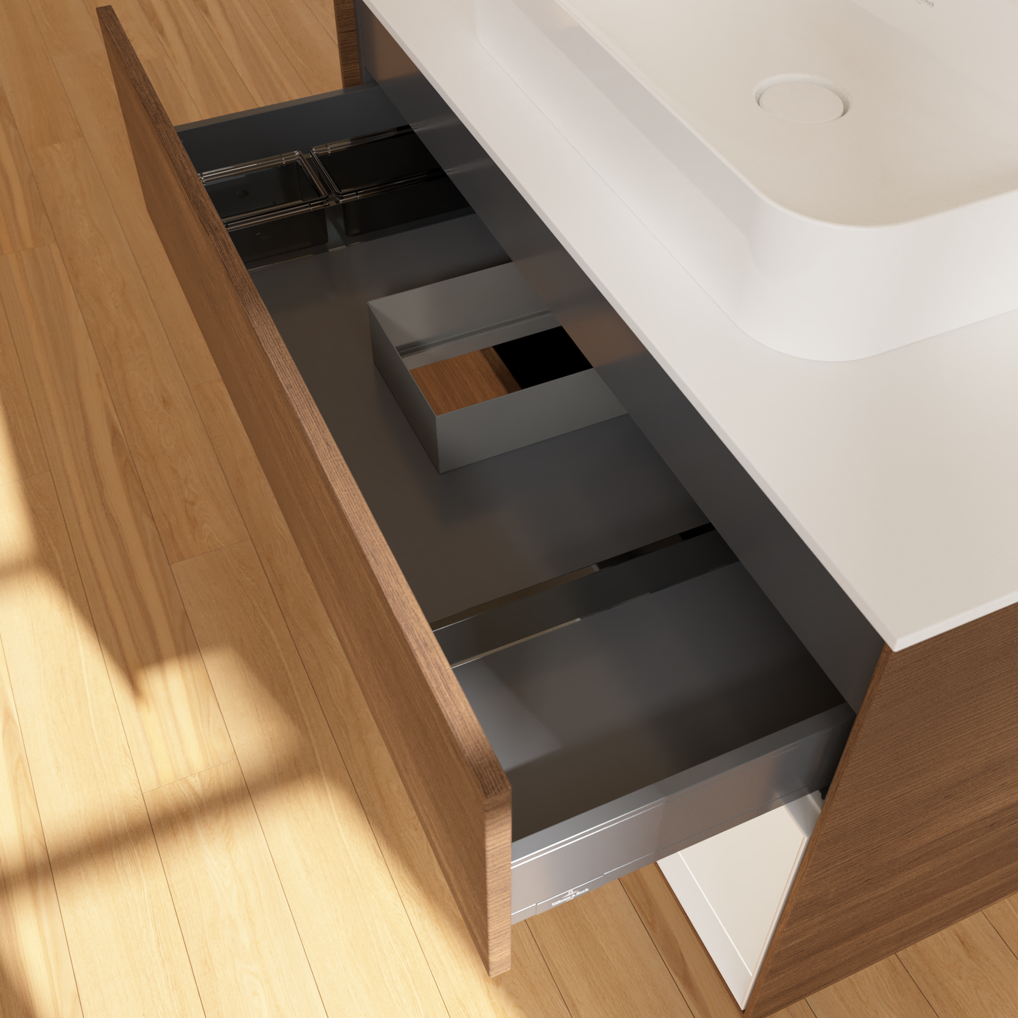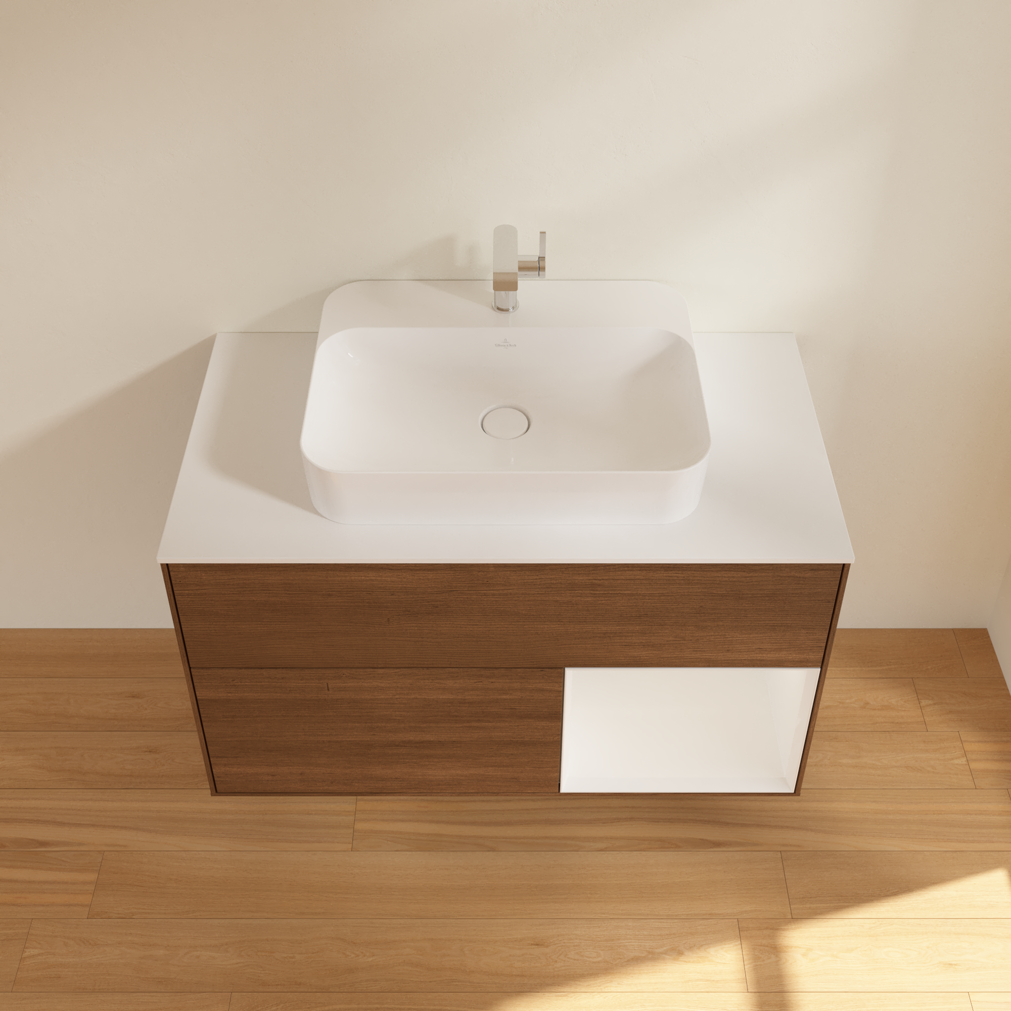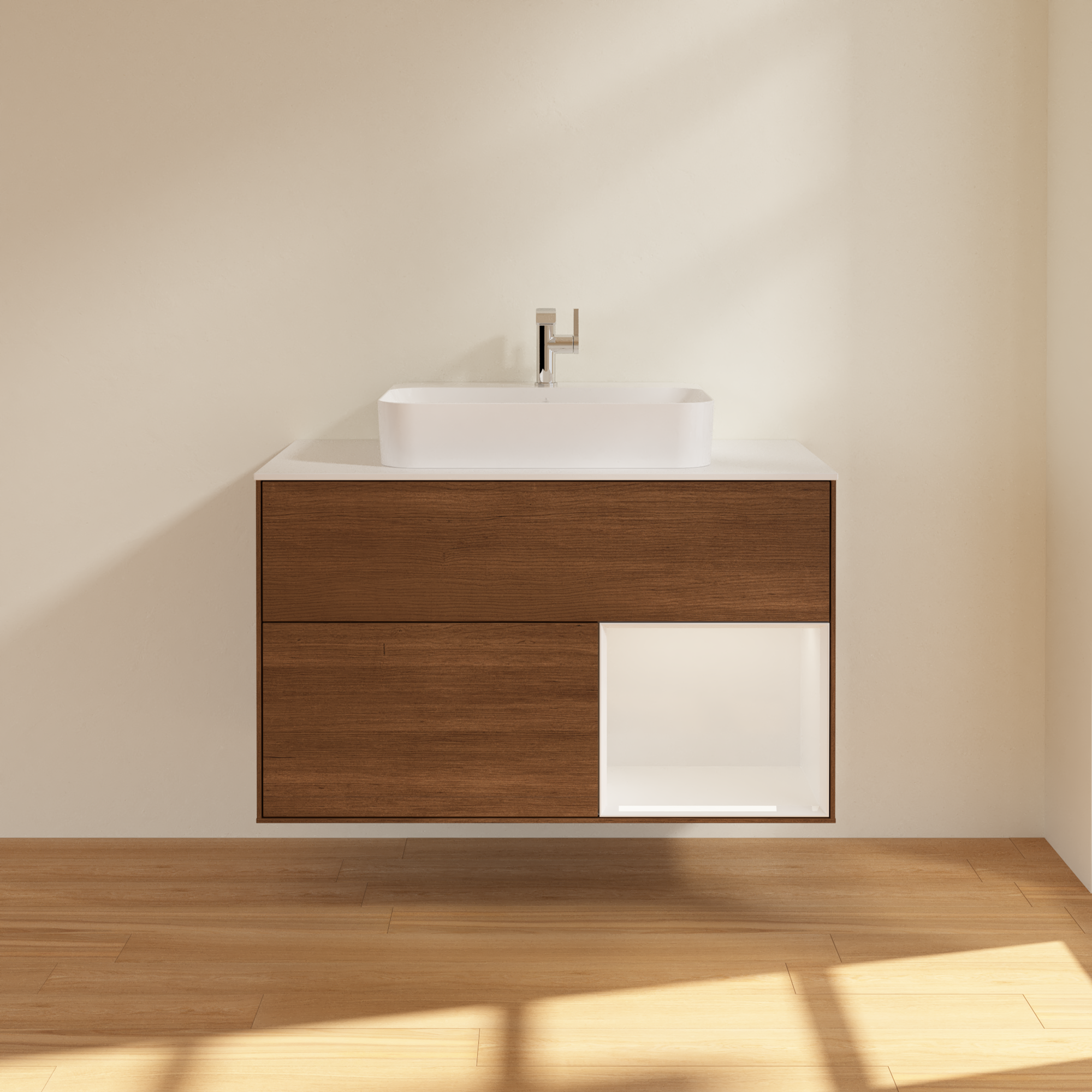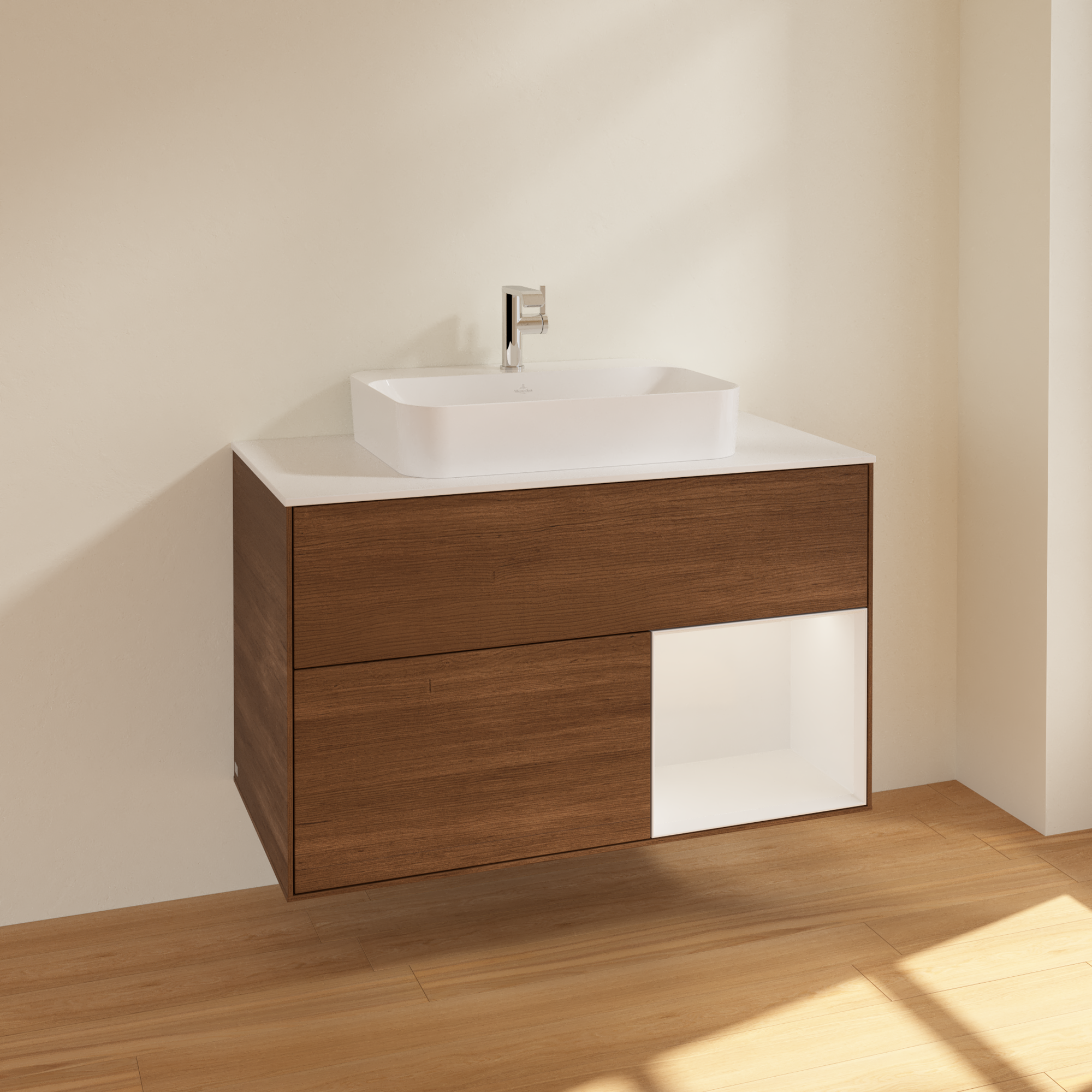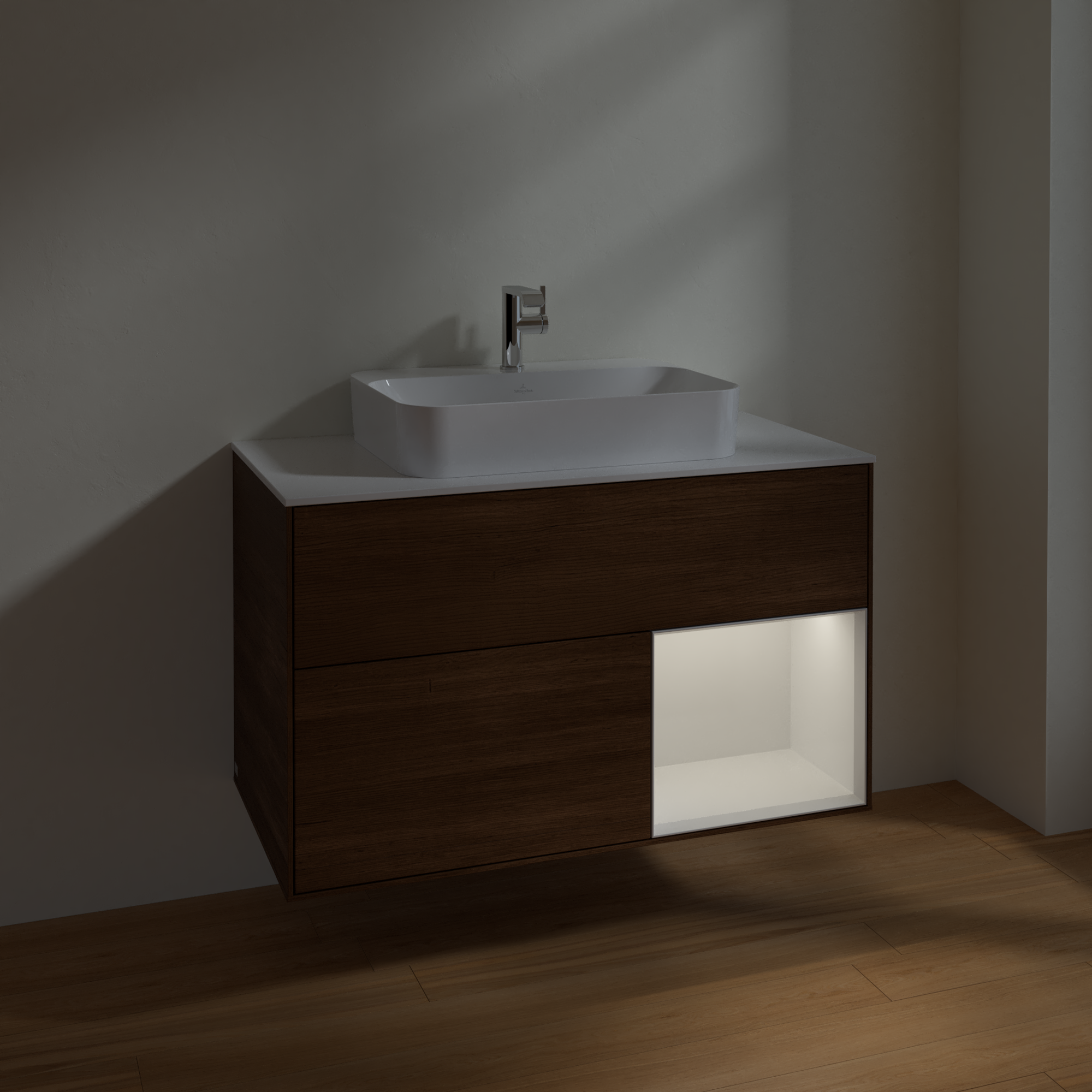 Finion Vanity unit, with lighting, 2 pull-out compartments, 1000x603x501mm, Body: Walnut Veneer, Front: Walnut Veneer, Shelf: Glossy White Lacquer, Cover plate: Glass White Matt