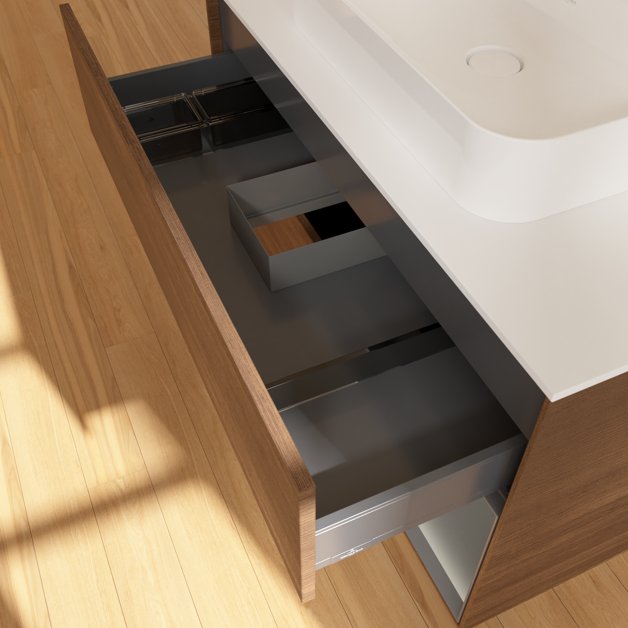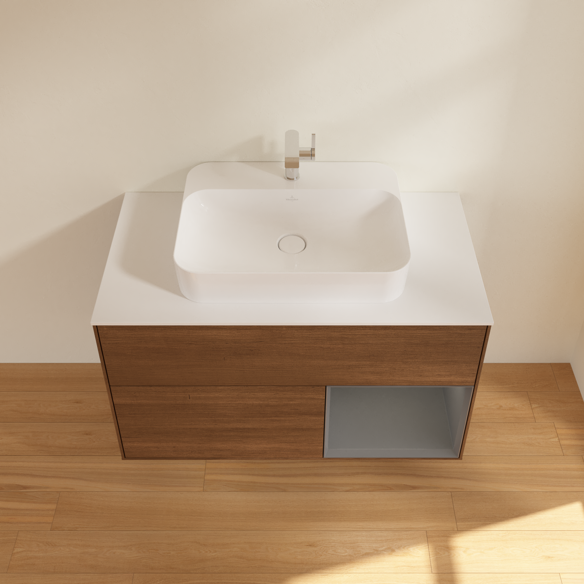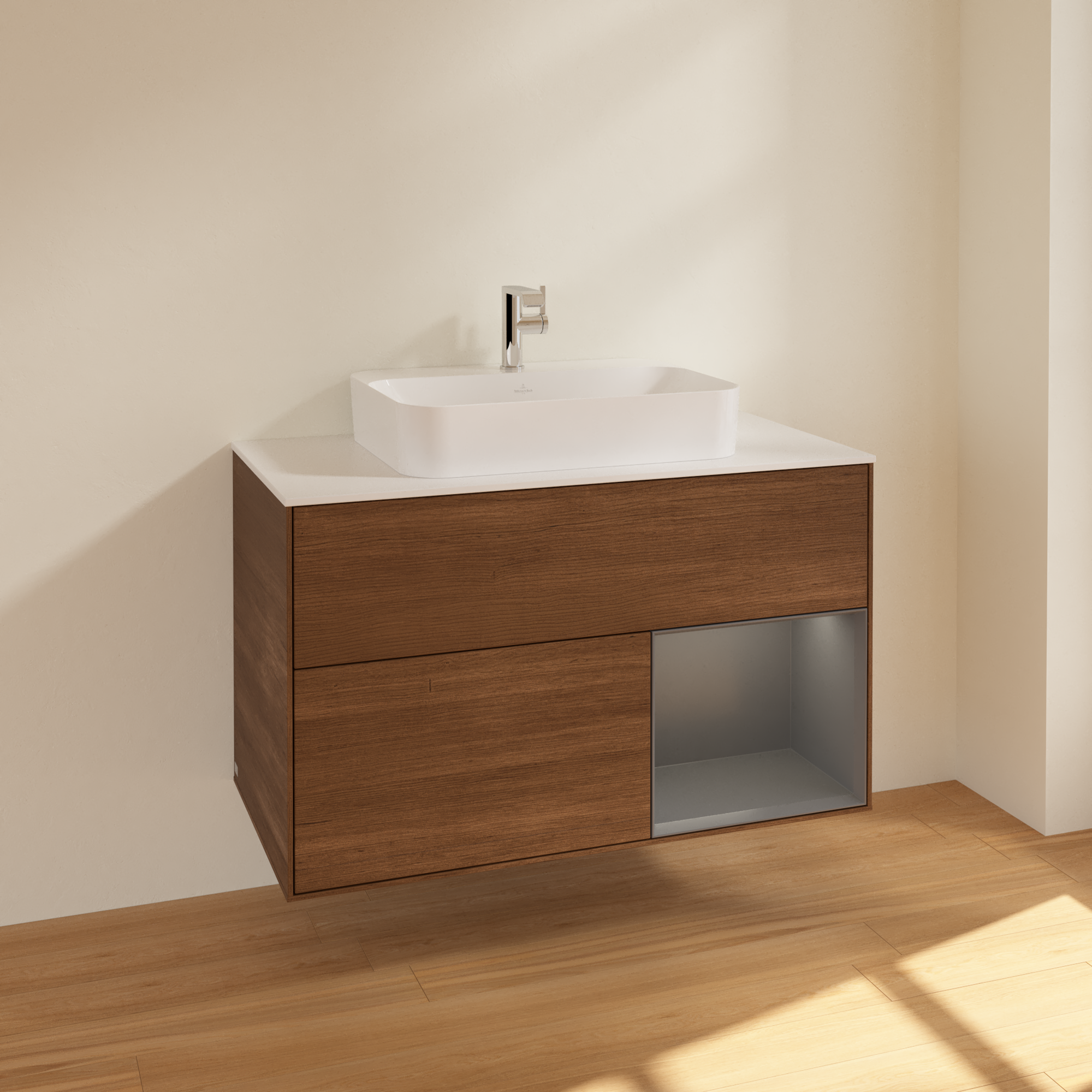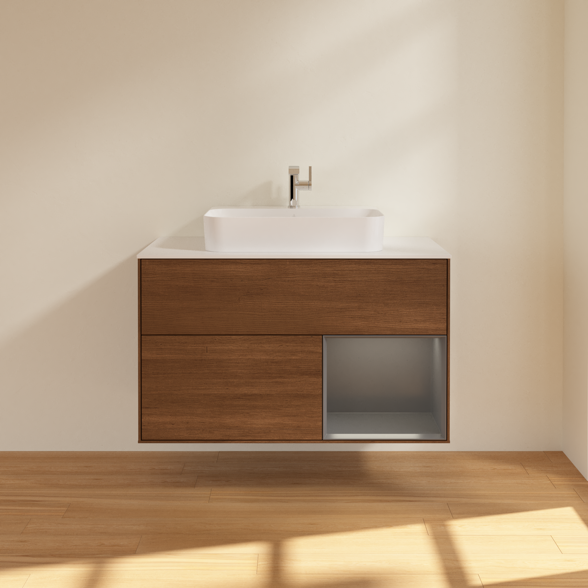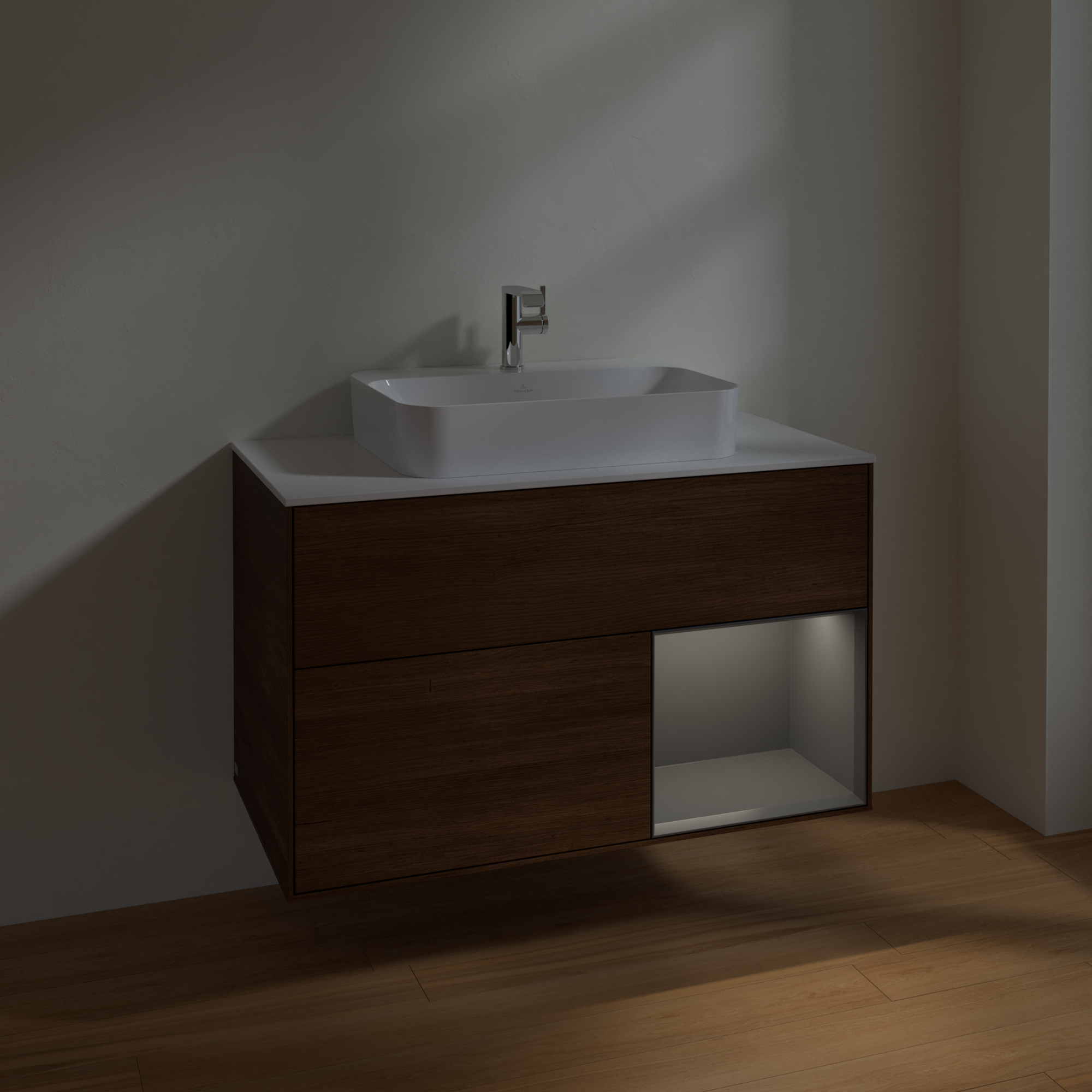 Finion Vanity unit, with lighting, 2 pull-out compartments, 1000x603x501mm, Body: Walnut Veneer, Front: Walnut Veneer, Shelf: Anthracite Matt Lacquer, Cover plate: Glass White Matt