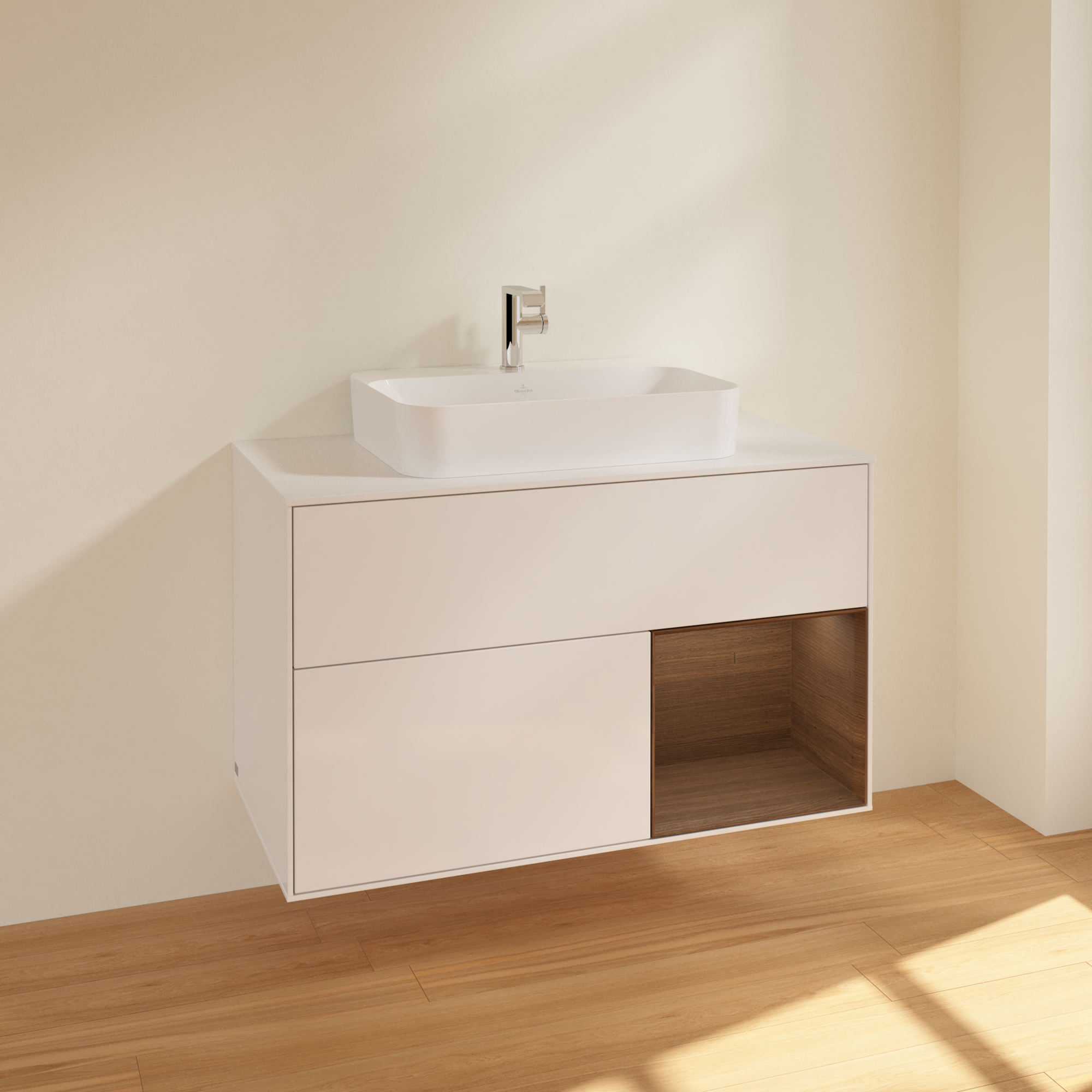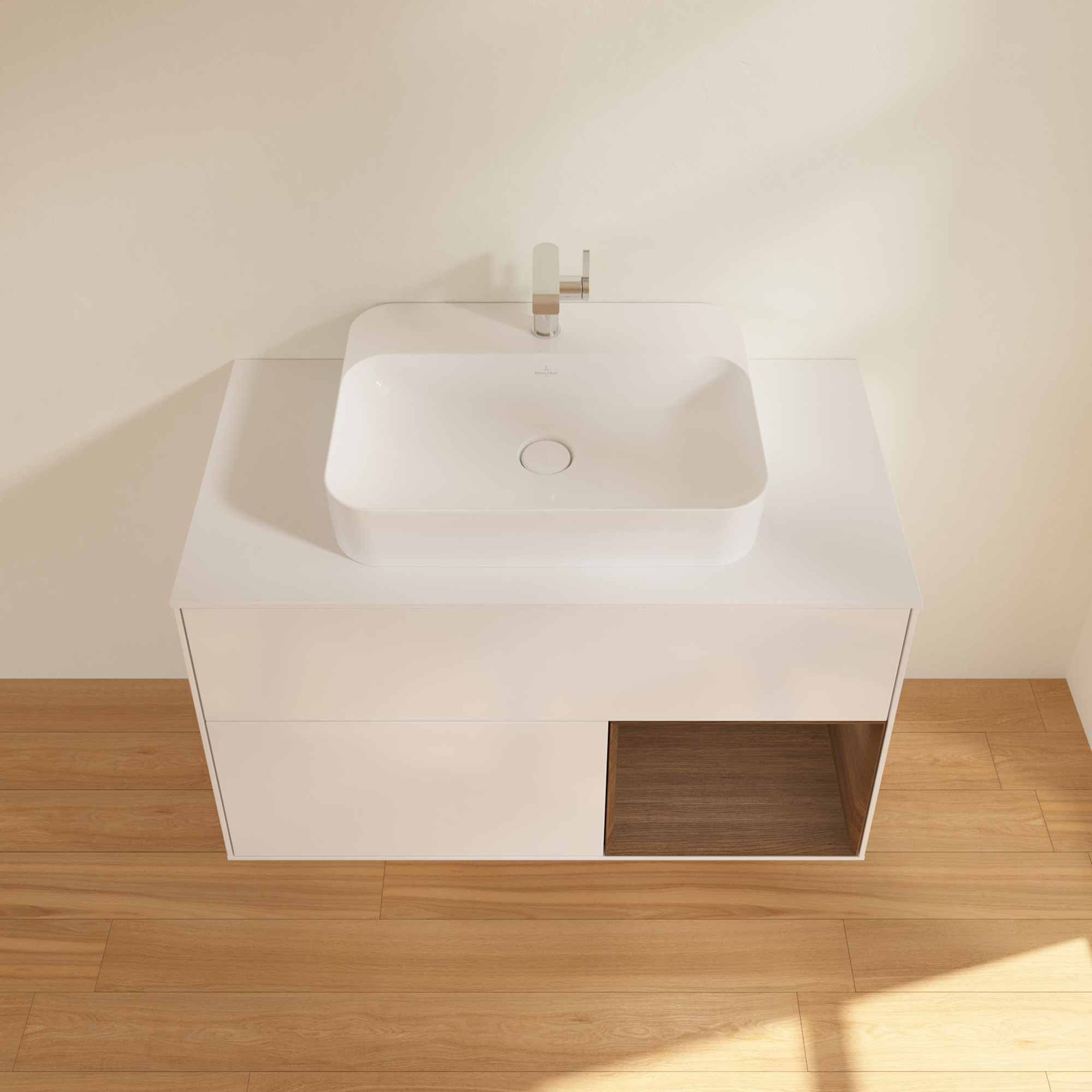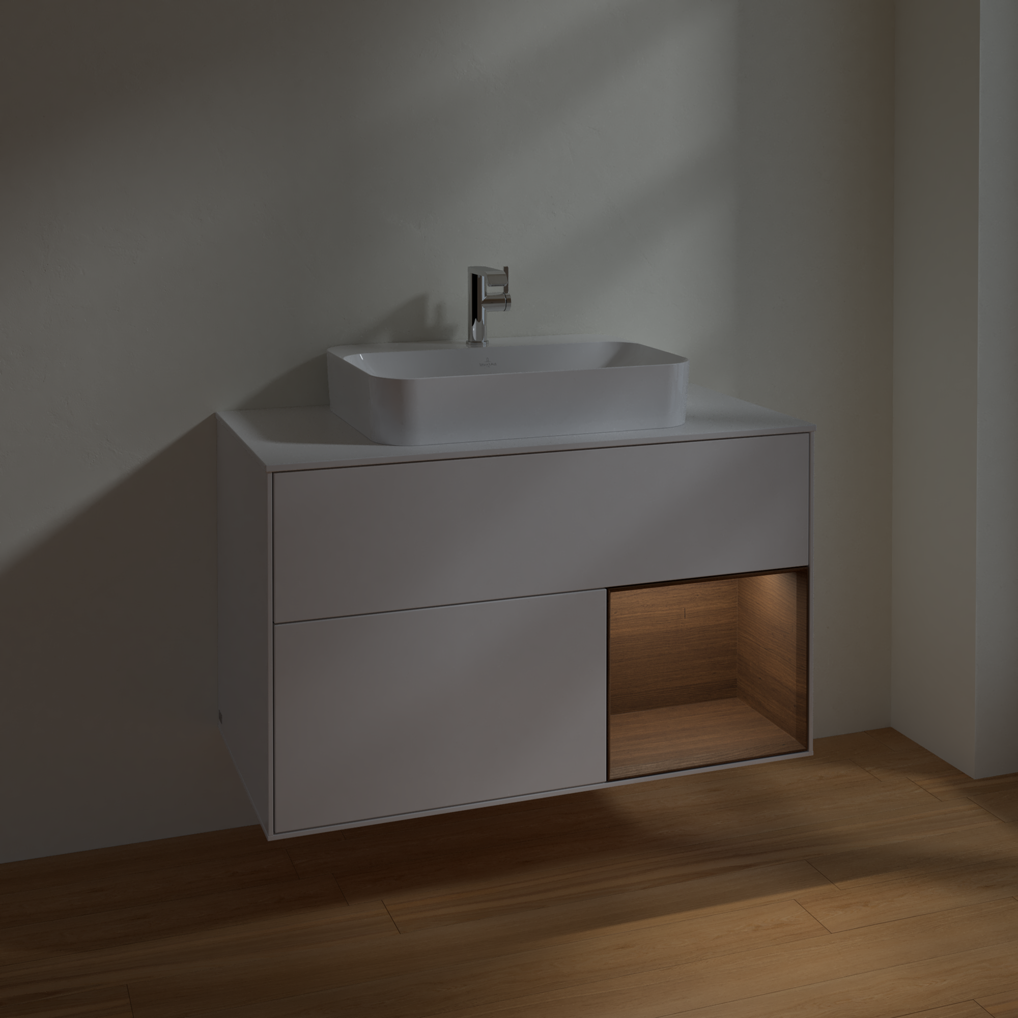 Finion Vanity unit, with lighting, 2 pull-out compartments, 1000x603x501mm, Body: Glossy White Lacquer, Front: Glossy White Lacquer, Shelf: Walnut Veneer, Cover plate: Glass White Matt