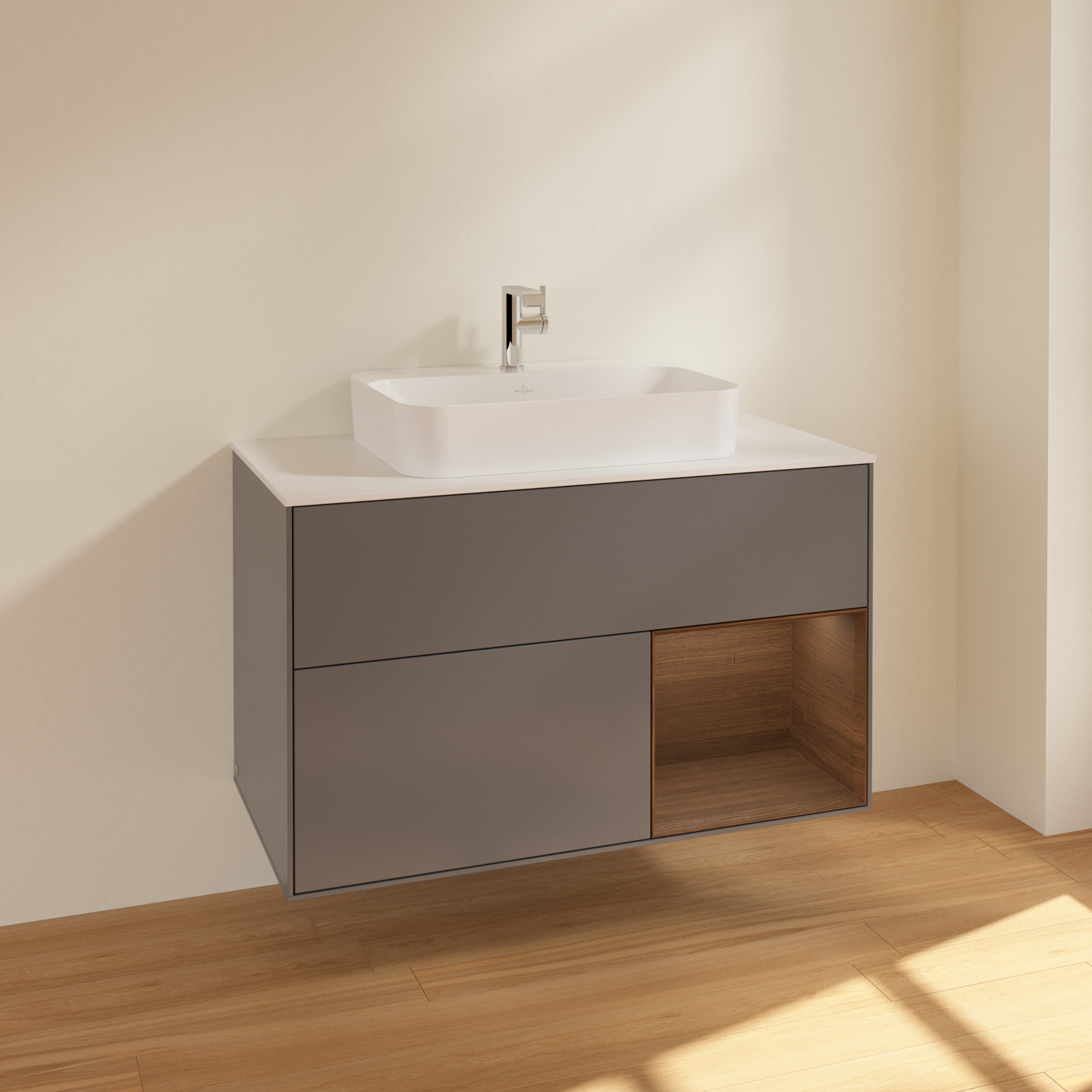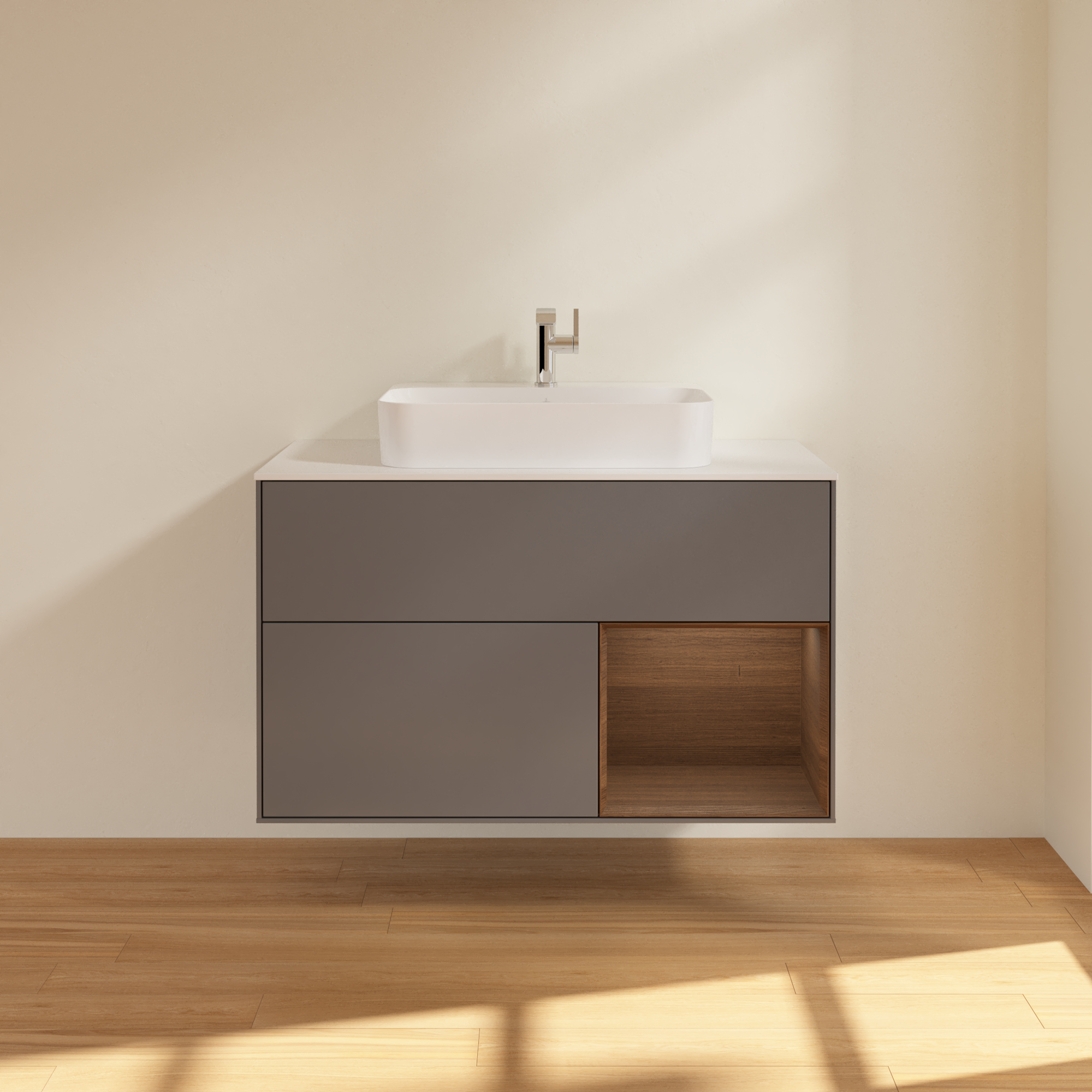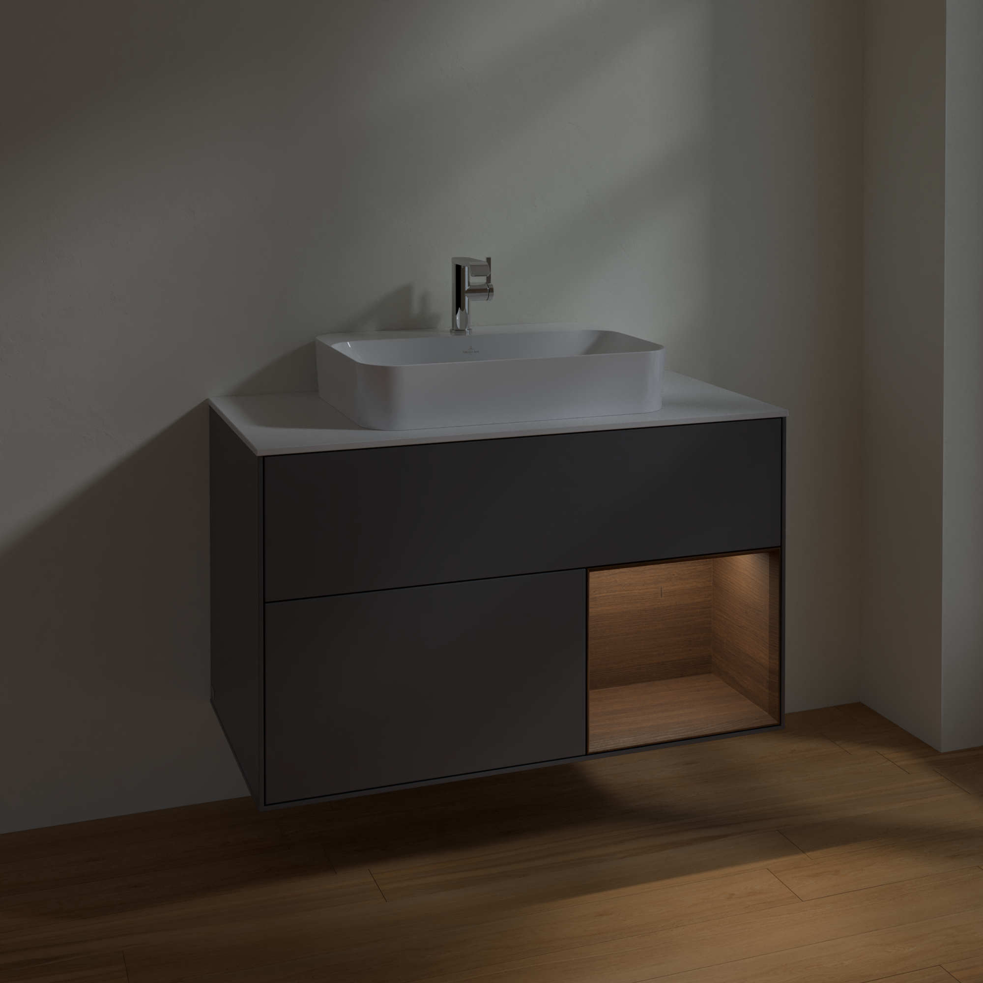 Finion Vanity unit, with lighting, 2 pull-out compartments, 1000x603x501mm, Body: Anthracite Matt Lacquer, Front: Anthracite Matt Lacquer, Shelf: Walnut Veneer, Cover plate: Glass White Matt