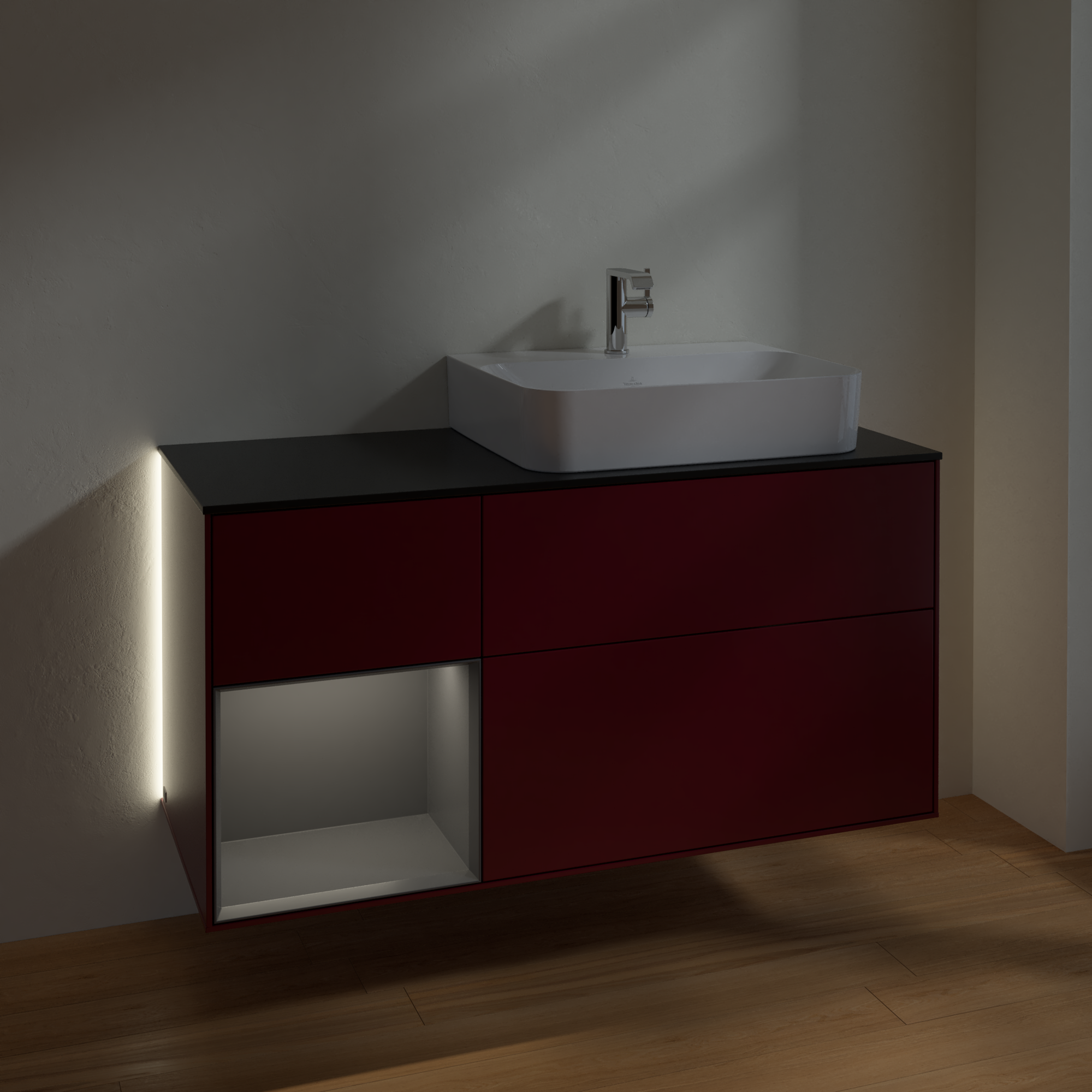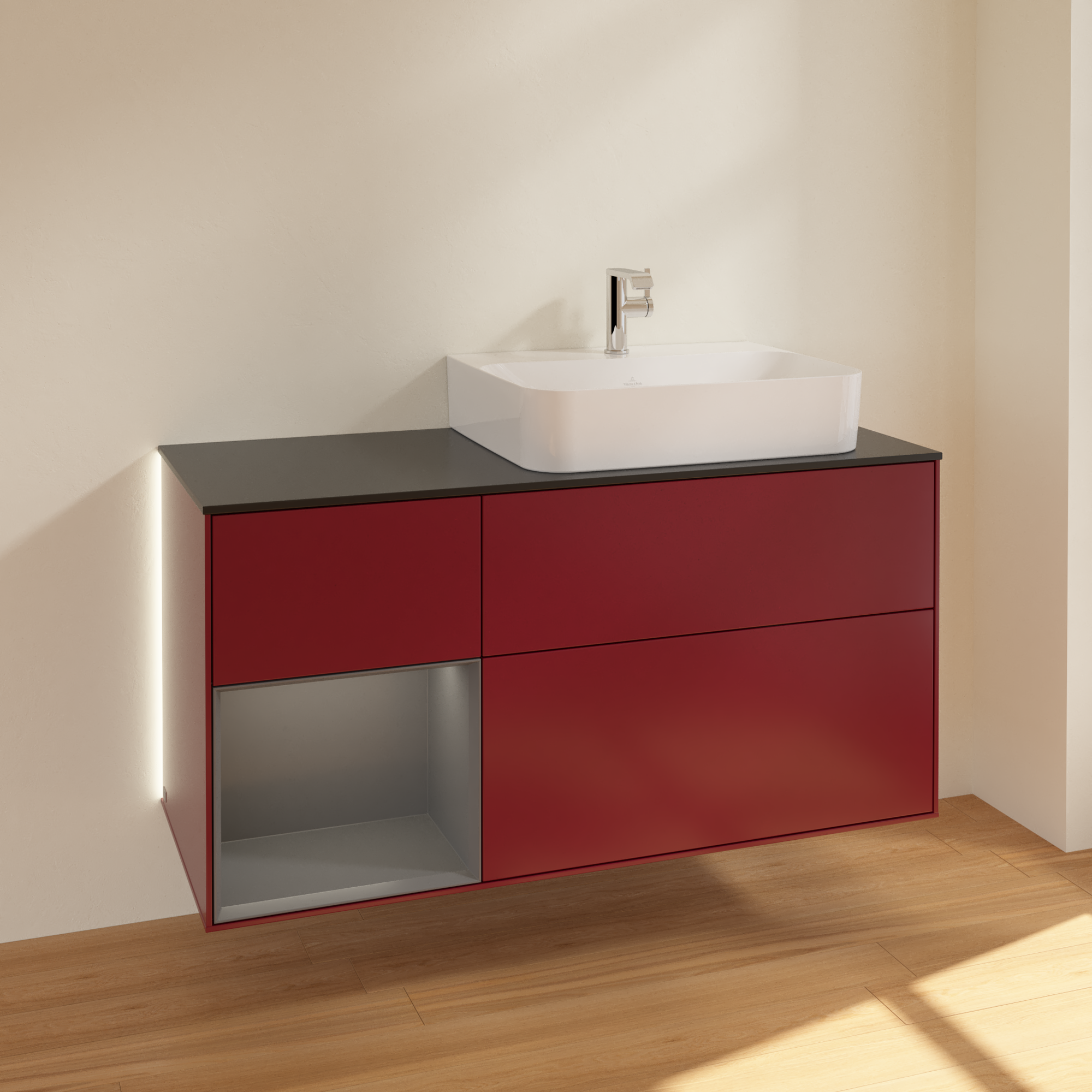 Finion Vanity unit, with lighting, 3 pull-out compartments, 1200x603x501mm, Body: Peony Matt Lacquer, Front: Peony Matt Lacquer, Shelf: Anthracite Matt Lacquer, Cover plate: Glass Black Matt