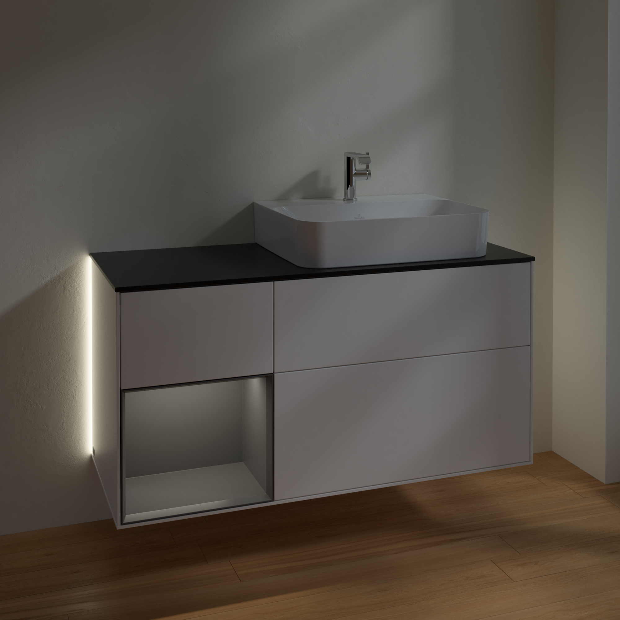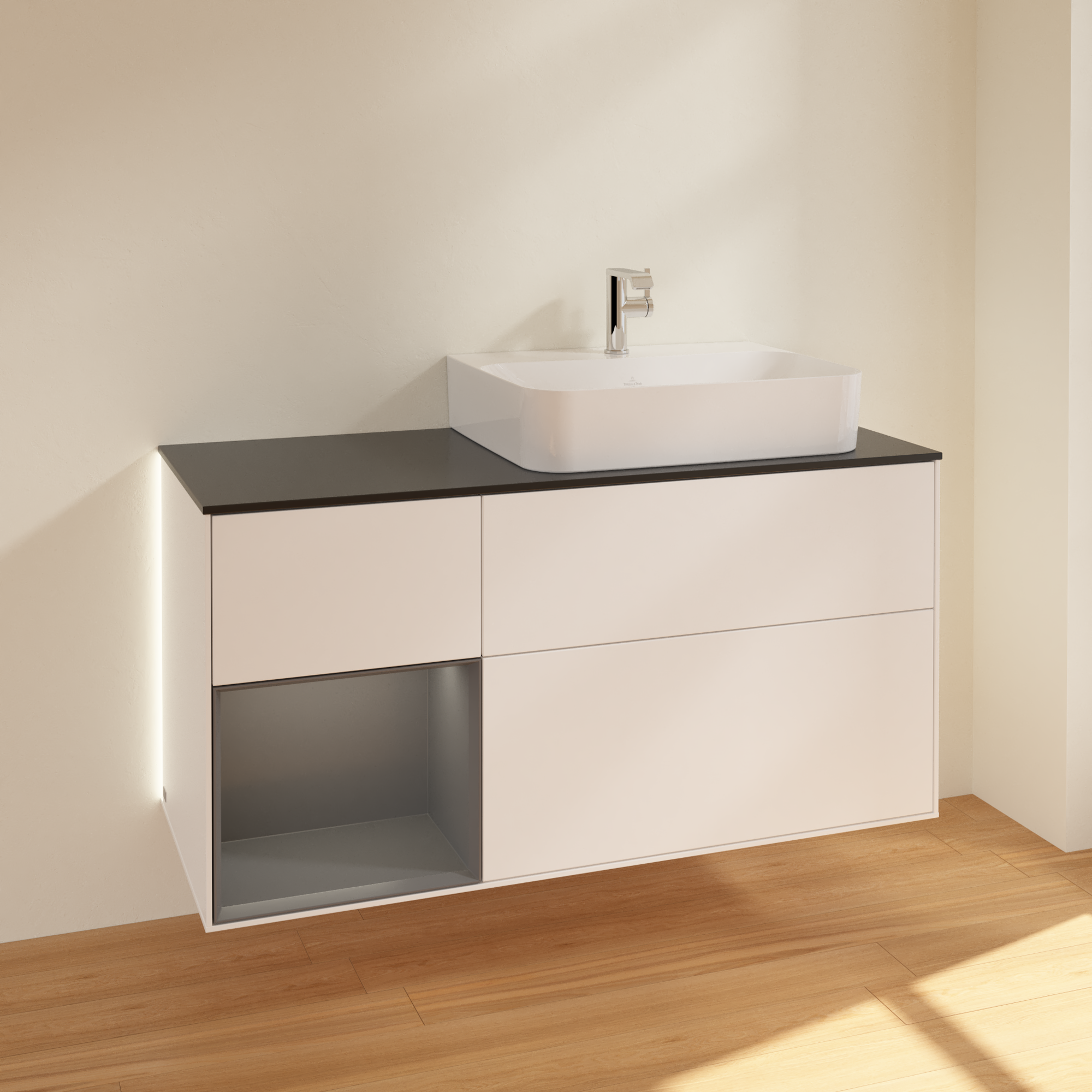 Finion Vanity unit, with lighting, 3 pull-out compartments, 1200x603x501mm, Body: White Matt Lacquer, Front: White Matt Lacquer, Shelf: Anthracite Matt Lacquer, Cover plate: Glass Black Matt
