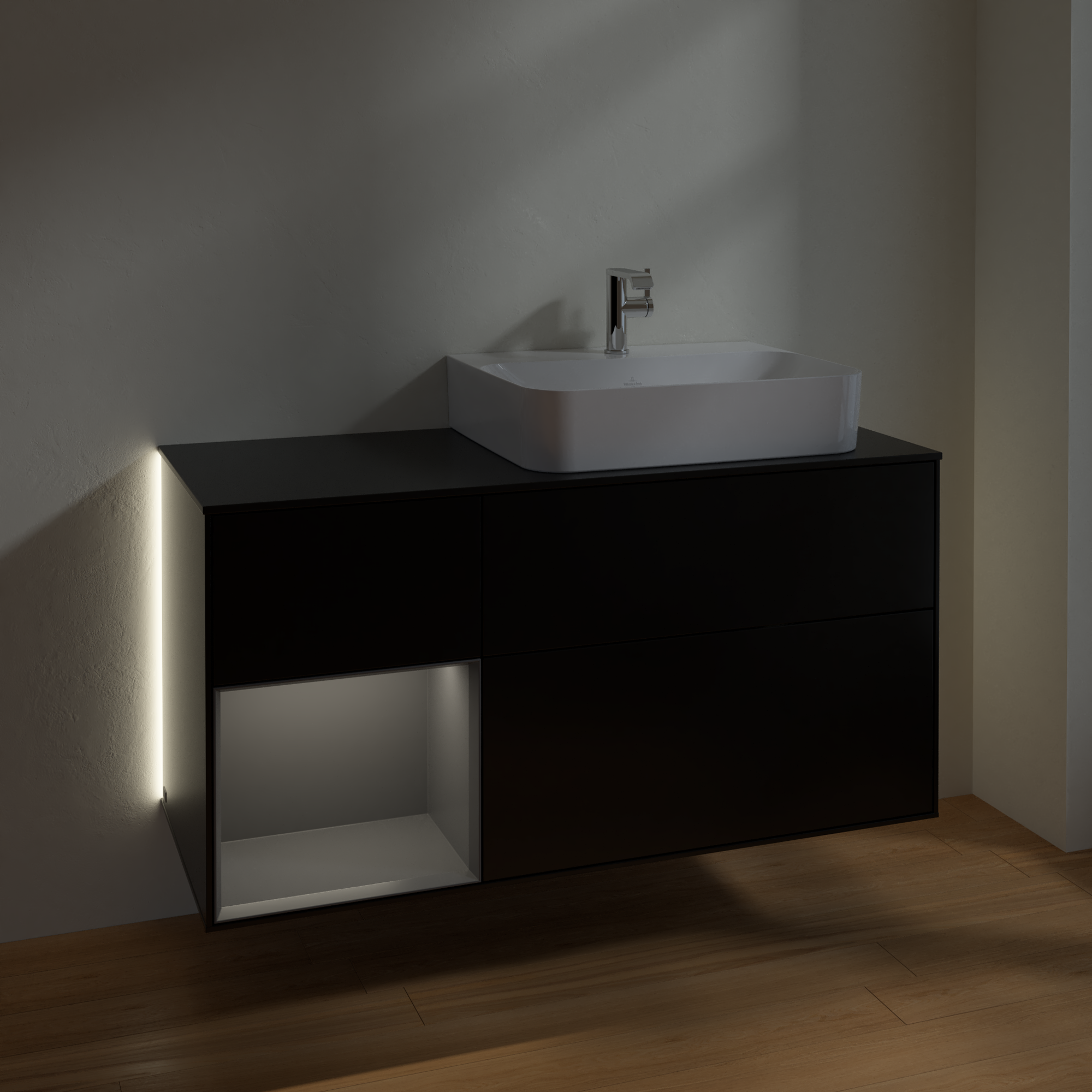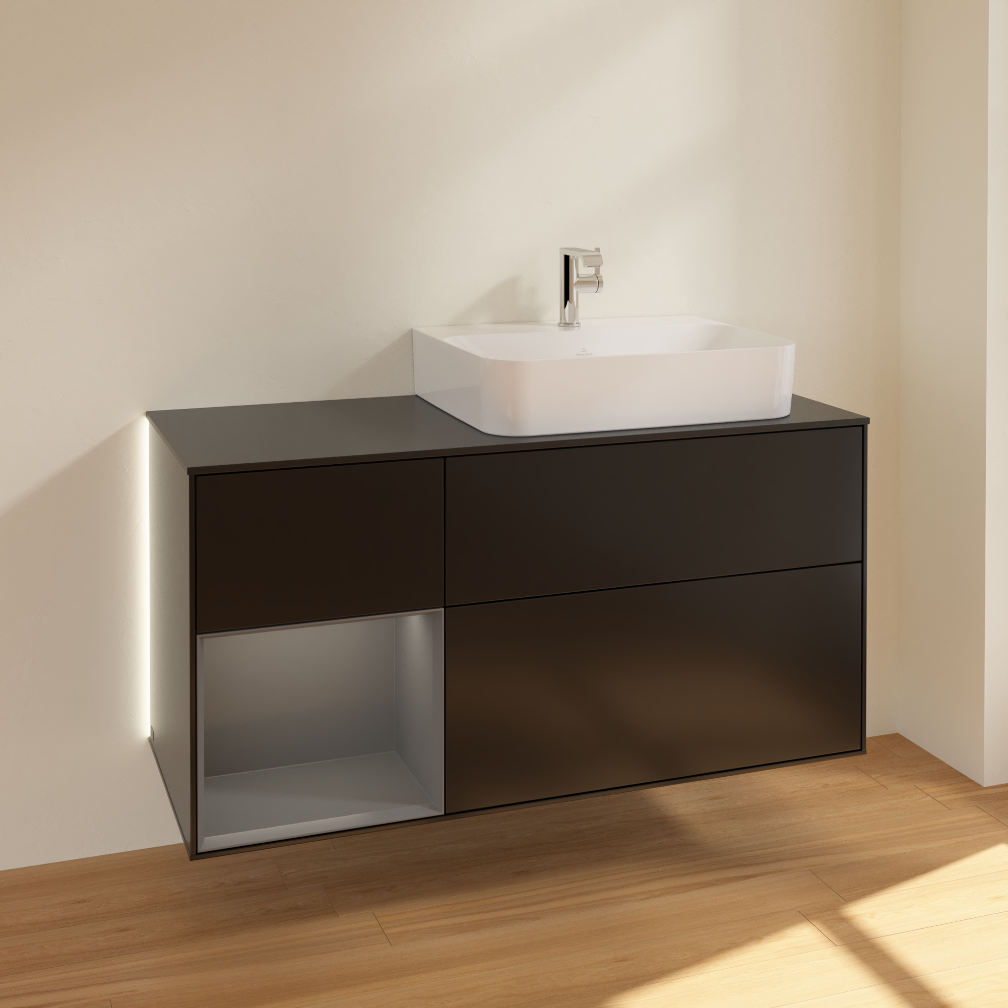 Finion Vanity unit, with lighting, 3 pull-out compartments, 1200x603x501mm, Body: Black Matt Lacquer, Front: Black Matt Lacquer, Shelf: Anthracite Matt Lacquer, Cover plate: Glass Black Matt
