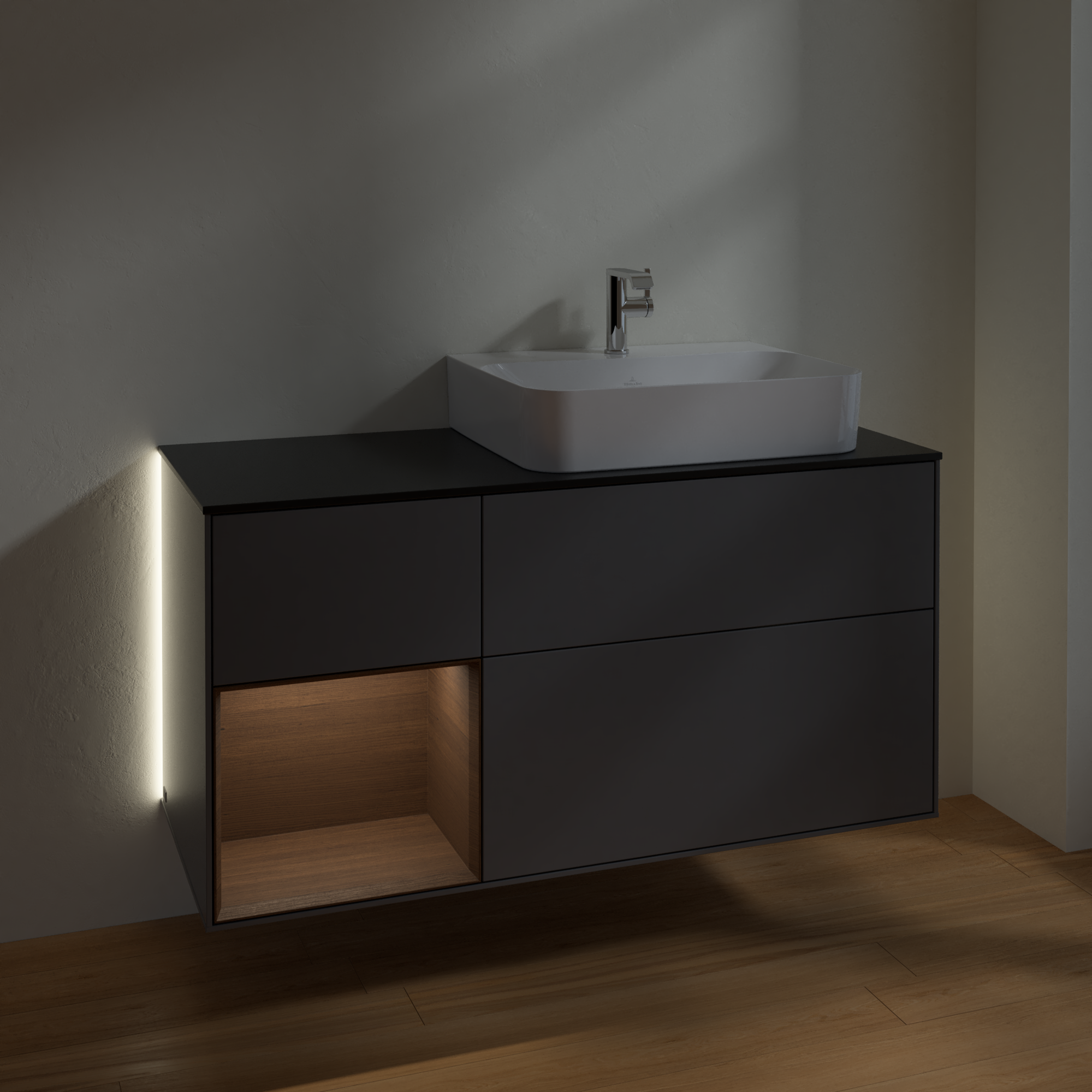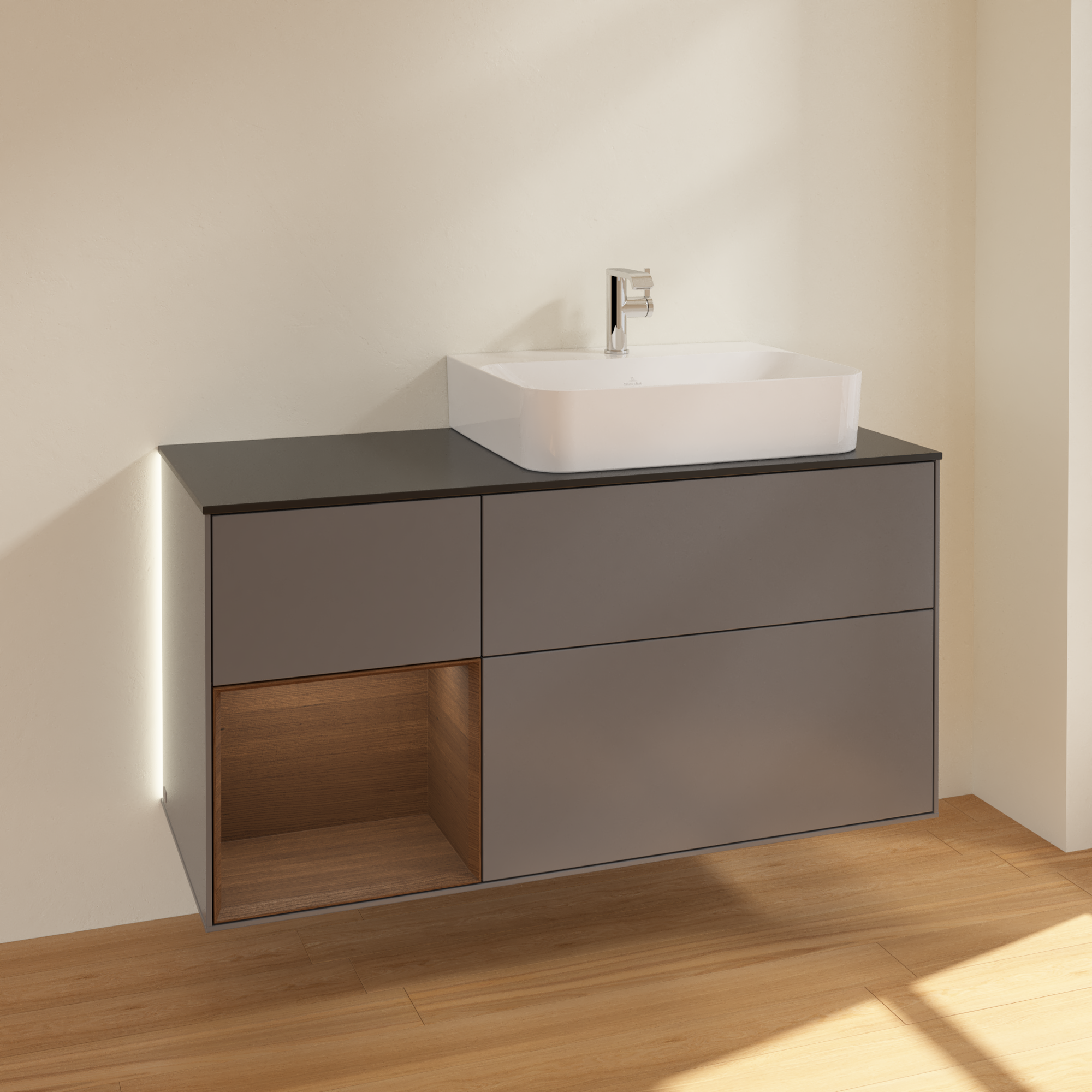 Finion Vanity unit, with lighting, 3 pull-out compartments, 1200x603x501mm, Body: Anthracite Matt Lacquer, Front: Anthracite Matt Lacquer, Shelf: Walnut Veneer, Cover plate: Glass Black Matt