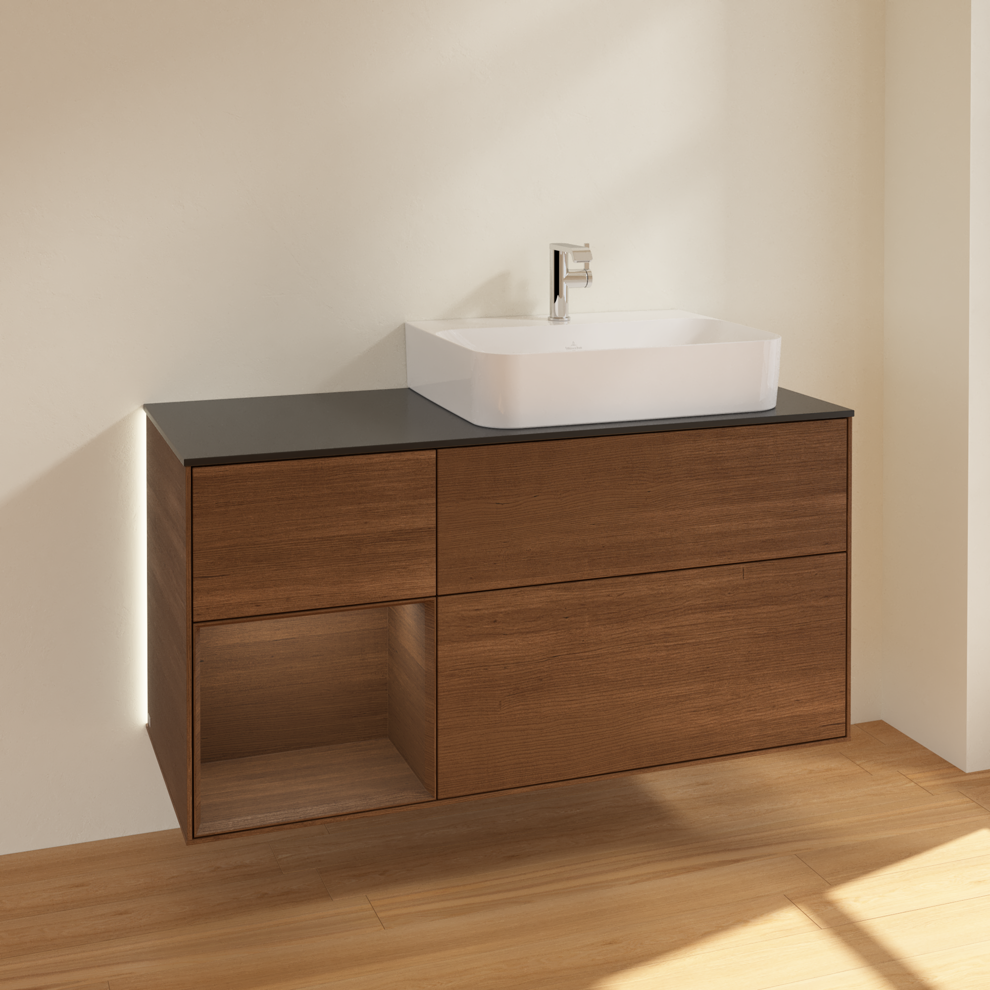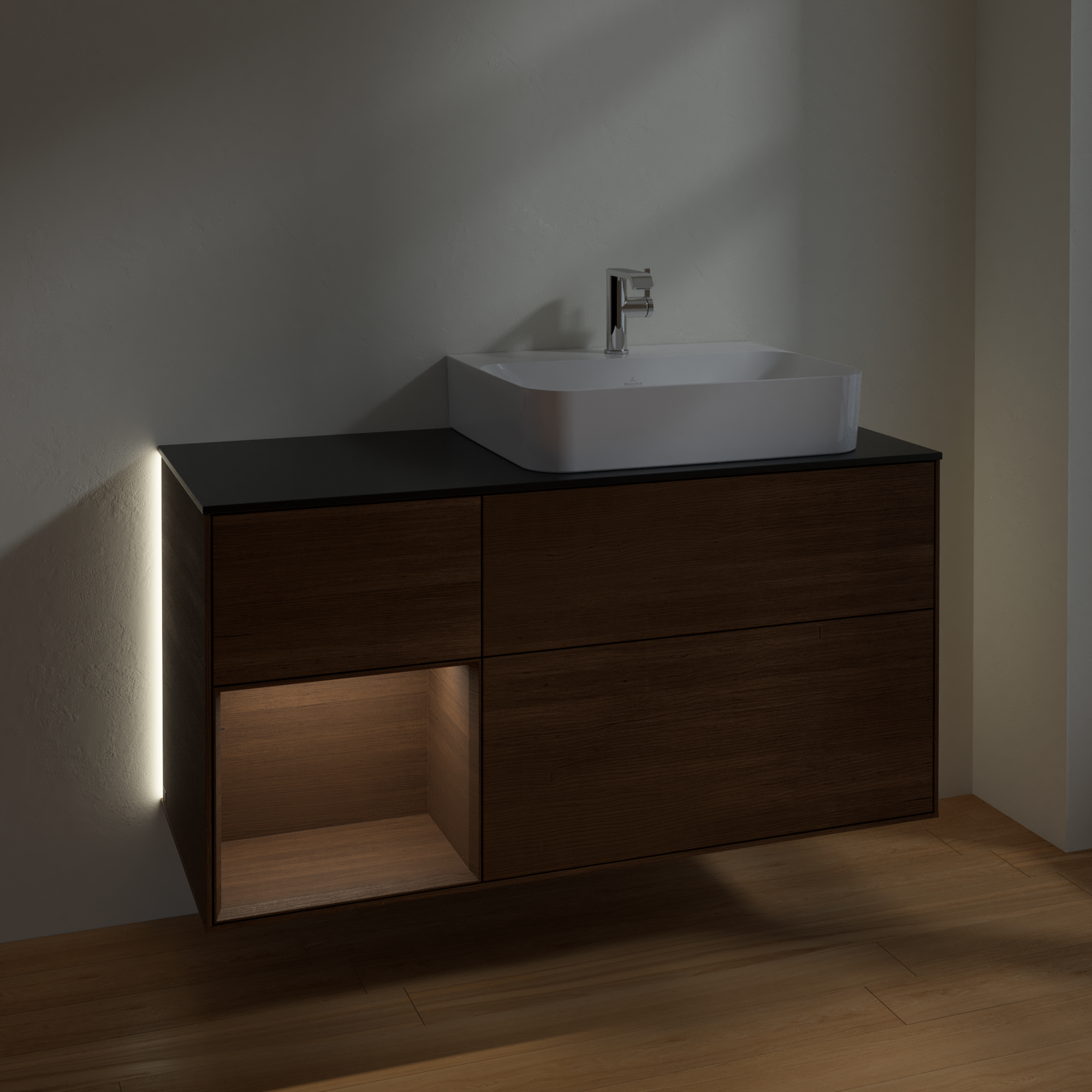 Finion Vanity unit, with lighting, 3 pull-out compartments, 1200x603x501mm, Body: Walnut Veneer, Front: Walnut Veneer, Shelf: Walnut Veneer, Cover plate: Glass Black Matt