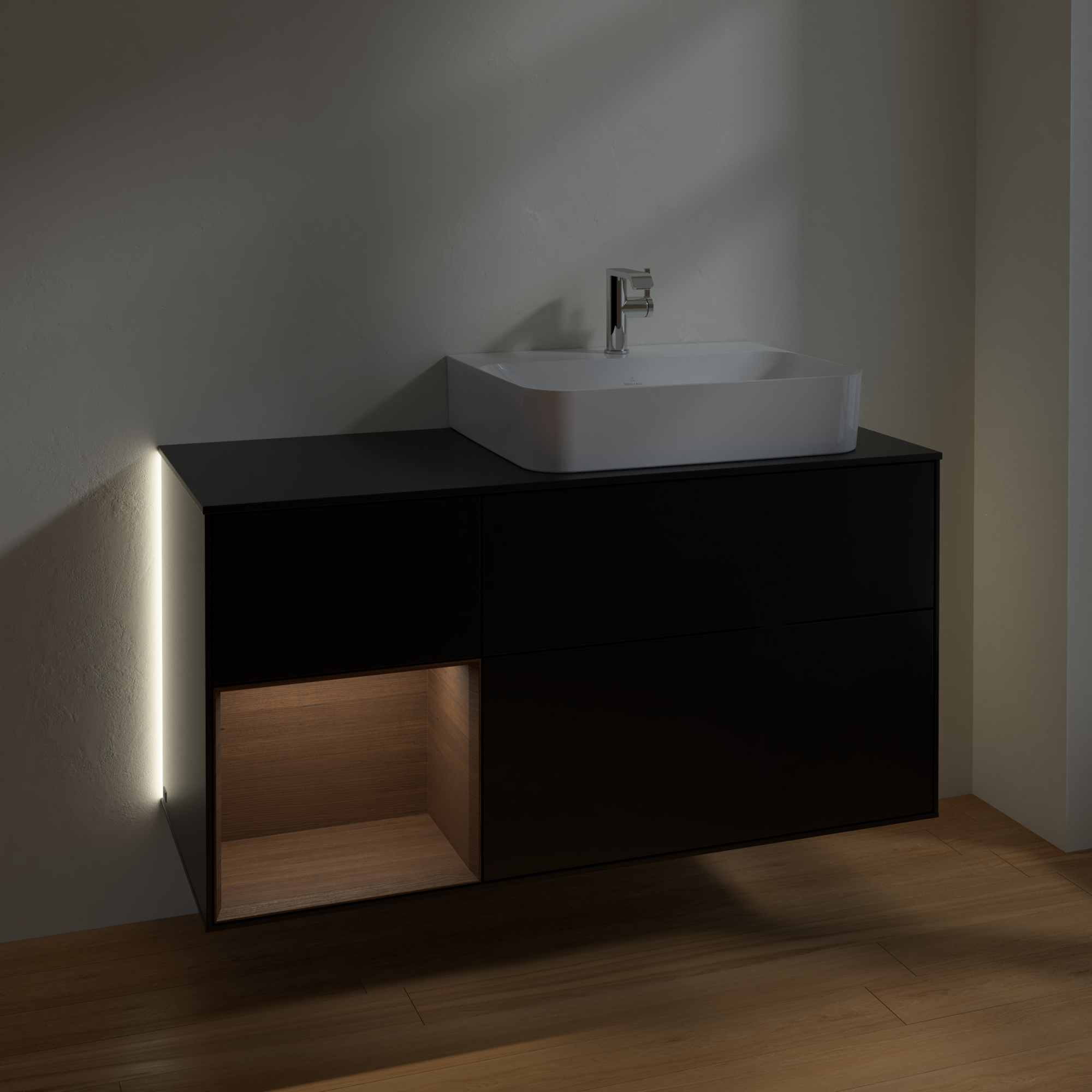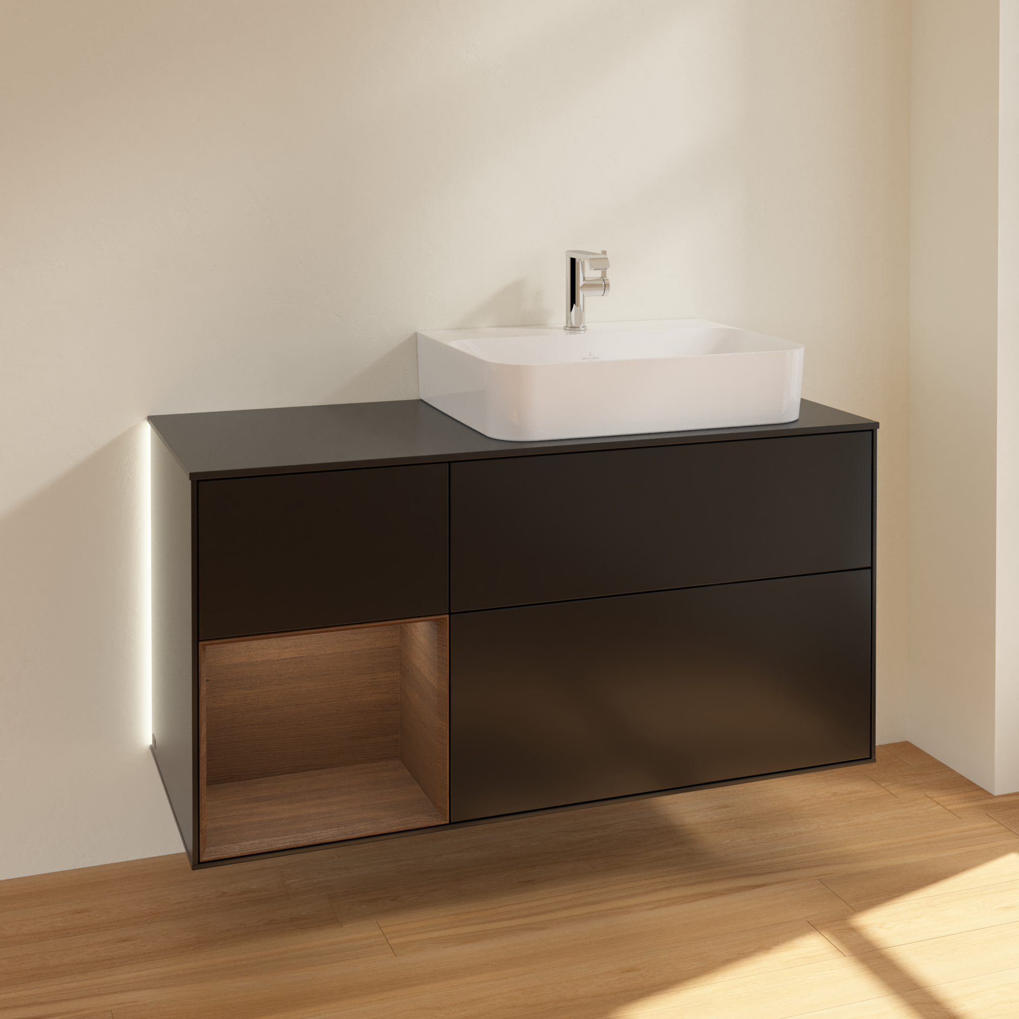 Finion Vanity unit, with lighting, 3 pull-out compartments, 1200x603x501mm, Body: Black Matt Lacquer, Front: Black Matt Lacquer, Shelf: Walnut Veneer, Cover plate: Glass Black Matt