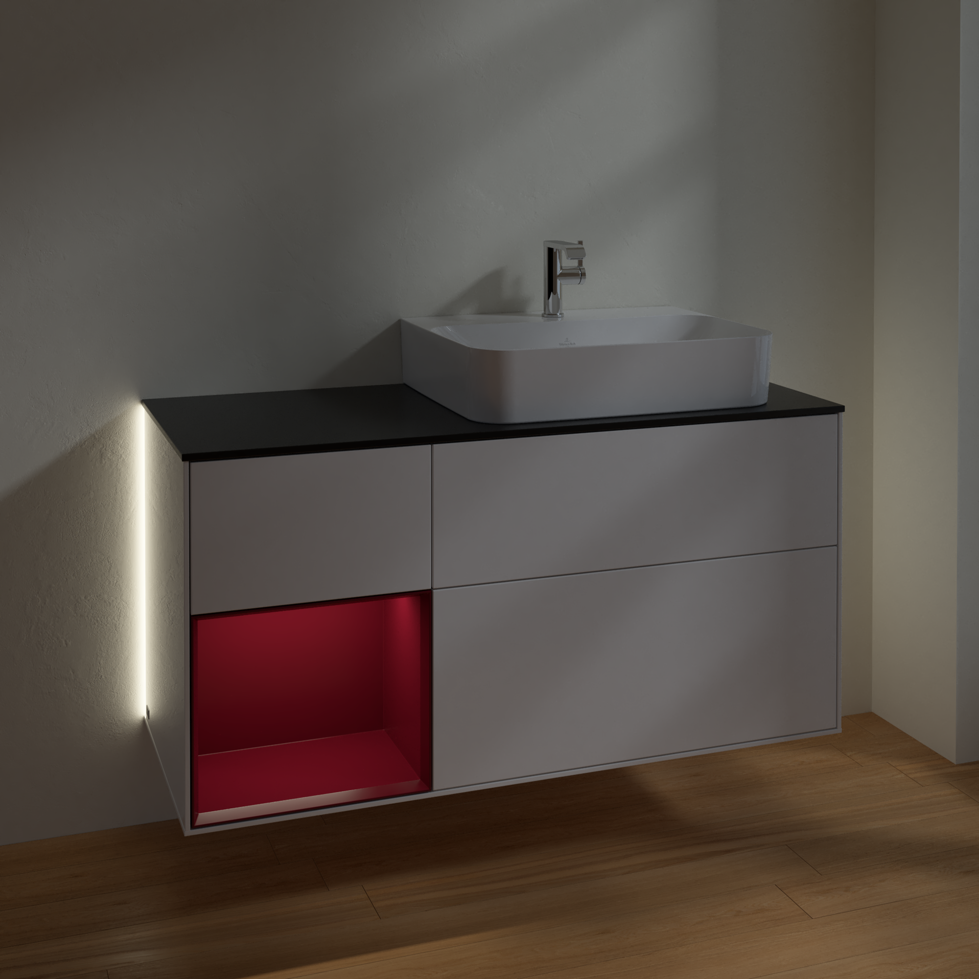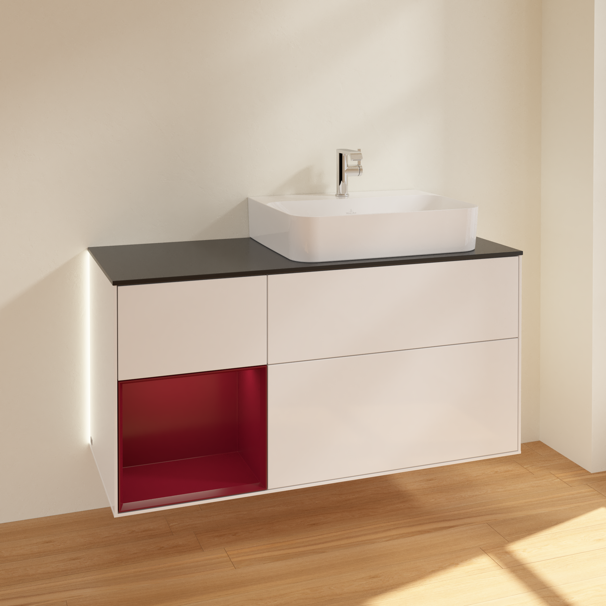 Finion Vanity unit, with lighting, 3 pull-out compartments, 1200x603x501mm, Body: Glossy White Lacquer, Front: Glossy White Lacquer, Shelf: Peony Matt Lacquer, Cover plate: Glass Black Matt