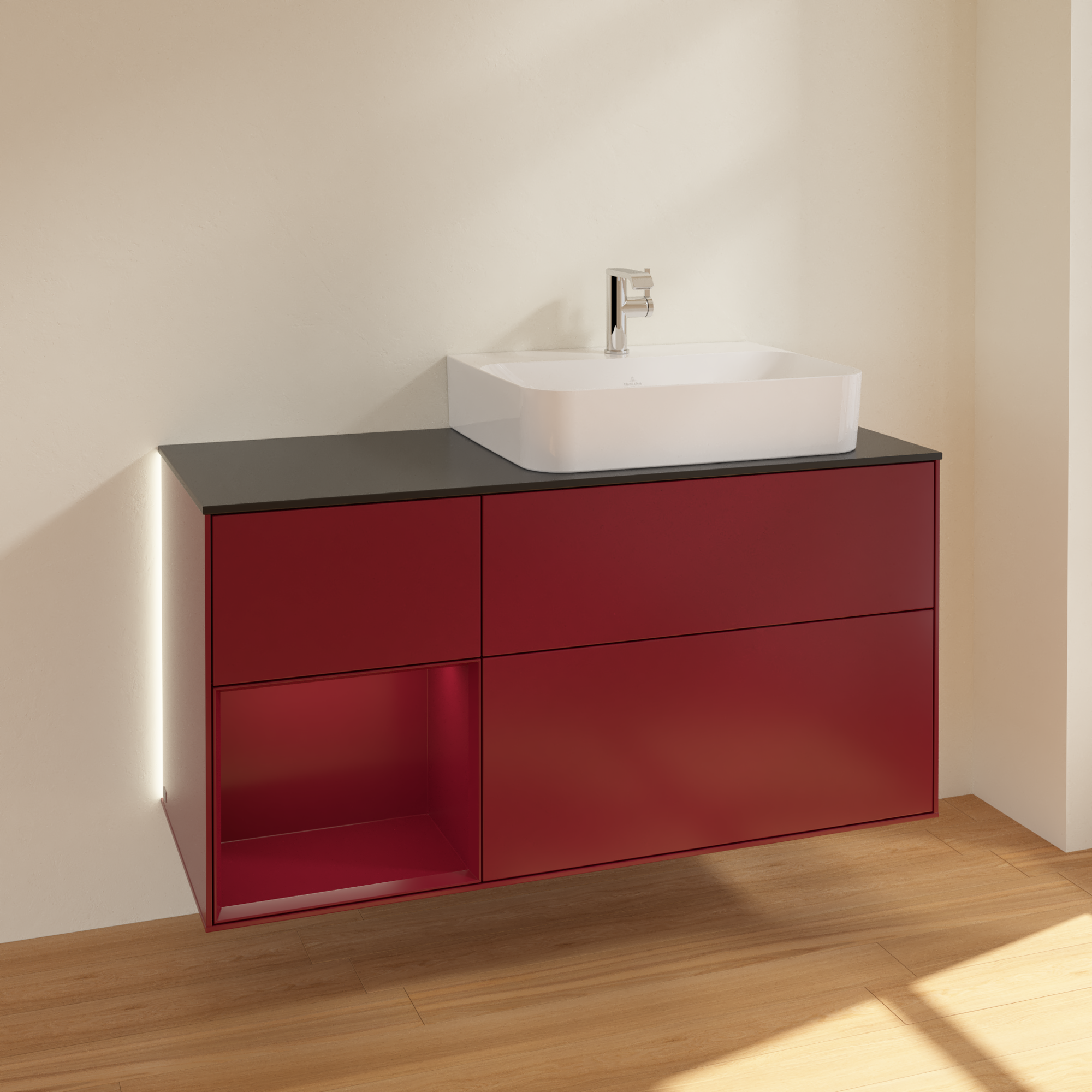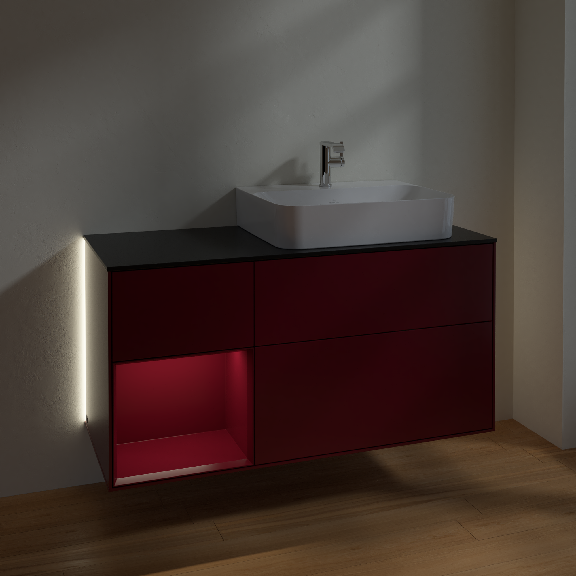 Finion Vanity unit, with lighting, 3 pull-out compartments, 1200x603x501mm, Body: Peony Matt Lacquer, Front: Peony Matt Lacquer, Shelf: Peony Matt Lacquer, Cover plate: Glass Black Matt