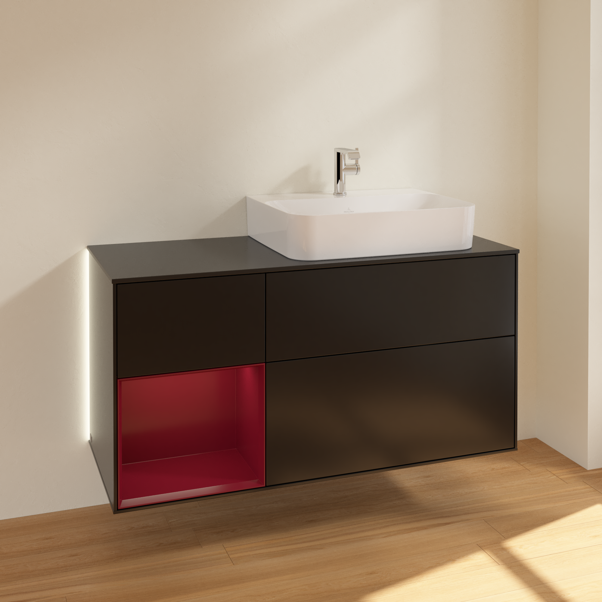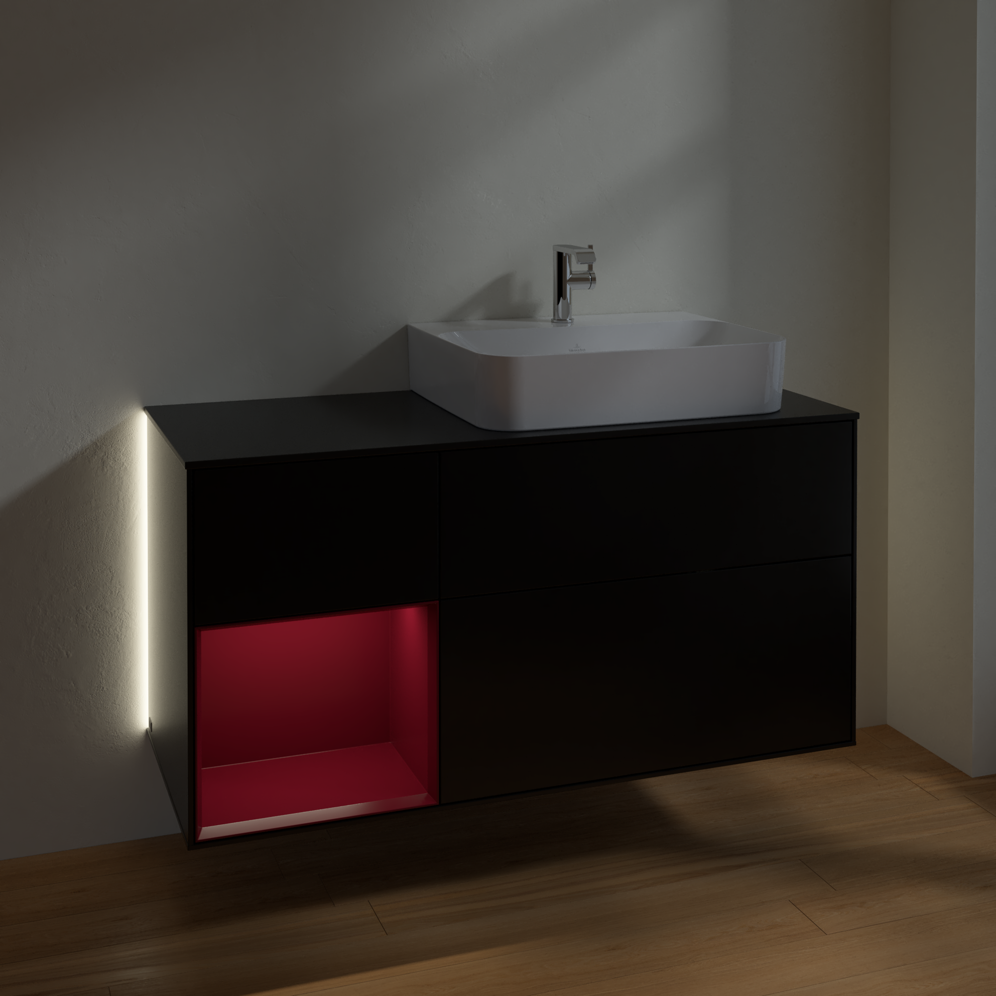 Finion Vanity unit, with lighting, 3 pull-out compartments, 1200x603x501mm, Body: Black Matt Lacquer, Front: Black Matt Lacquer, Shelf: Peony Matt Lacquer, Cover plate: Glass Black Matt