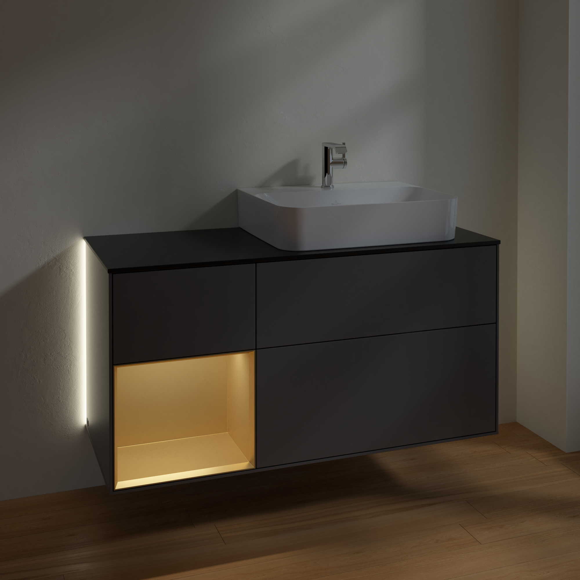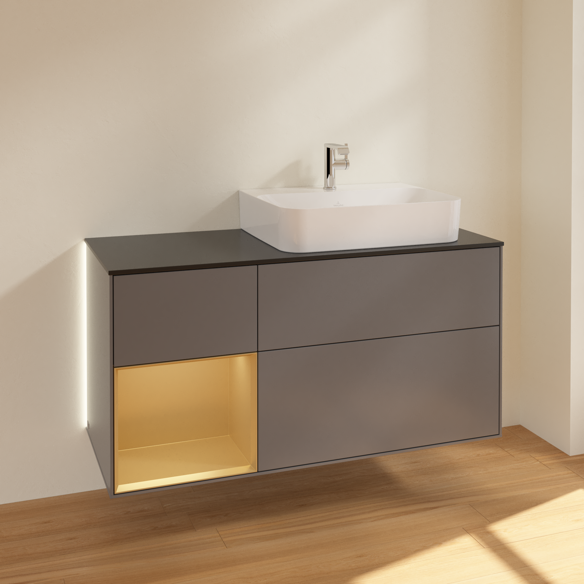 Finion Vanity unit, with lighting, 3 pull-out compartments, 1200x603x501mm, Body: Anthracite Matt Lacquer, Front: Anthracite Matt Lacquer, Shelf: Gold Matt Lacquer, Cover plate: Glass Black Matt