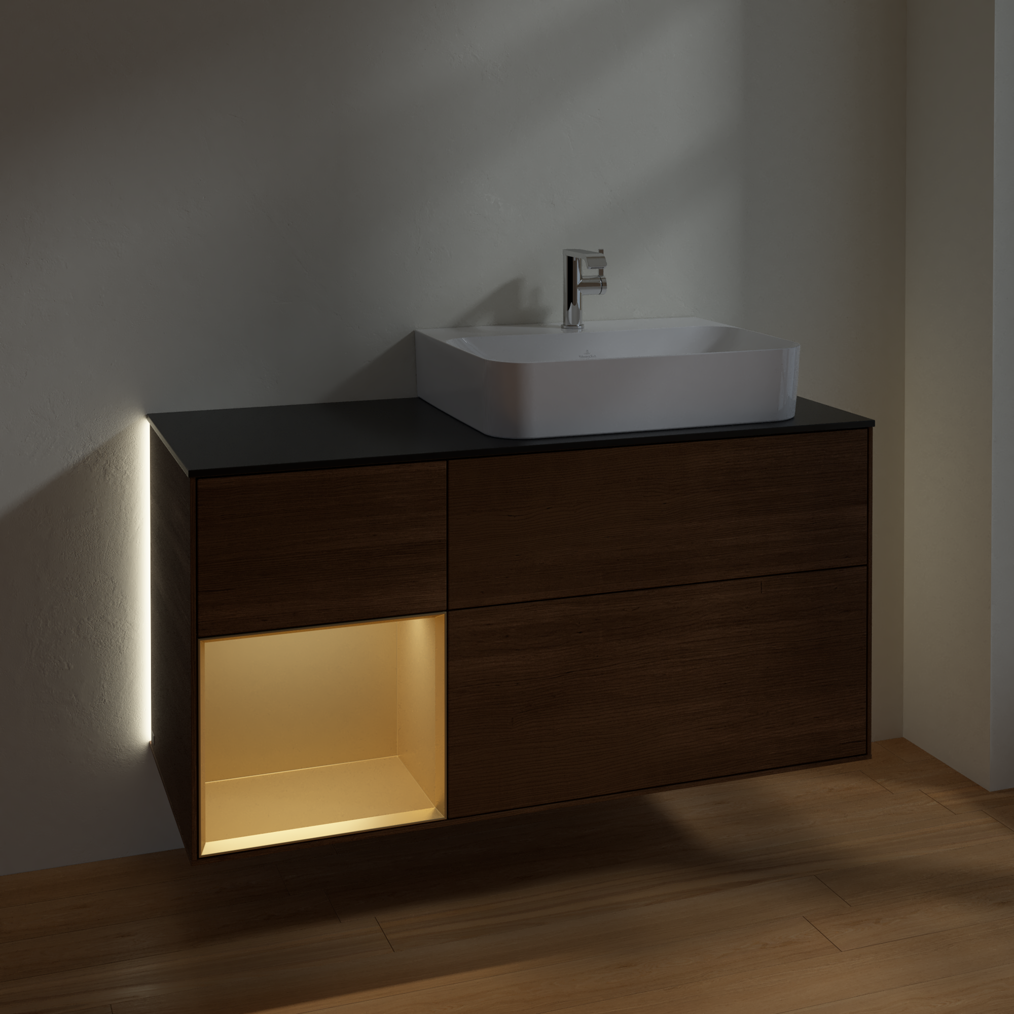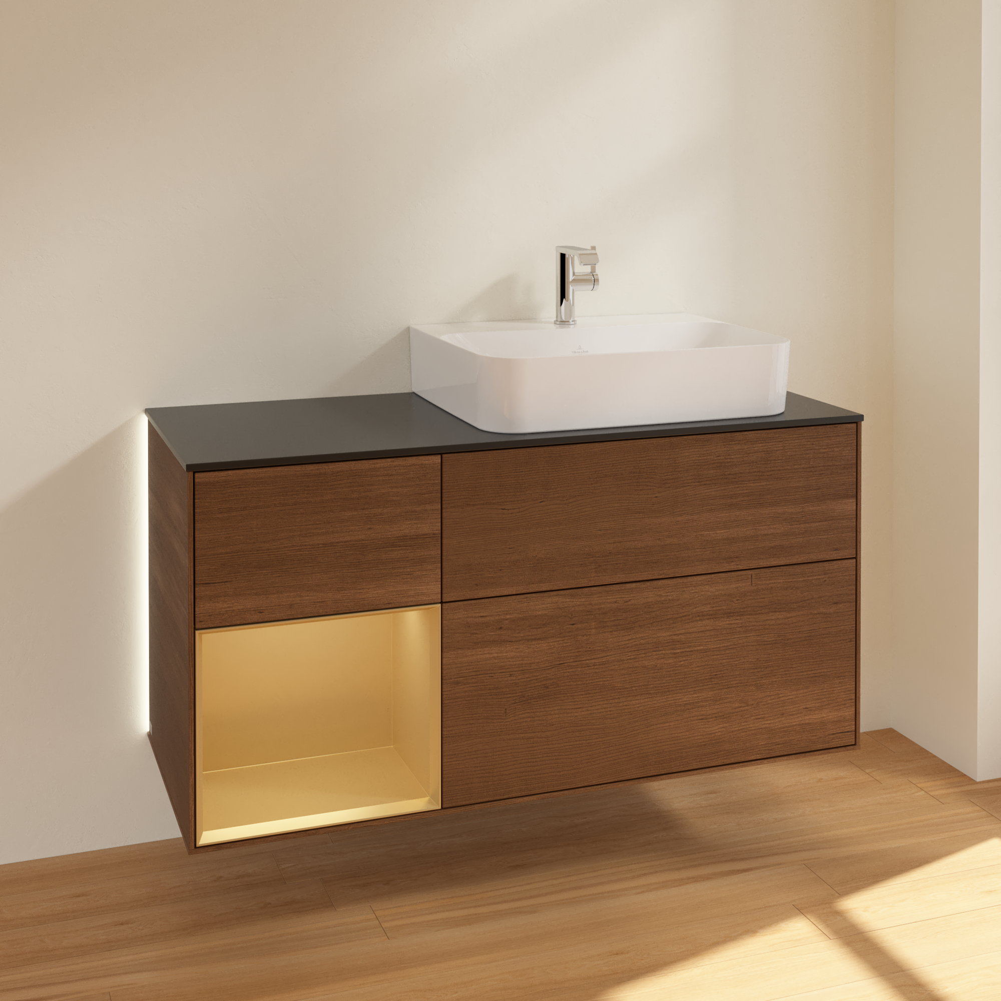 Finion Vanity unit, with lighting, 3 pull-out compartments, 1200x603x501mm, Body: Walnut Veneer, Front: Walnut Veneer, Shelf: Gold Matt Lacquer, Cover plate: Glass Black Matt