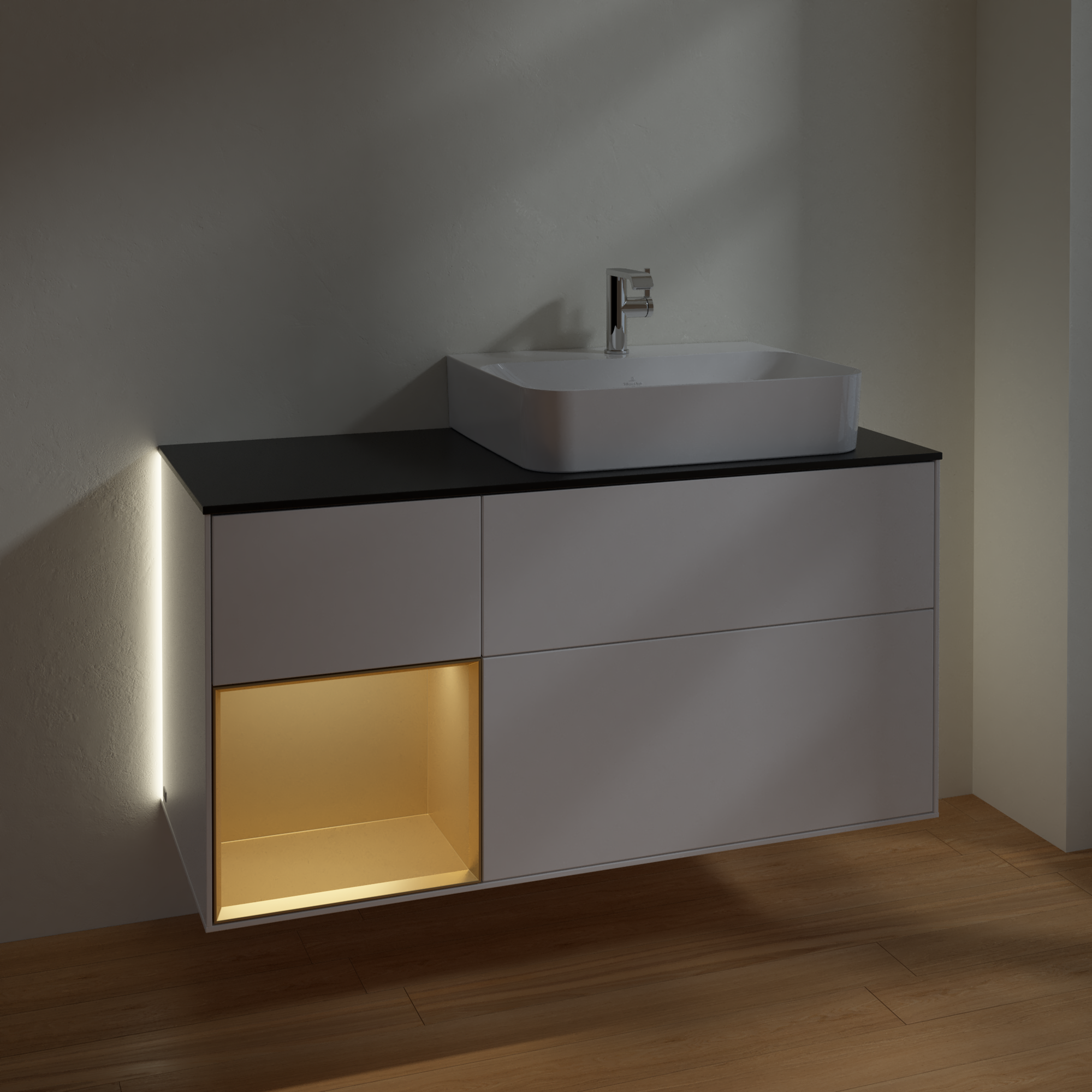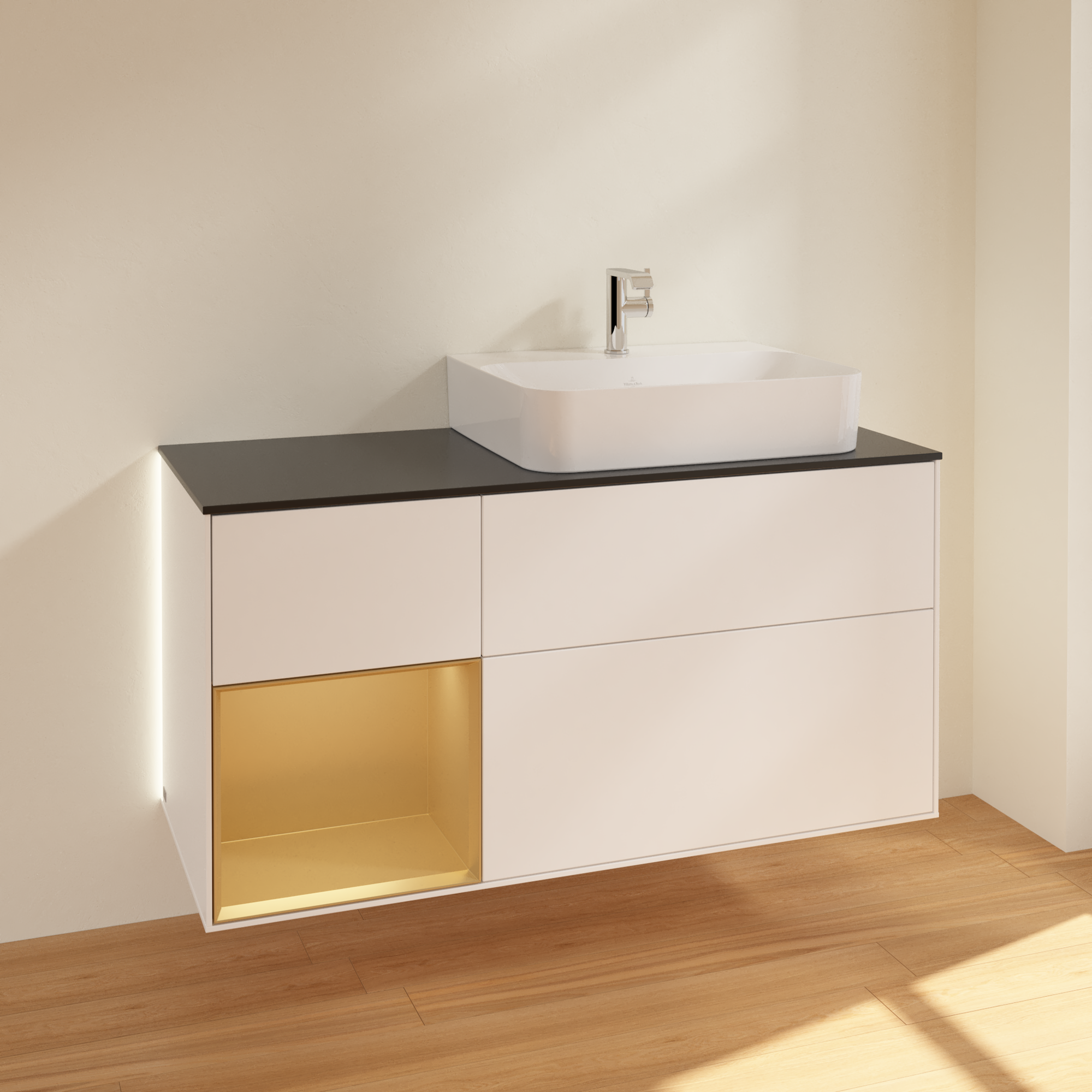 Finion Vanity unit, with lighting, 3 pull-out compartments, 1200x603x501mm, Body: White Matt Lacquer, Front: White Matt Lacquer, Shelf: Gold Matt Lacquer, Cover plate: Glass Black Matt