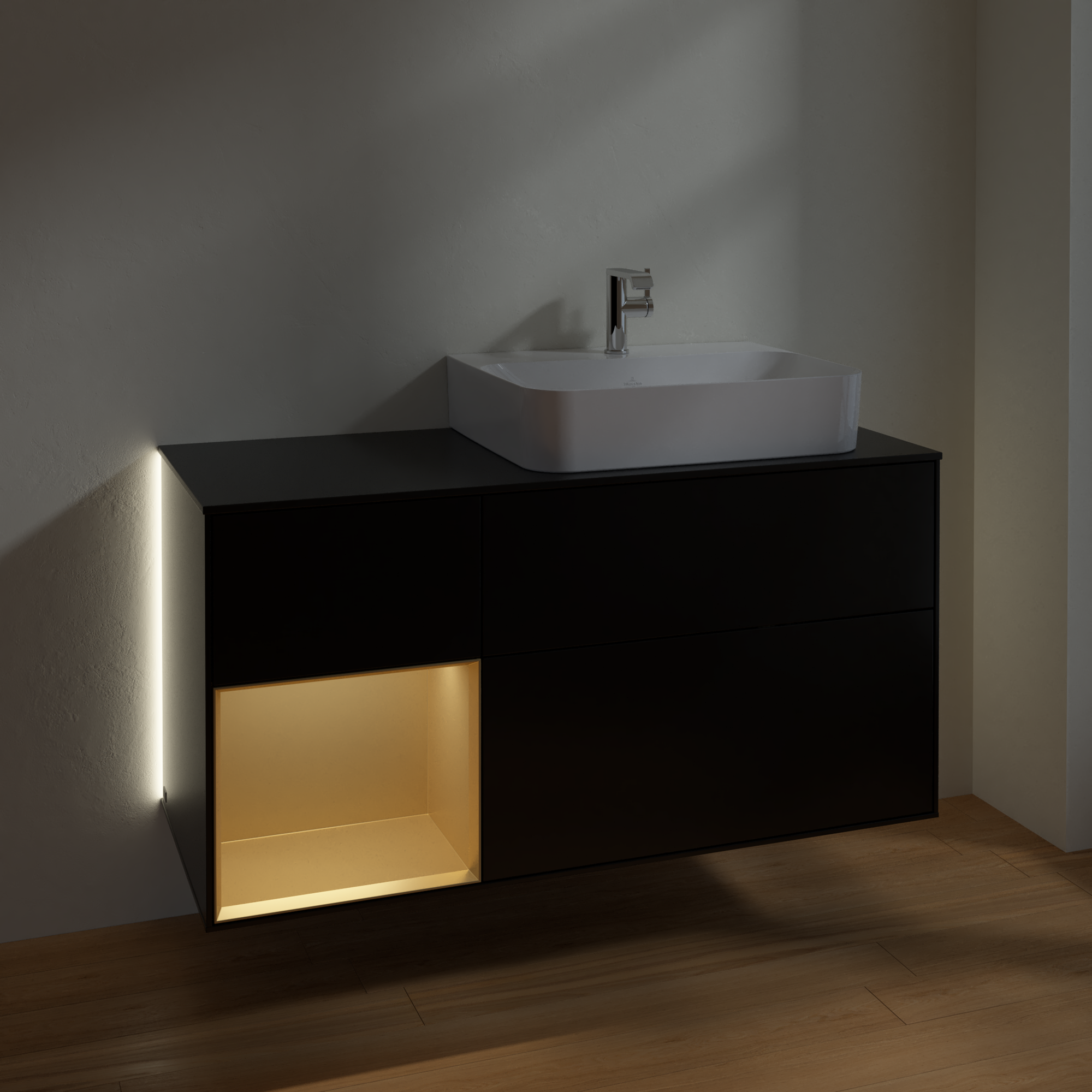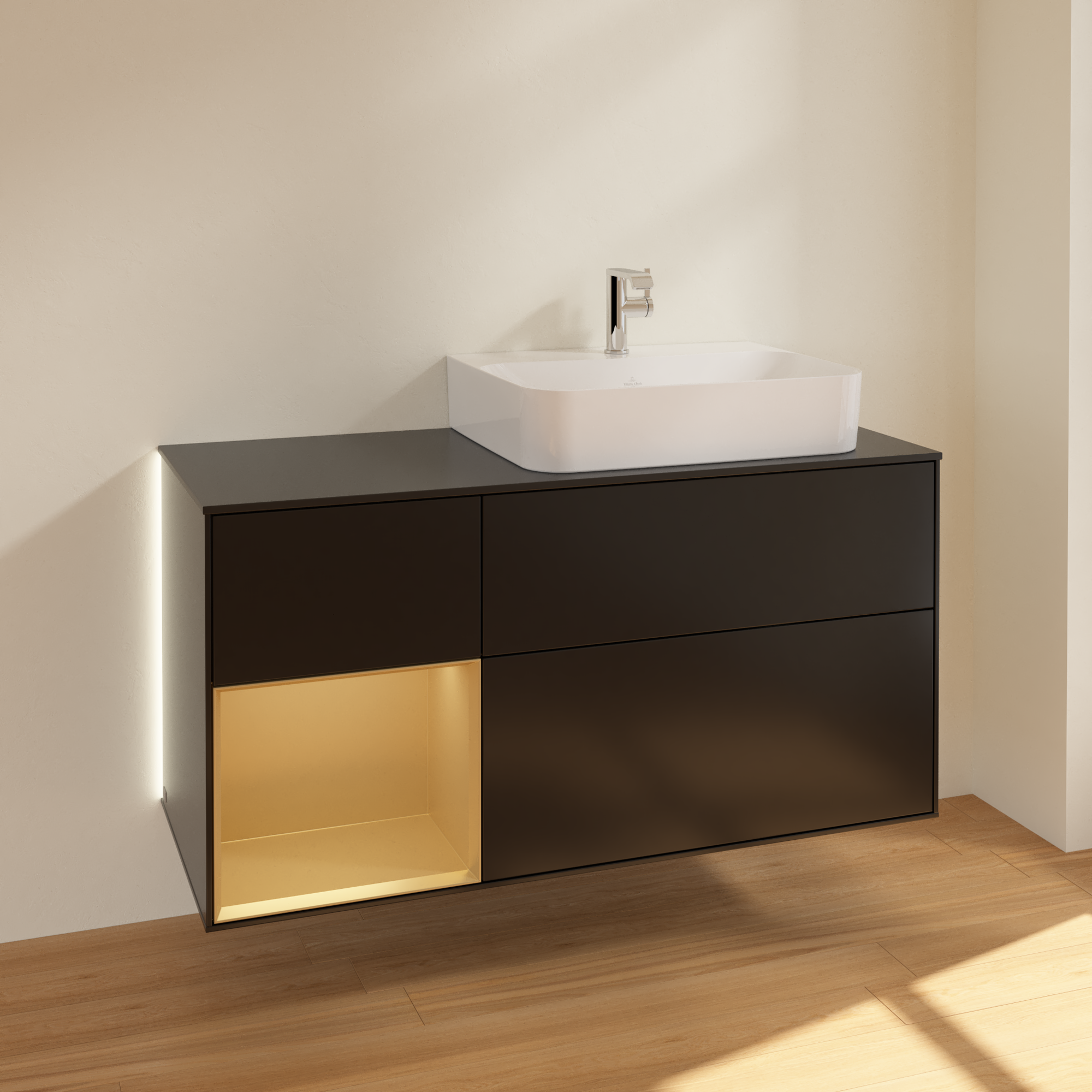 Finion Vanity unit, with lighting, 3 pull-out compartments, 1200x603x501mm, Body: Black Matt Lacquer, Front: Black Matt Lacquer, Shelf: Gold Matt Lacquer, Cover plate: Glass Black Matt
