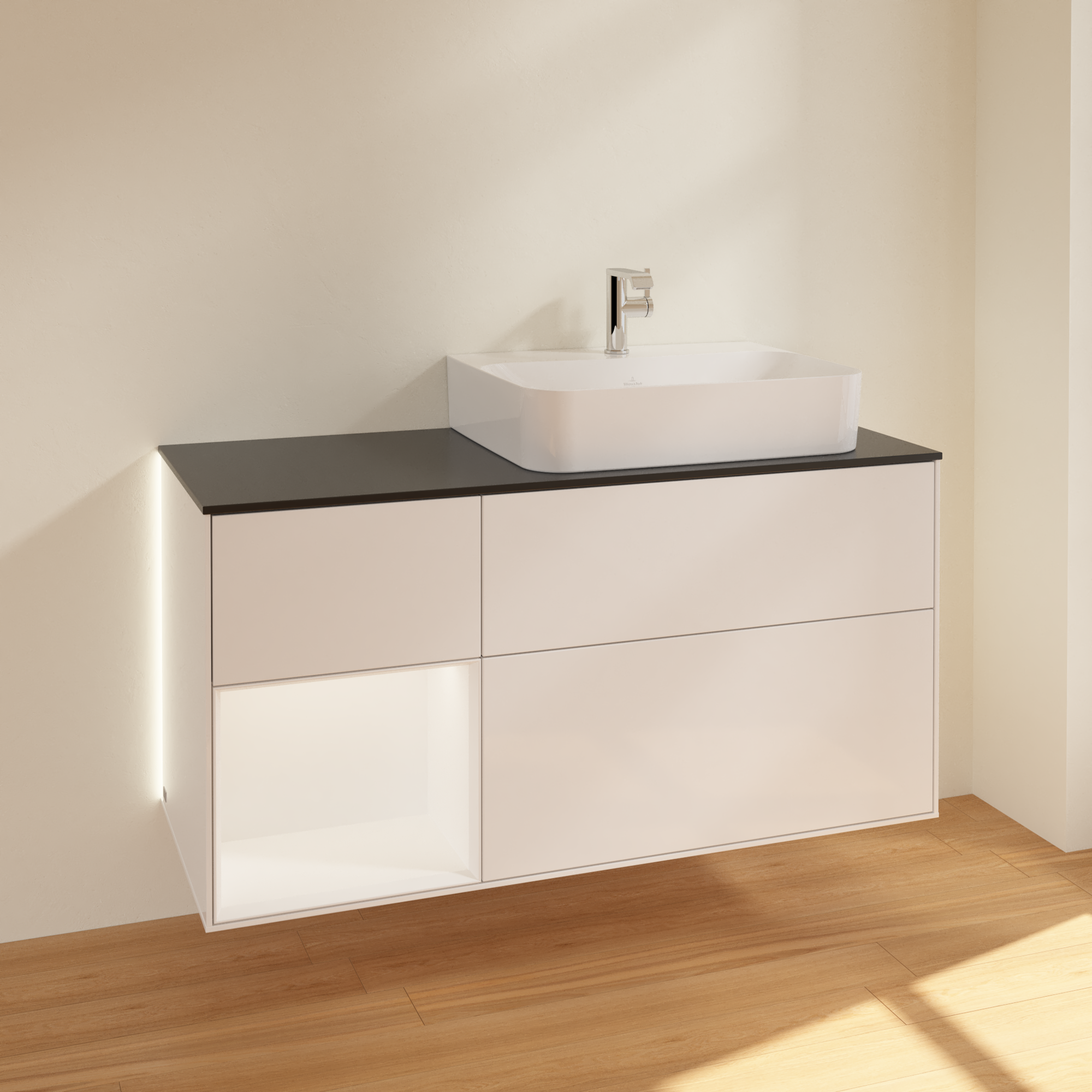 Finion Vanity unit, with lighting, 3 pull-out compartments, 1200x603x501mm, Body: Glossy White Lacquer, Front: Glossy White Lacquer, Shelf: White Matt Lacquer, Cover plate: Glass Black Matt