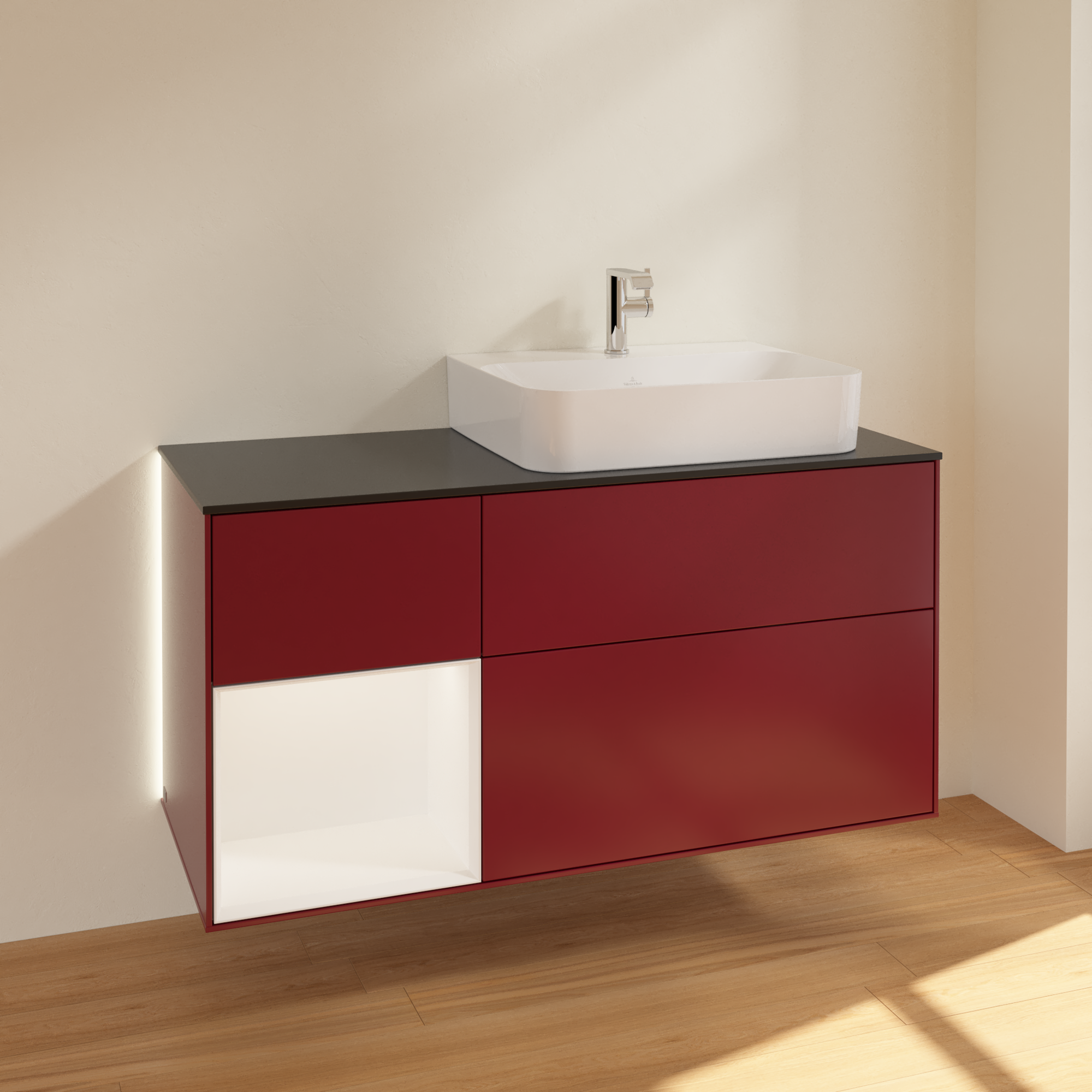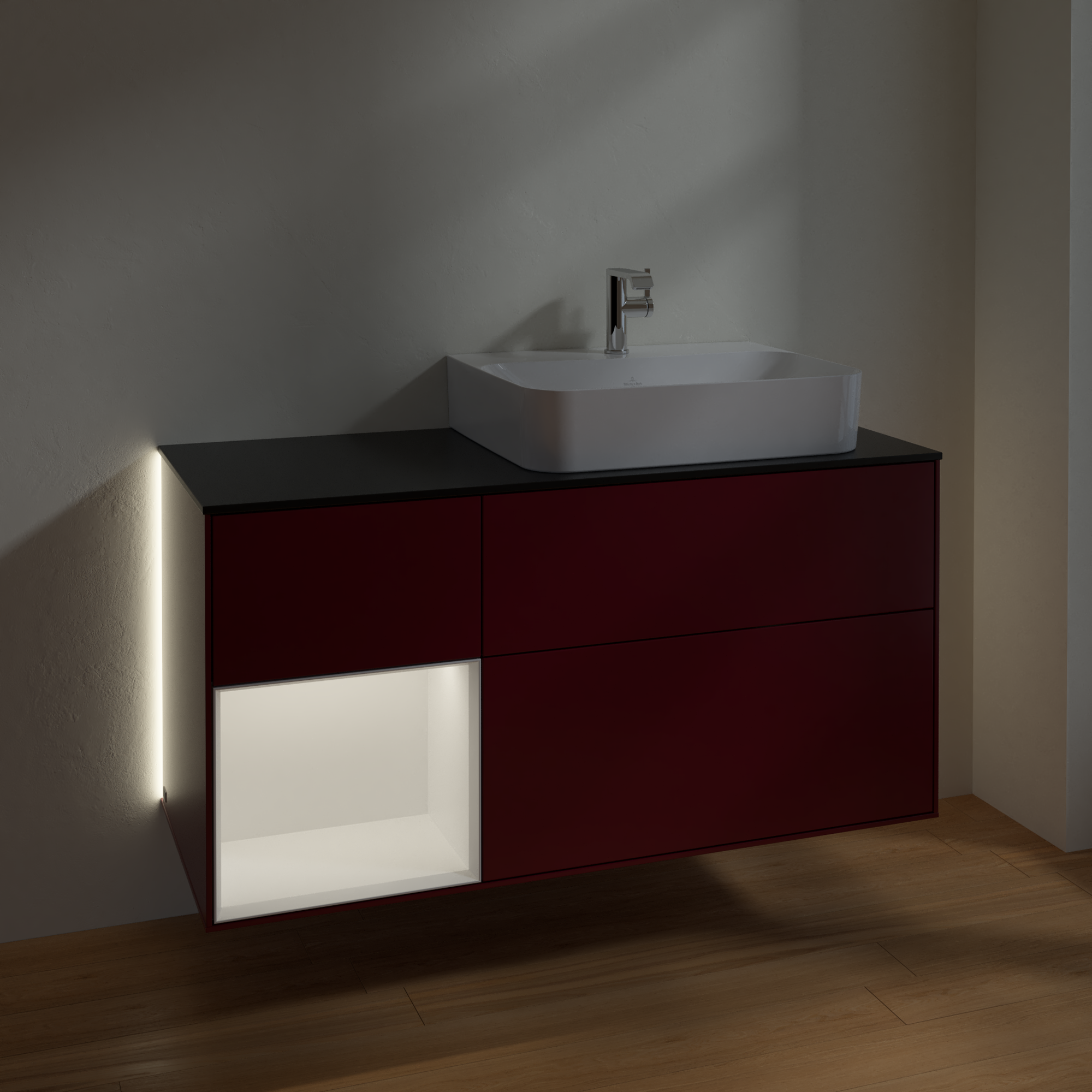 Finion Vanity unit, with lighting, 3 pull-out compartments, 1200x603x501mm, Body: Peony Matt Lacquer, Front: Peony Matt Lacquer, Shelf: White Matt Lacquer, Cover plate: Glass Black Matt