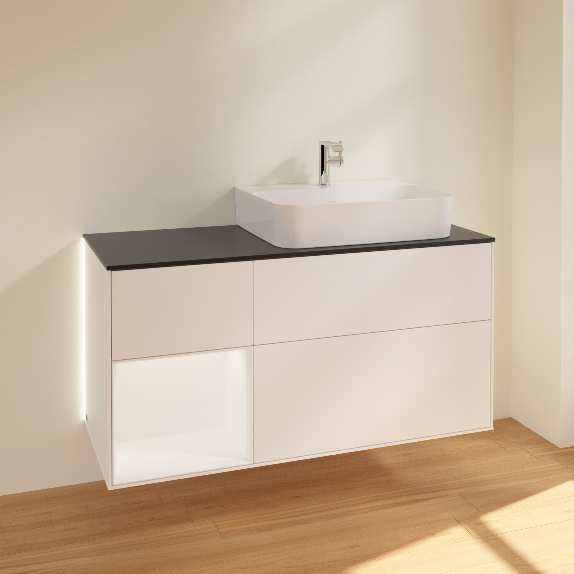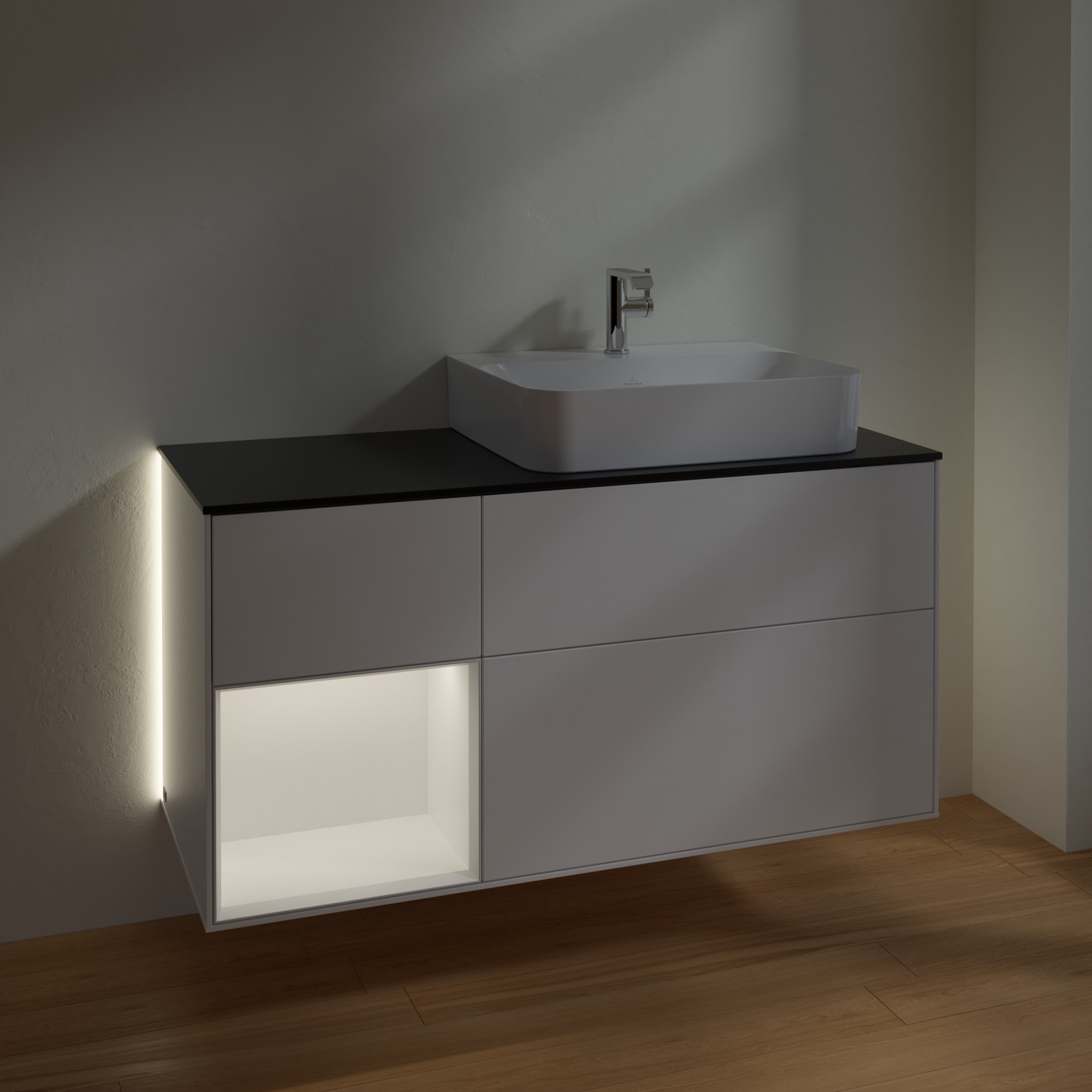 Finion Vanity unit, with lighting, 3 pull-out compartments, 1200x603x501mm, Body: White Matt Lacquer, Front: White Matt Lacquer, Shelf: White Matt Lacquer, Cover plate: Glass Black Matt