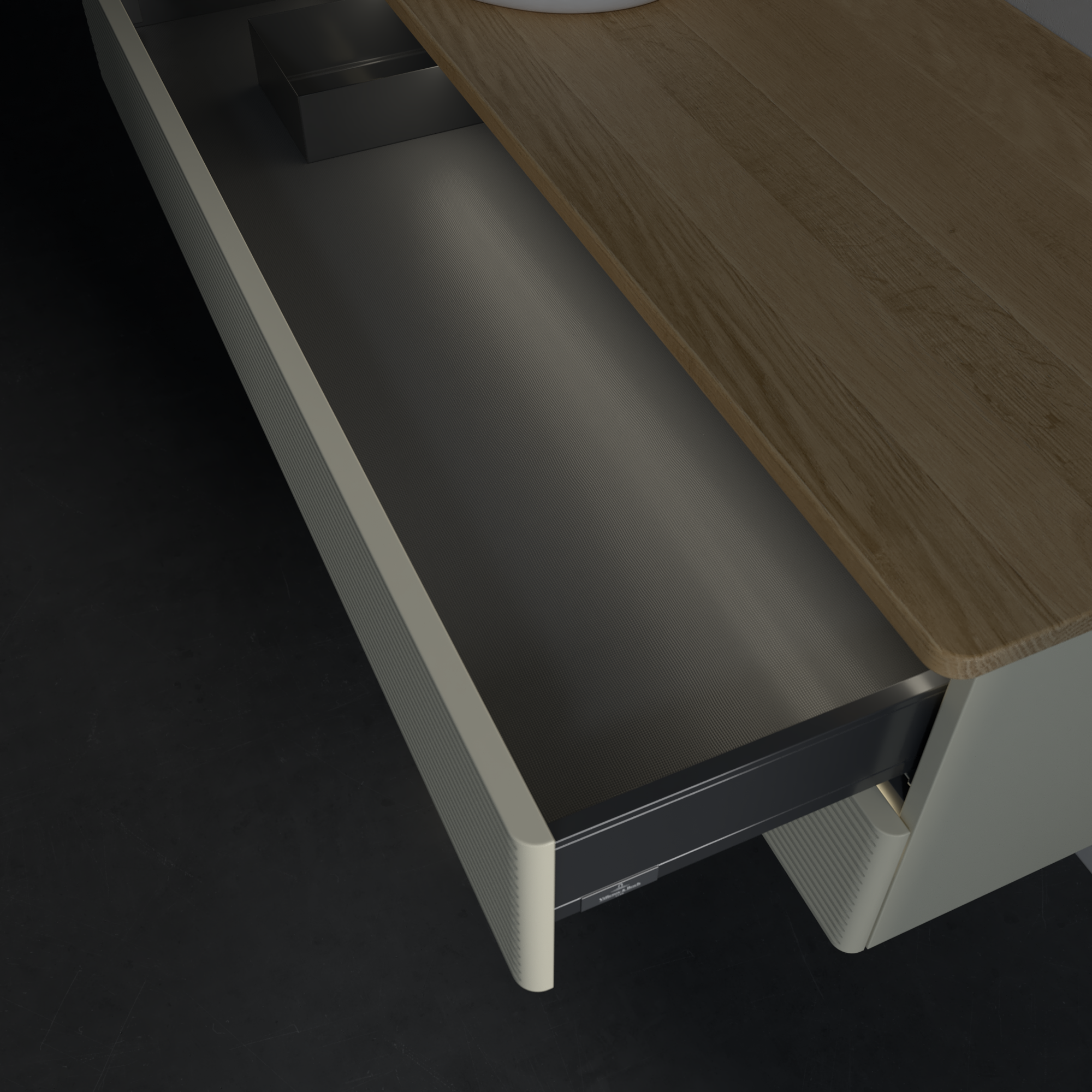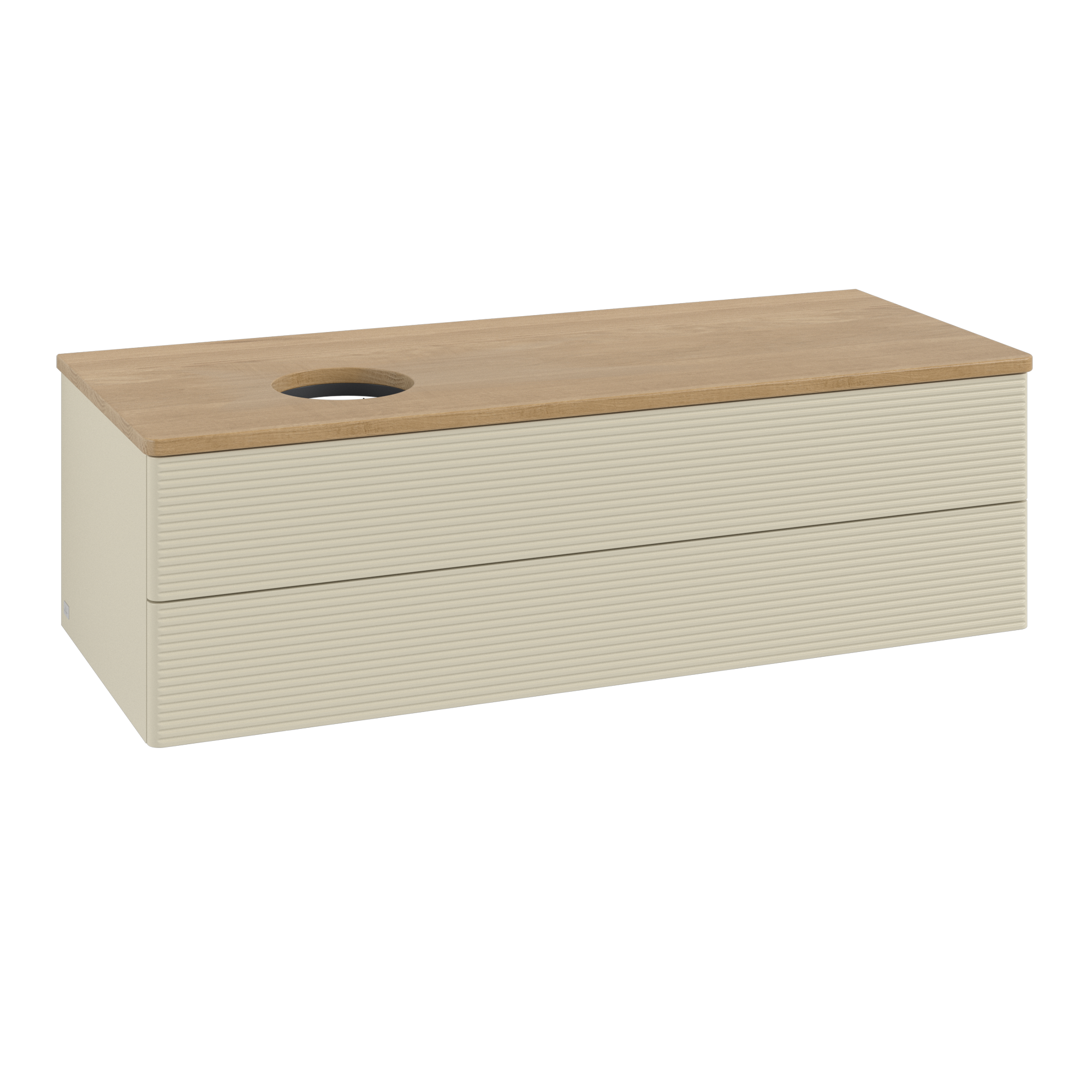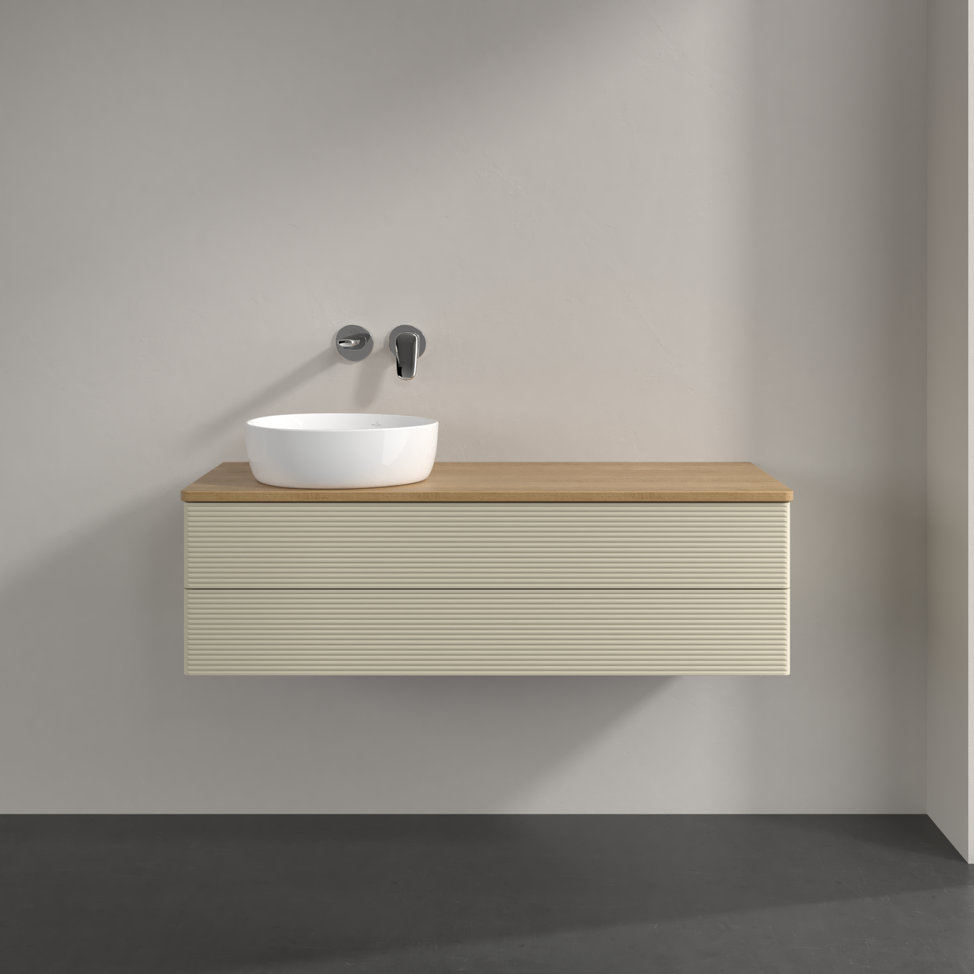 Antao Modulo bajo, con iluminación, 2 compartimentos extraíbles, 1200x360x500mm, Frontal con textura granulosa, Cuerpo: Silk Grey Matt Lacquer, Frontal: Silk Grey Matt Lacquer, Placa de cubierta: Honey Oak