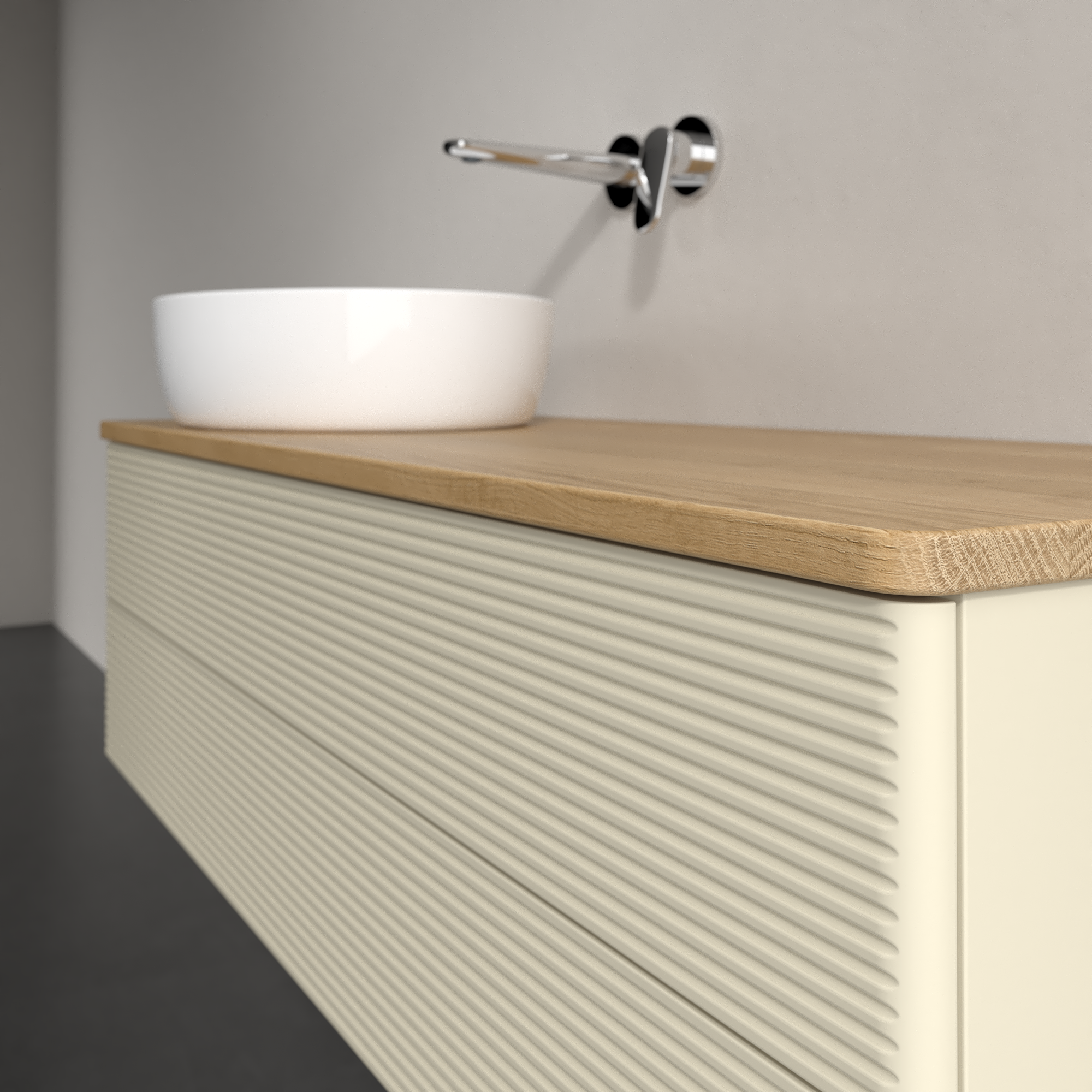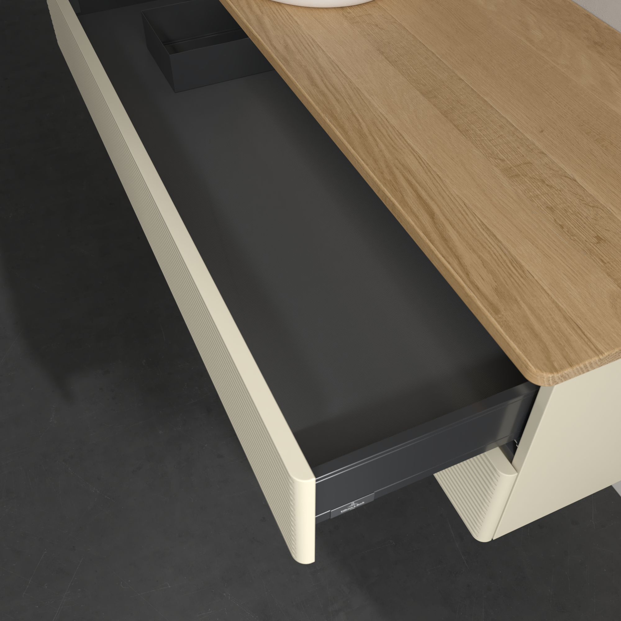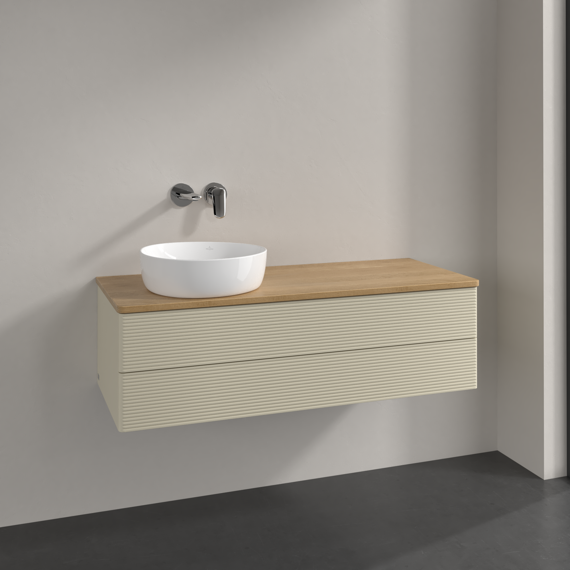 Antao Modulo bajo, con iluminación, 2 compartimentos extraíbles, 1200x360x500mm, Frontal con textura granulosa, Cuerpo: Silk Grey Matt Lacquer, Frontal: Silk Grey Matt Lacquer, Placa de cubierta: Honey Oak