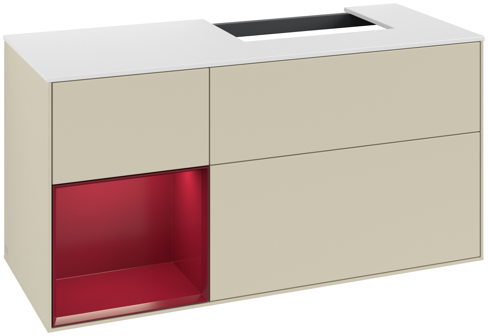 Finion Modulo bajo, con iluminación, 3 compartimentos extraíbles, 1200x603x501mm, Cuerpo: Silk Grey Matt Lacquer, Frontal: Silk Grey Matt Lacquer, Estante: Peony Matt Lacquer, Placa de cubierta: Glass White Matt