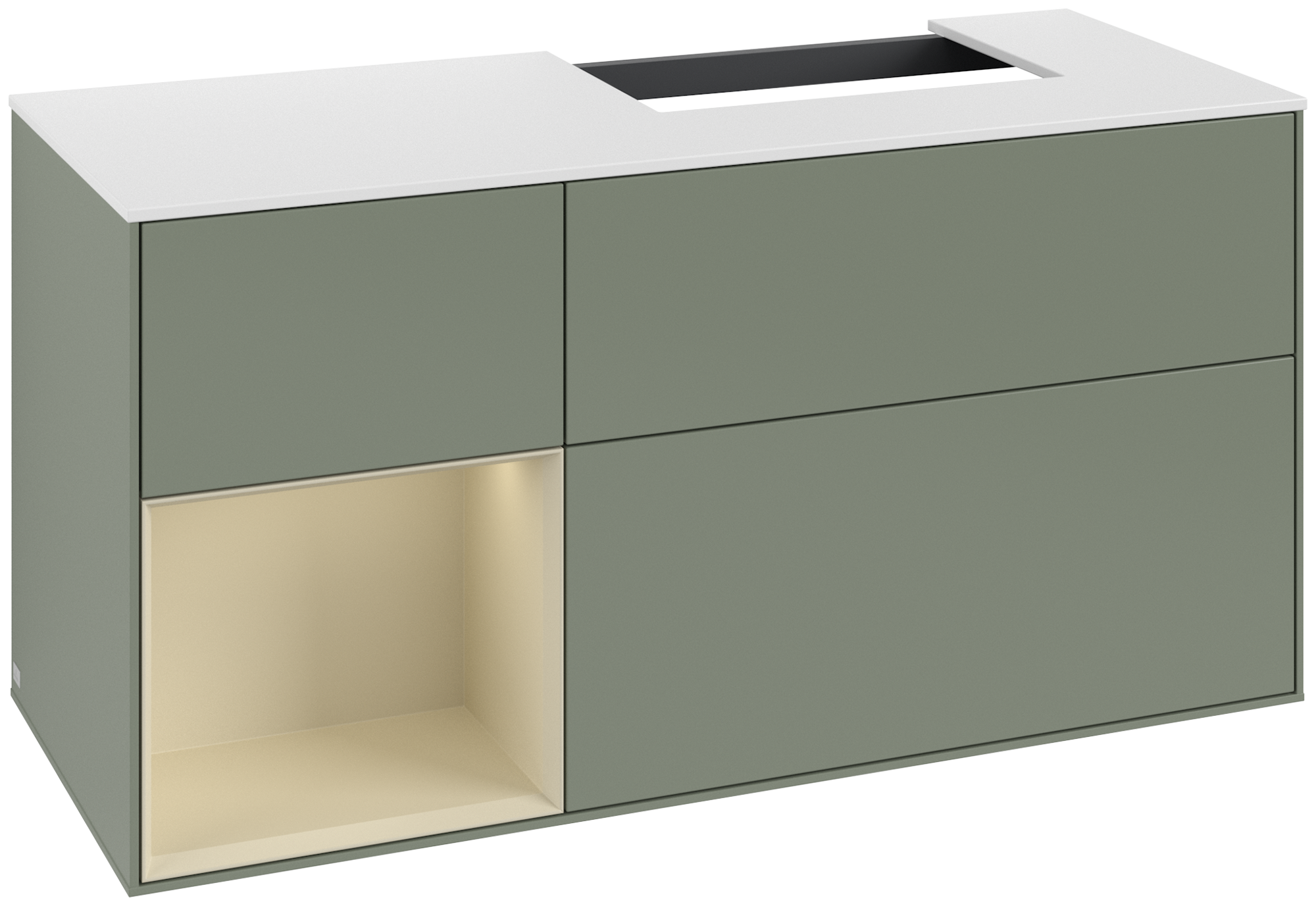 Finion Modulo bajo, con iluminación, 3 compartimentos extraíbles, 1200x603x501mm, Cuerpo: Olive Matt Lacquer, Frontal: Olive Matt Lacquer, Estante: Silk Grey Matt Lacquer, Placa de cubierta: Glass White Matt