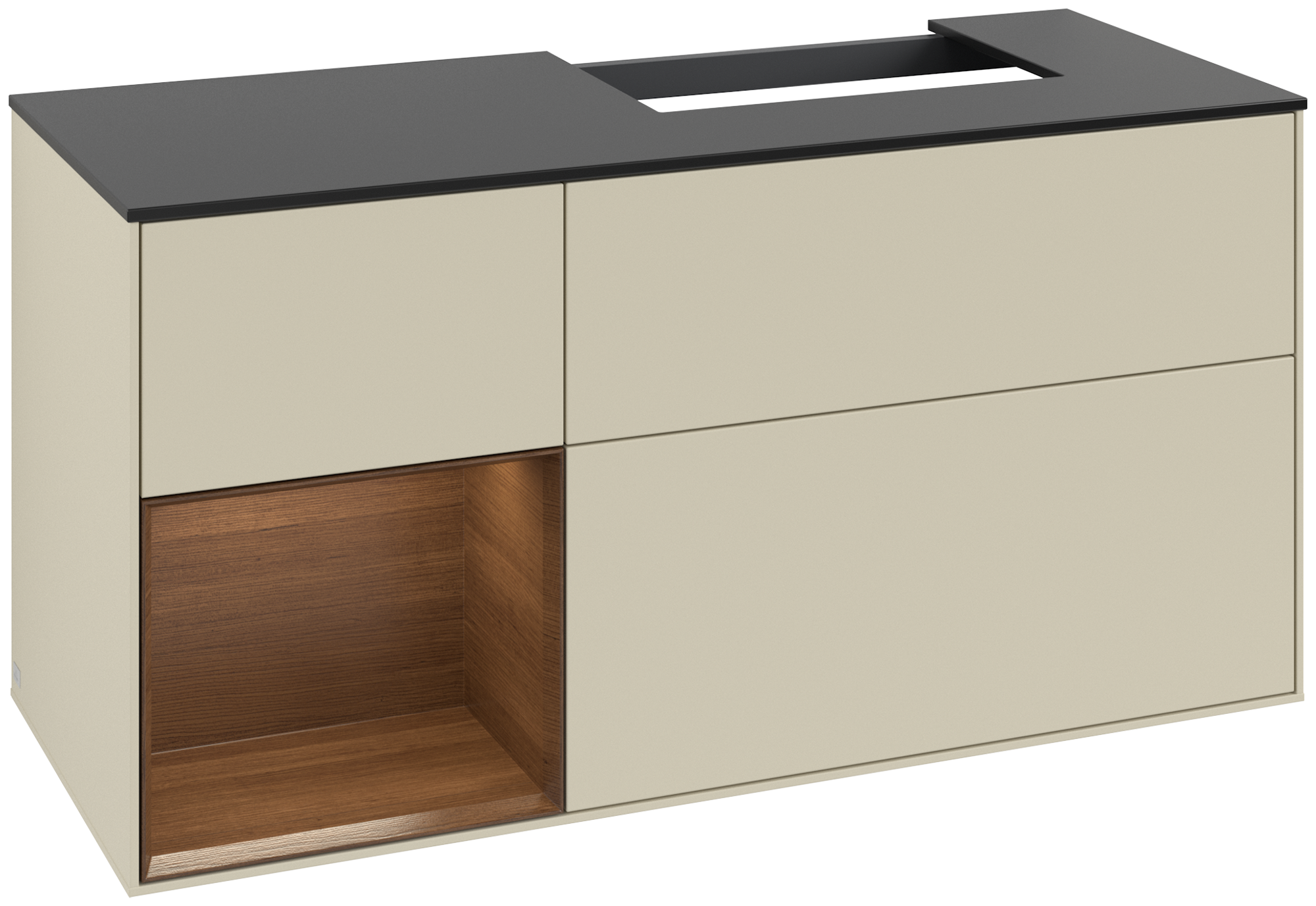 Finion Modulo bajo, con iluminación, 3 compartimentos extraíbles, 1200x603x501mm, Cuerpo: Silk Grey Matt Lacquer, Frontal: Silk Grey Matt Lacquer, Estante: Walnut Veneer, Placa de cubierta: Glass Black Matt